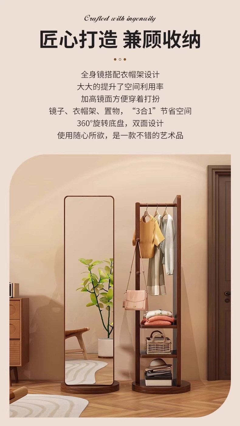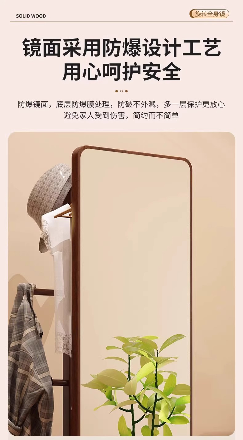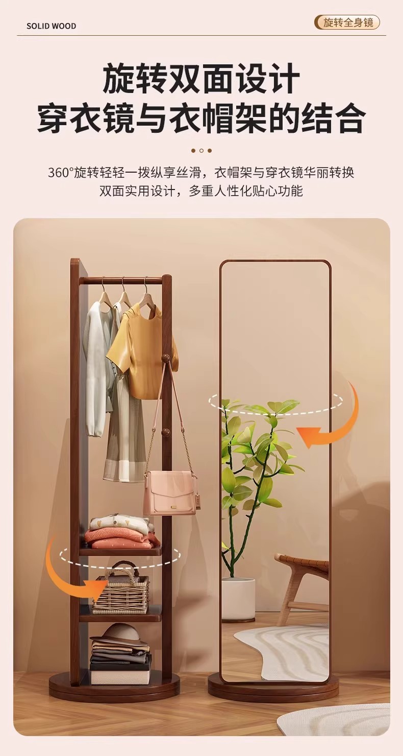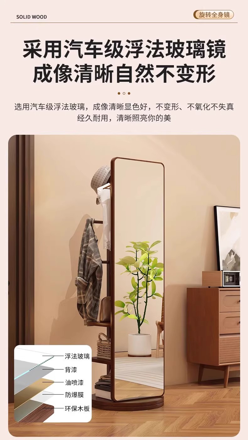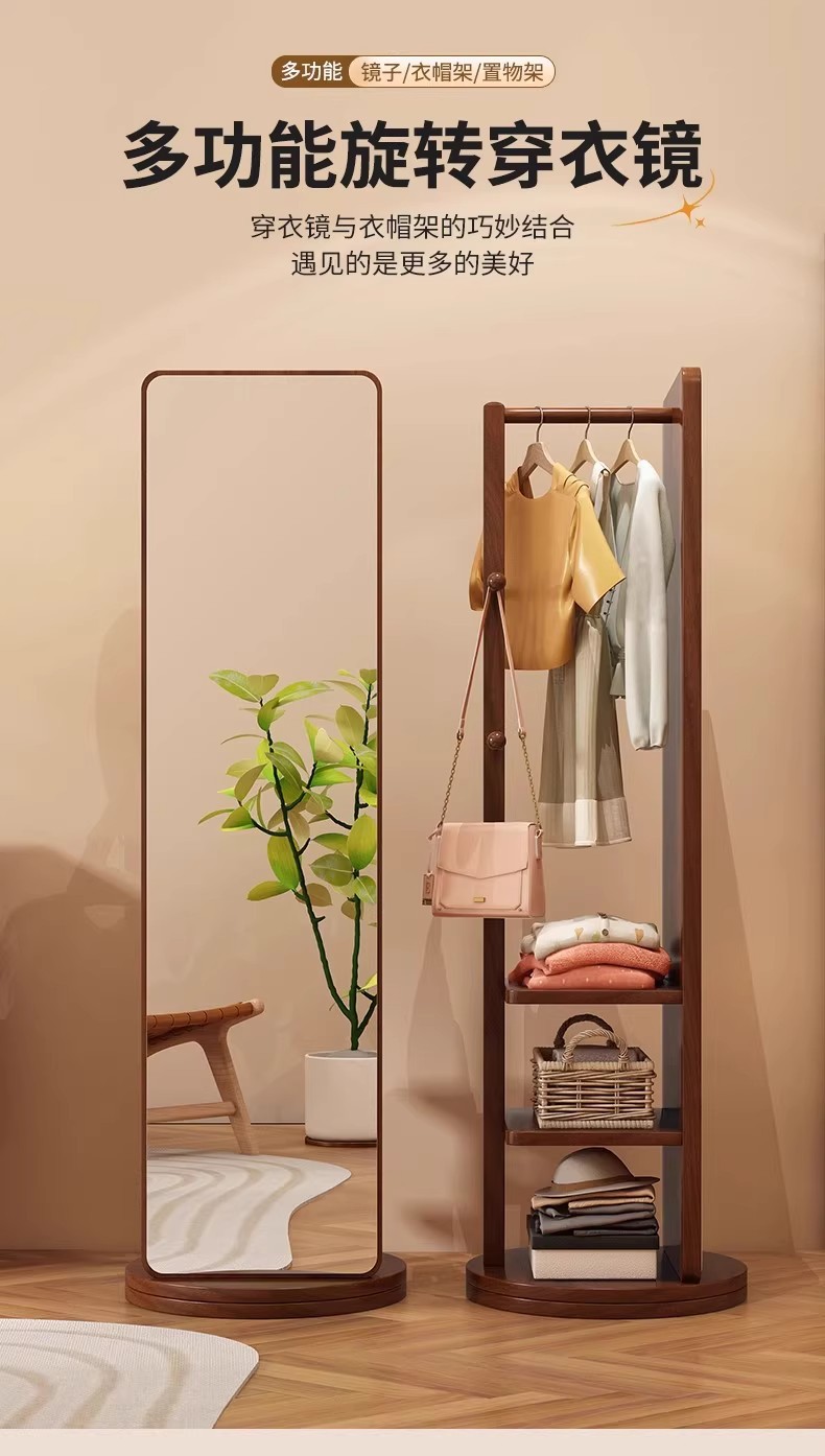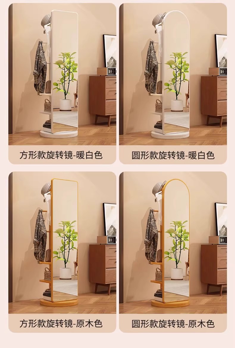 回転式全身鏡、床置き鏡、家庭用可動式寝室用姿見、洋服掛け一体型試着鏡収納