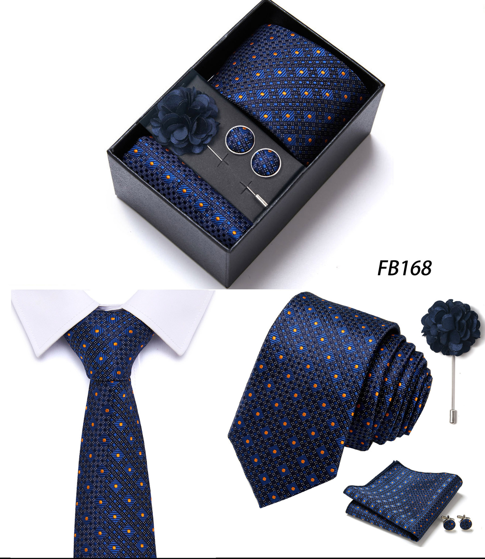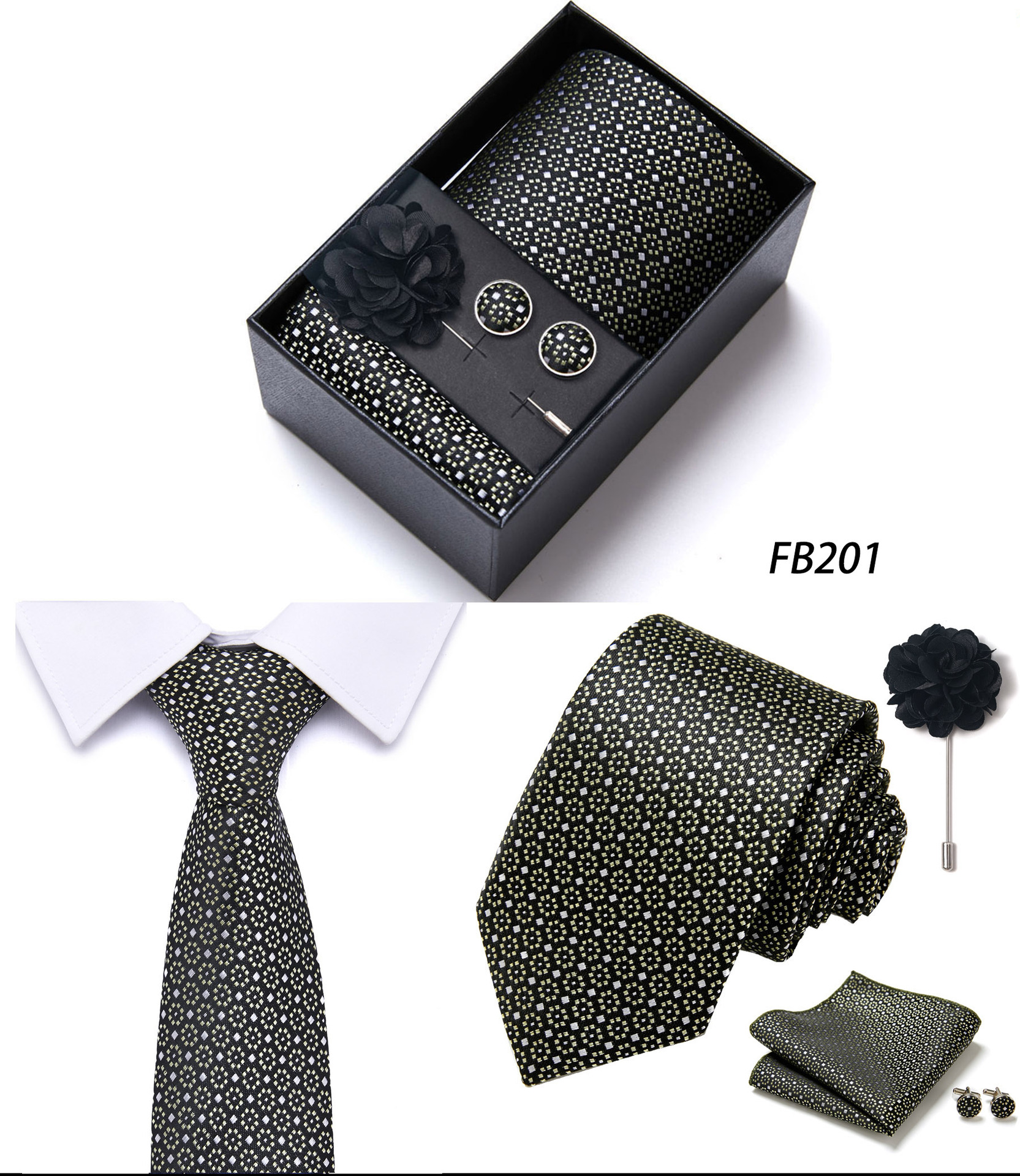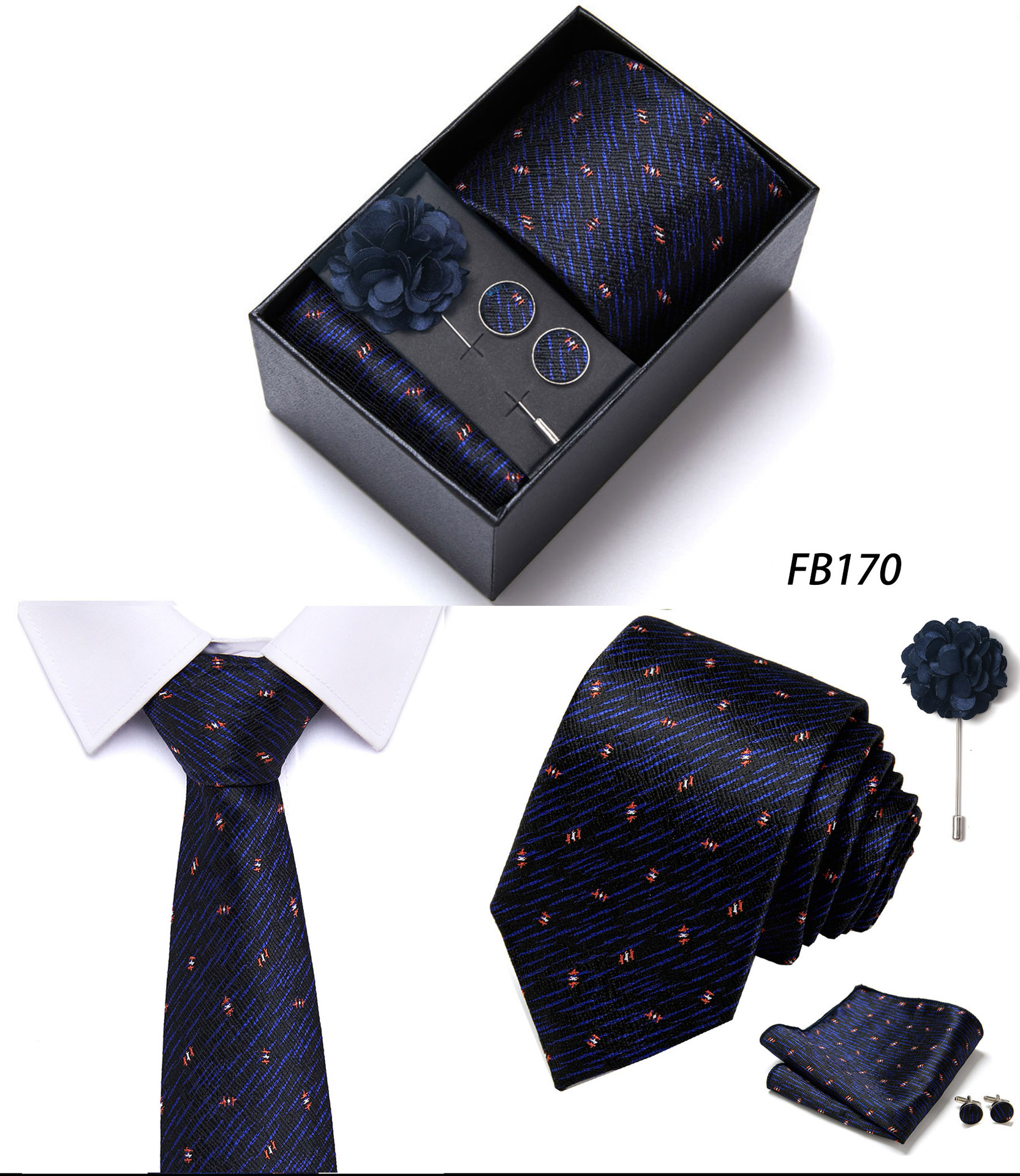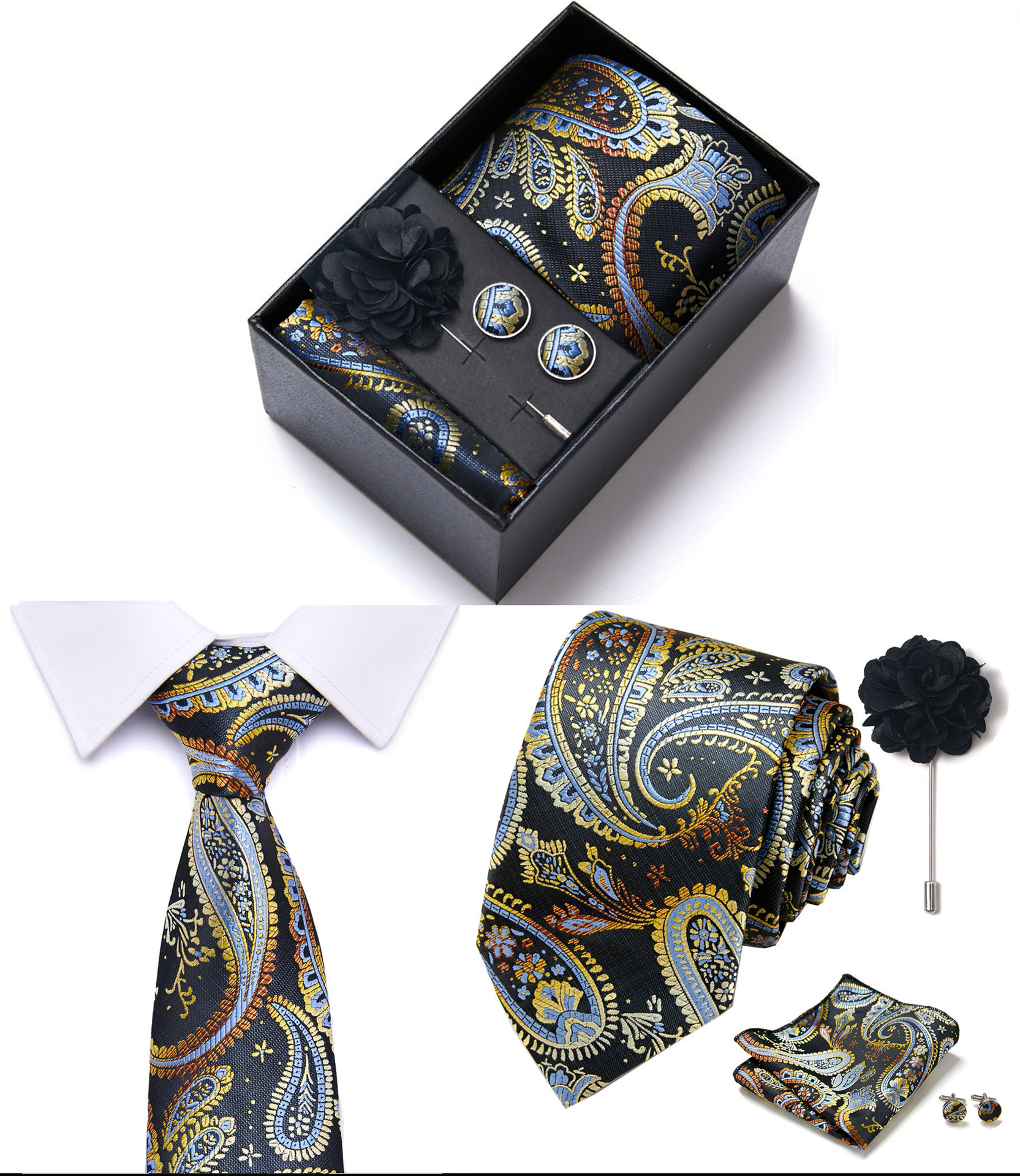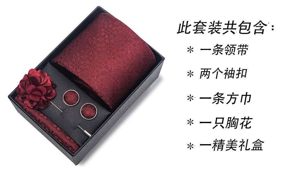 套装包含领带,方巾,袖扣,领带夹,黑色礼盒