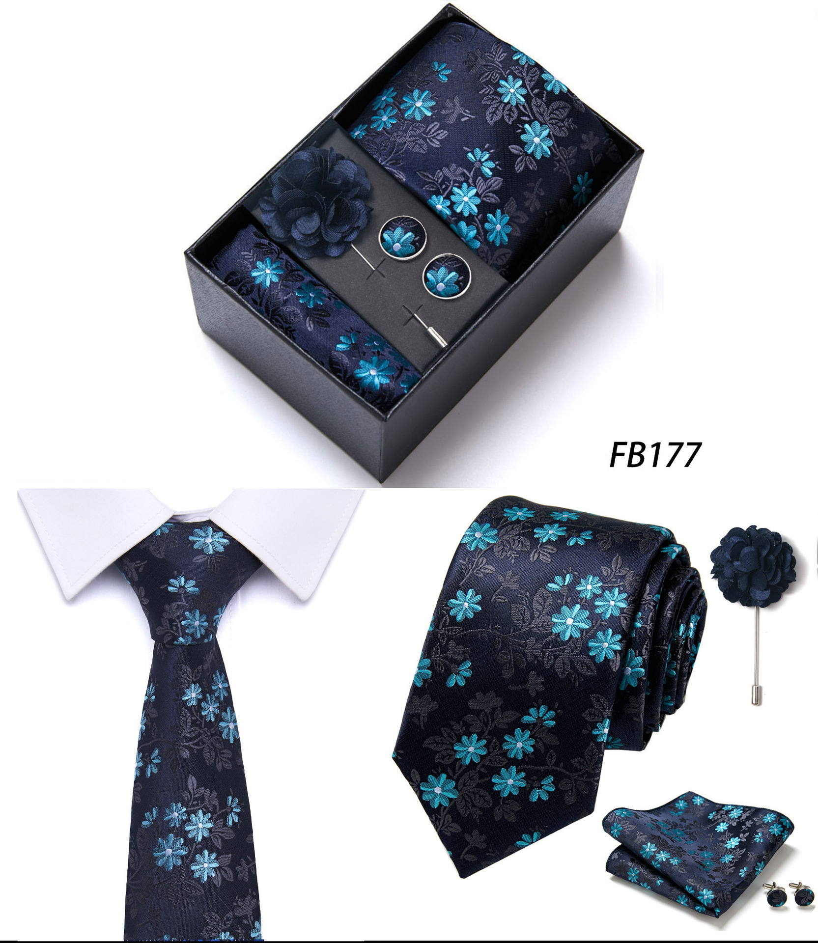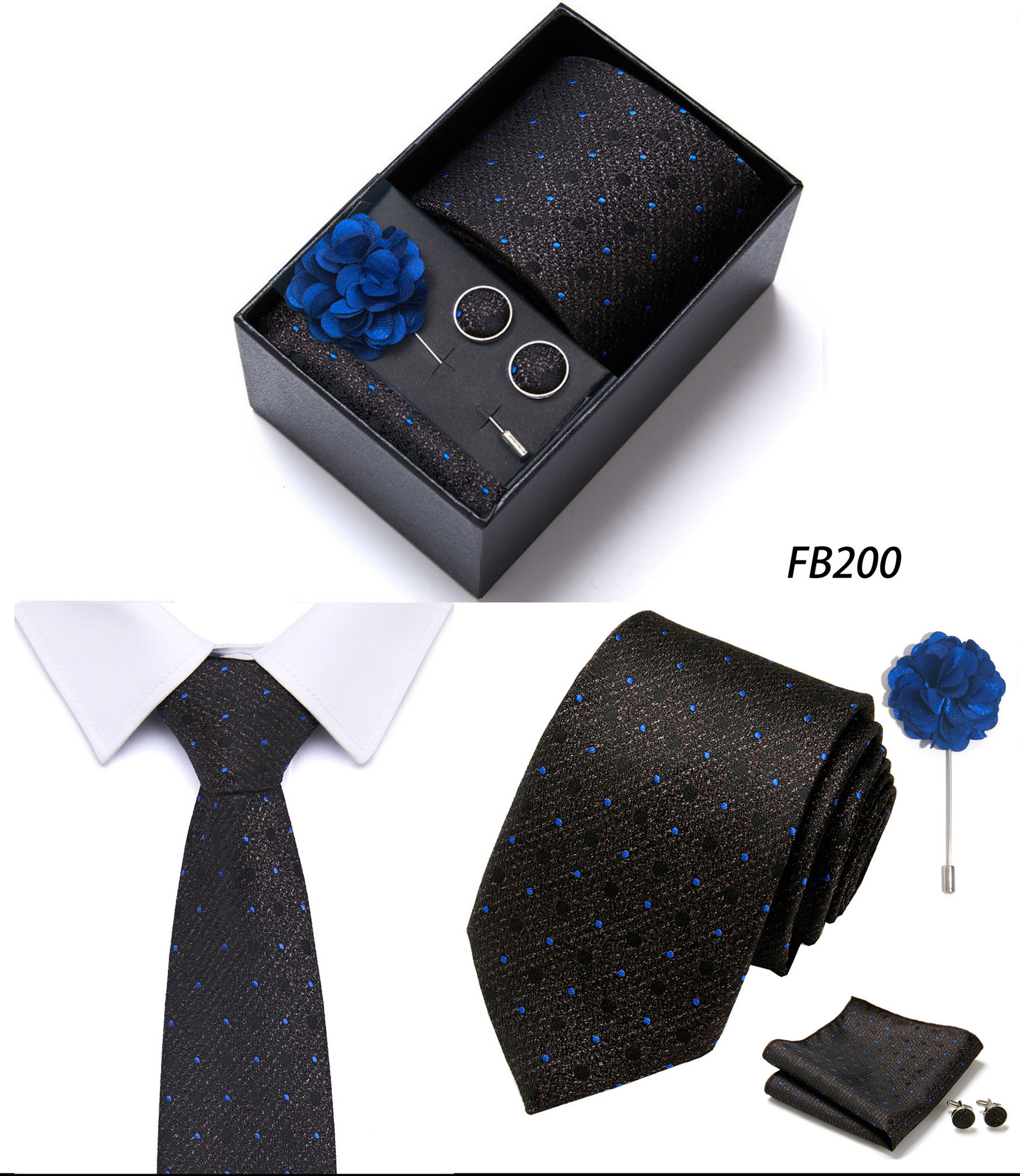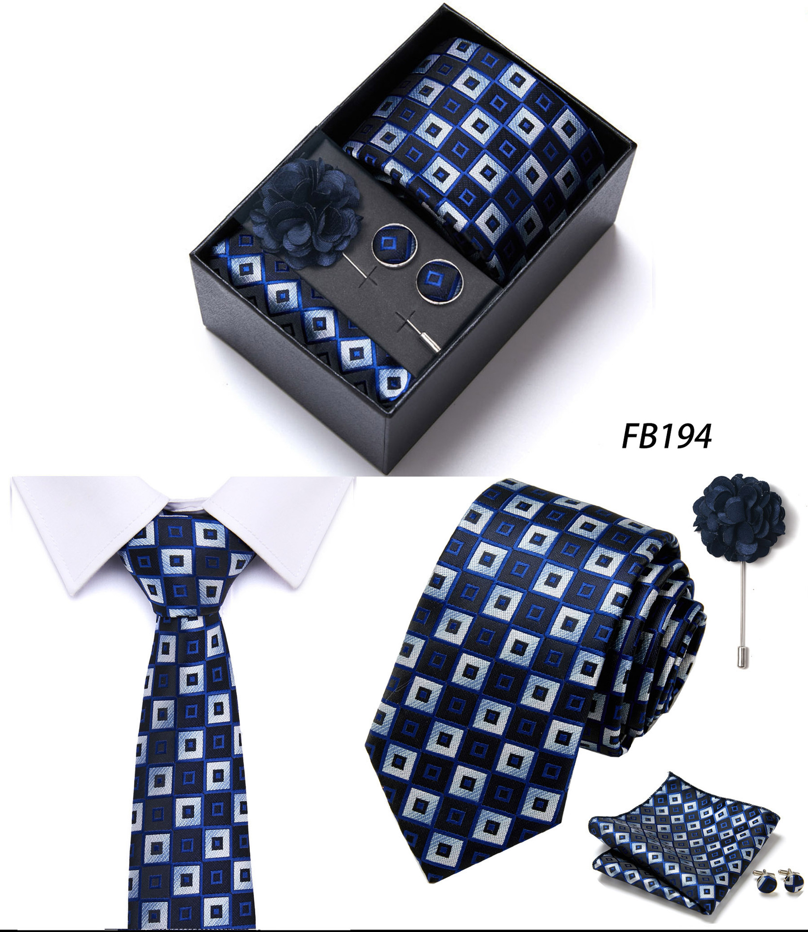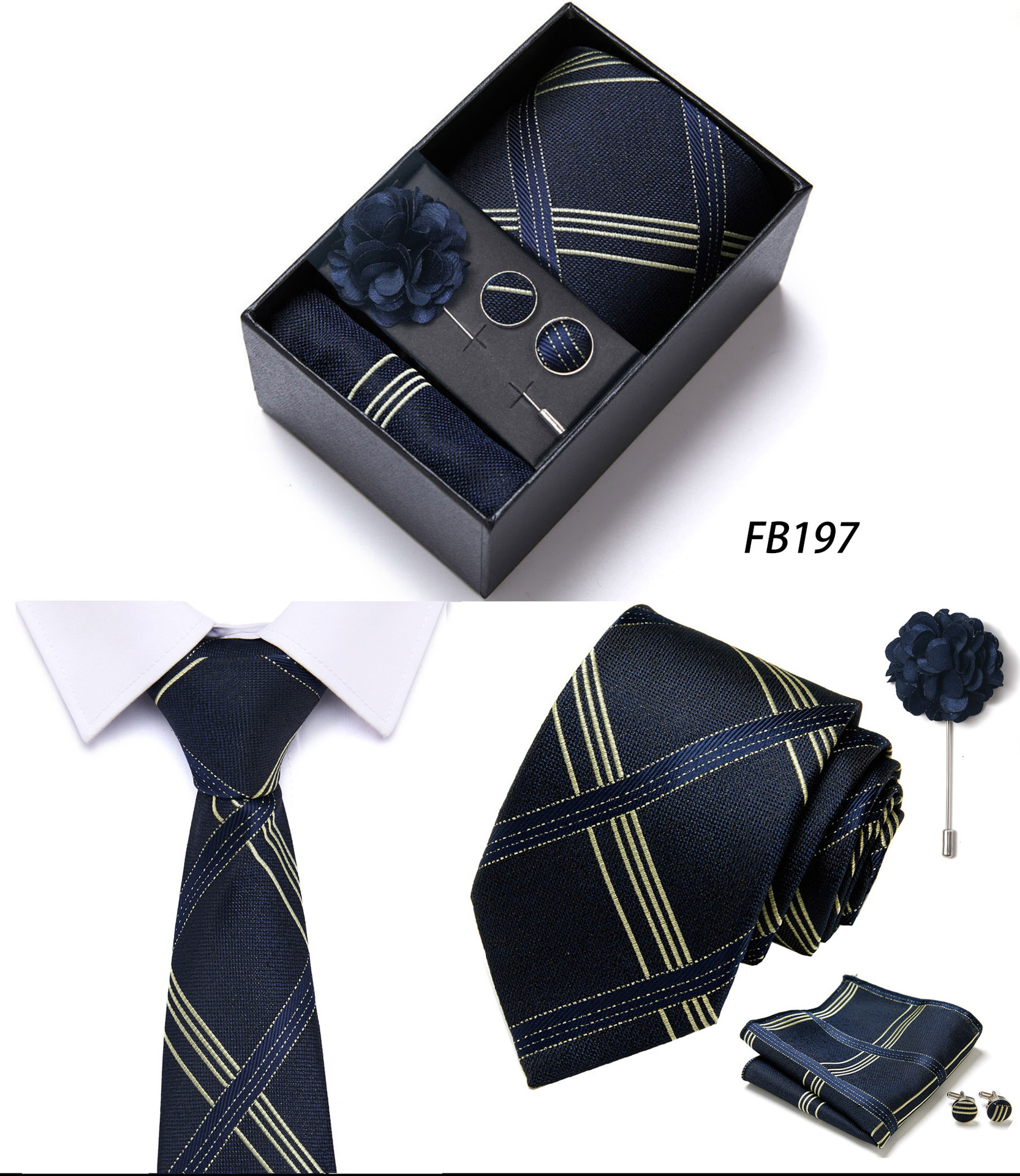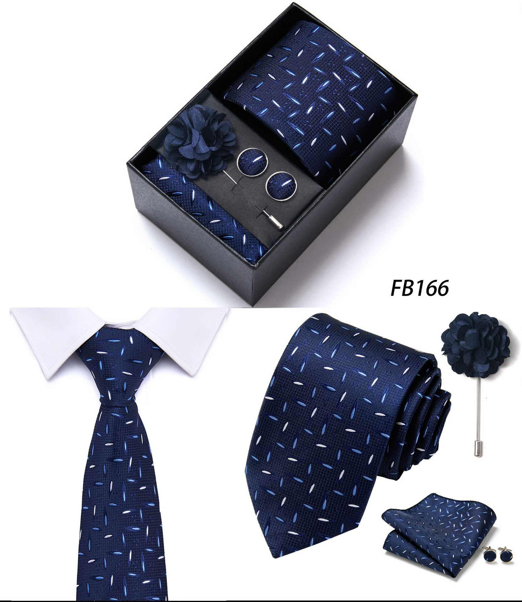 套装包含领带,方巾,袖扣,领带夹,黑色礼盒