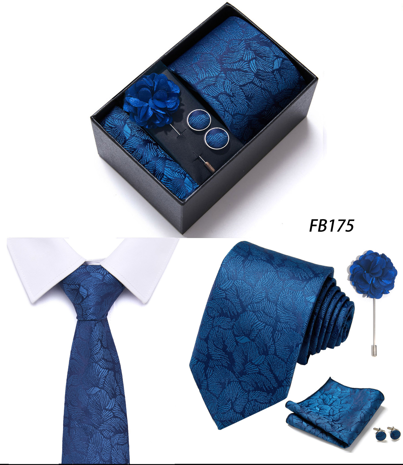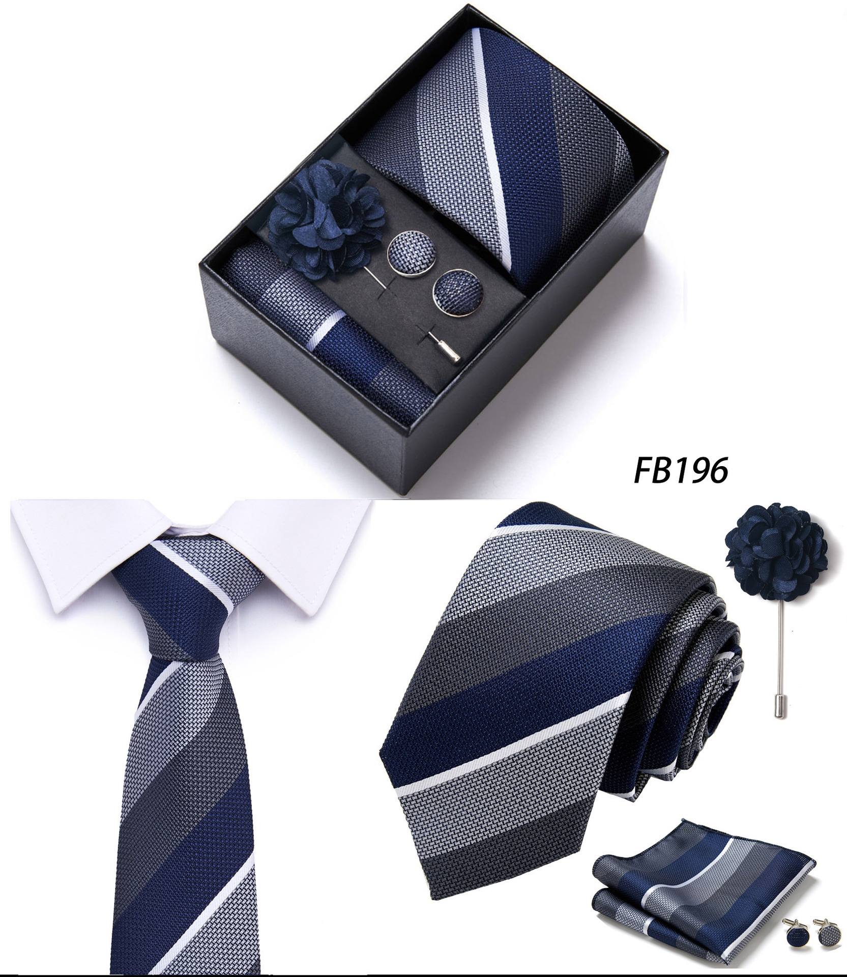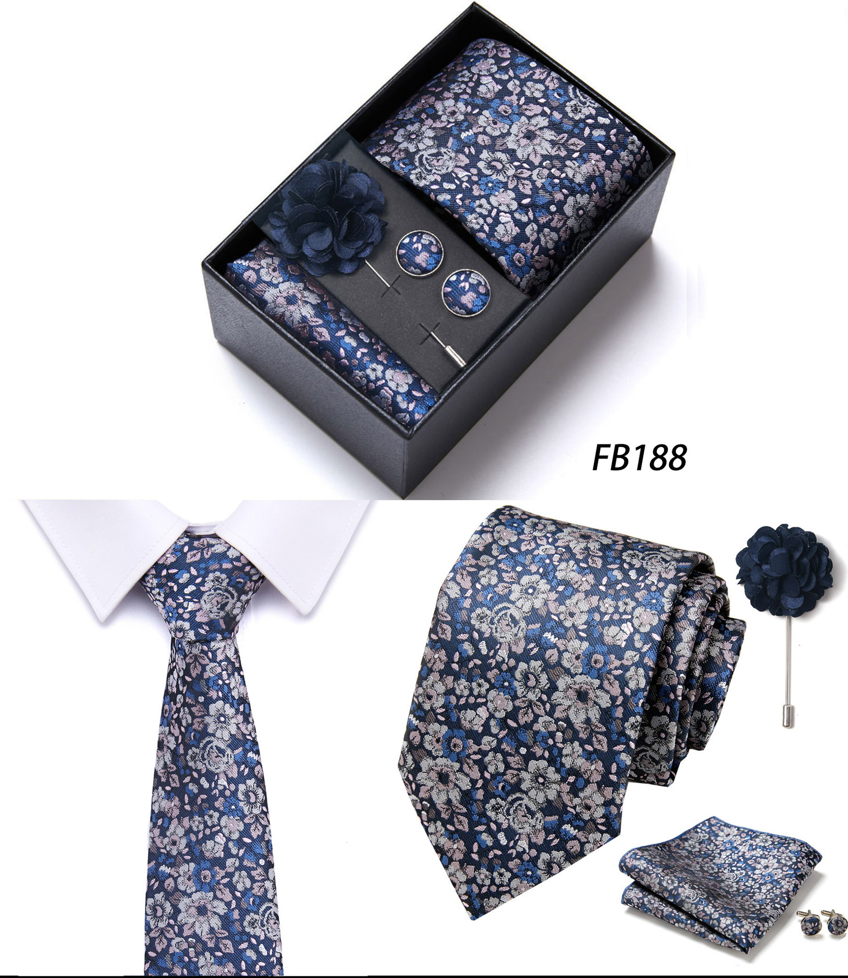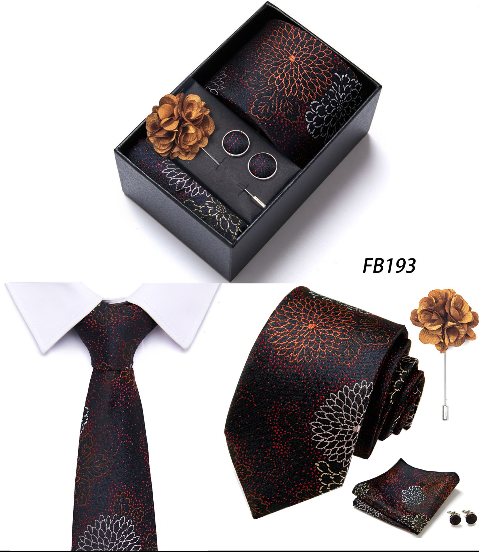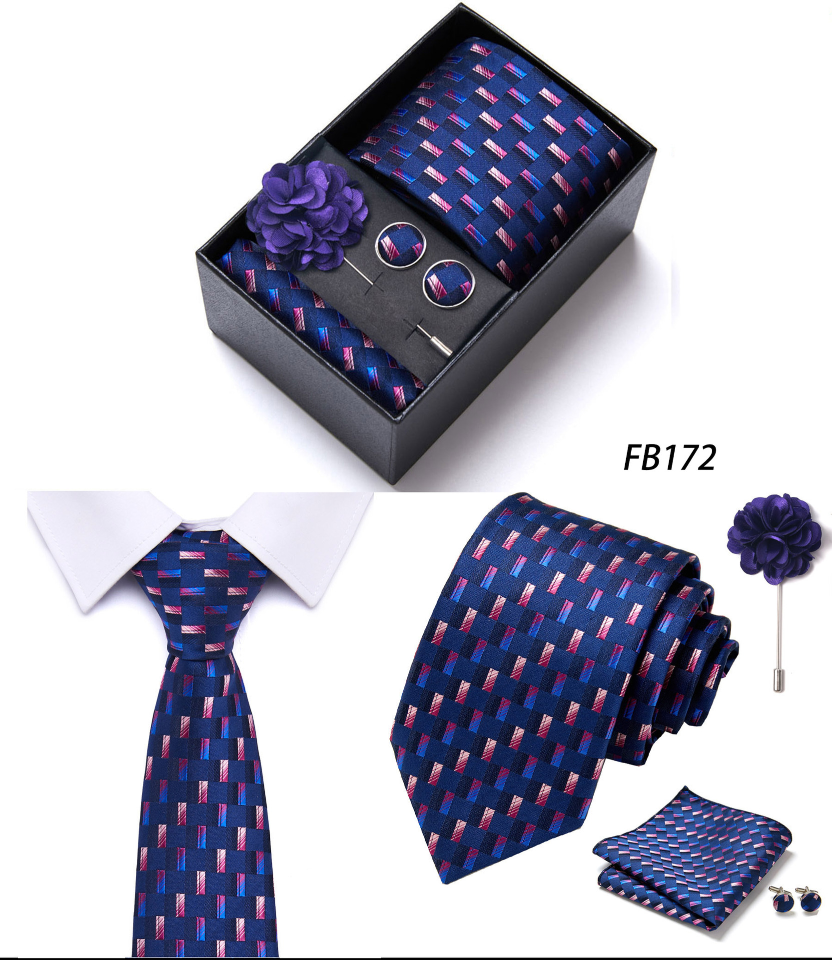 套装包含领带,方巾,袖扣,领带夹,黑色礼盒