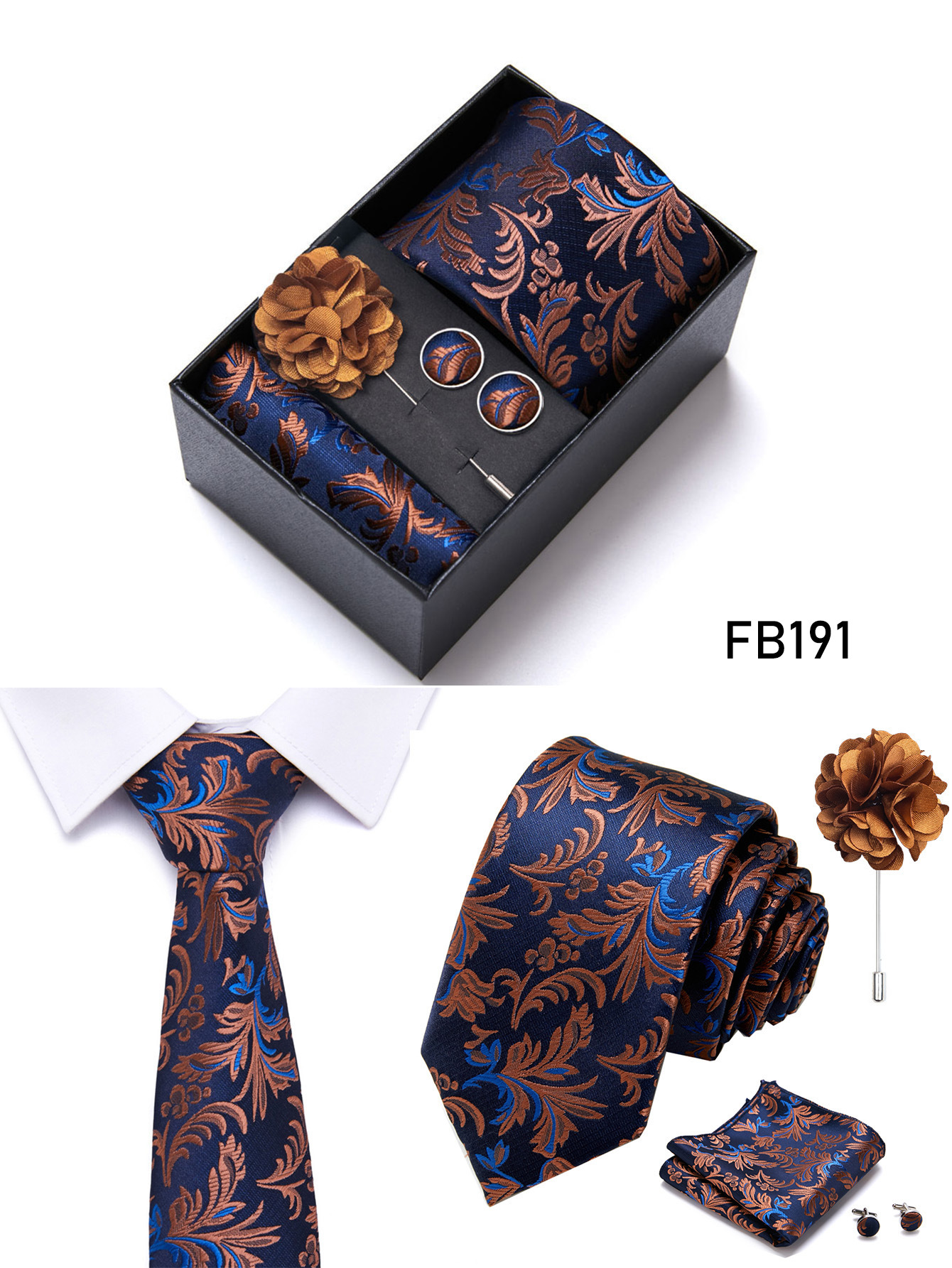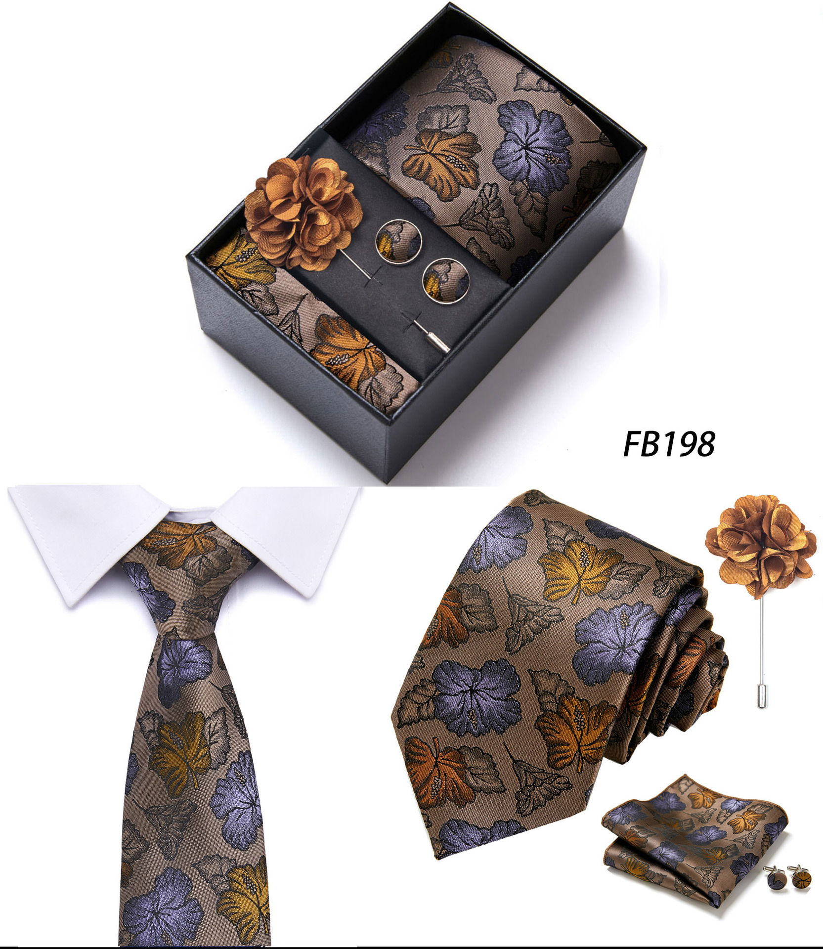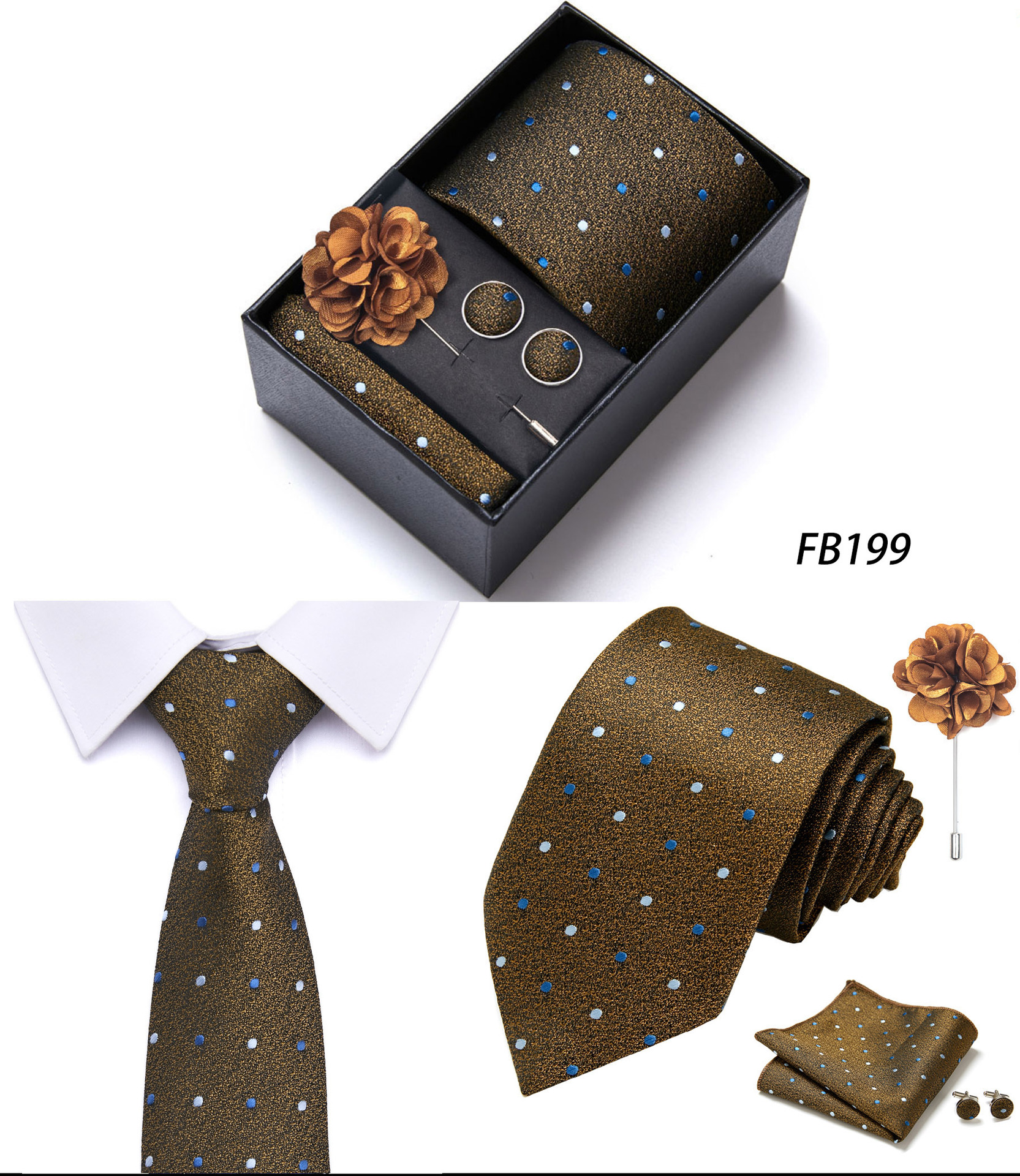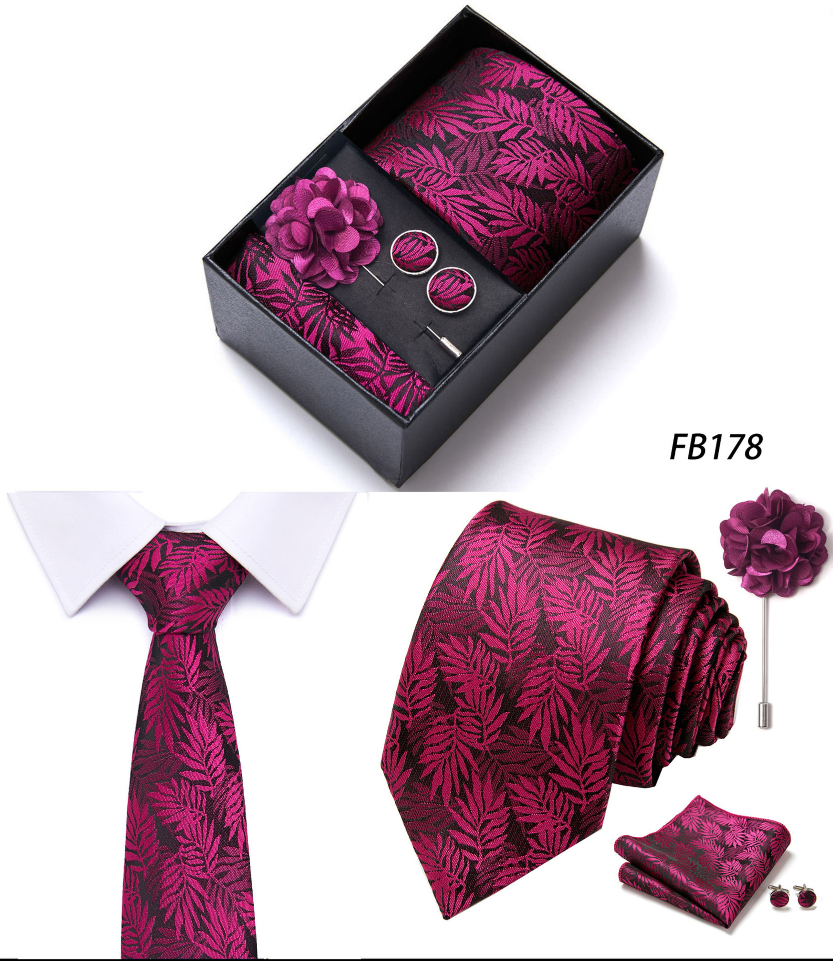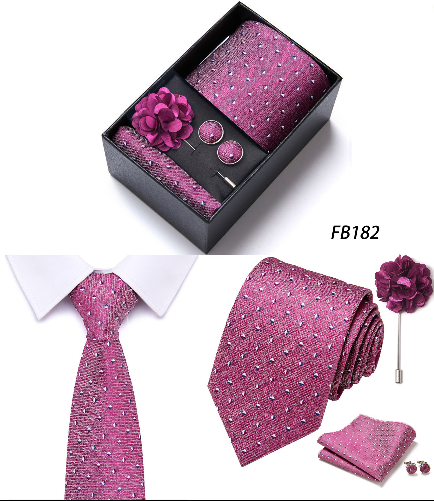 套装包含领带,方巾,袖扣,领带夹,黑色礼盒
