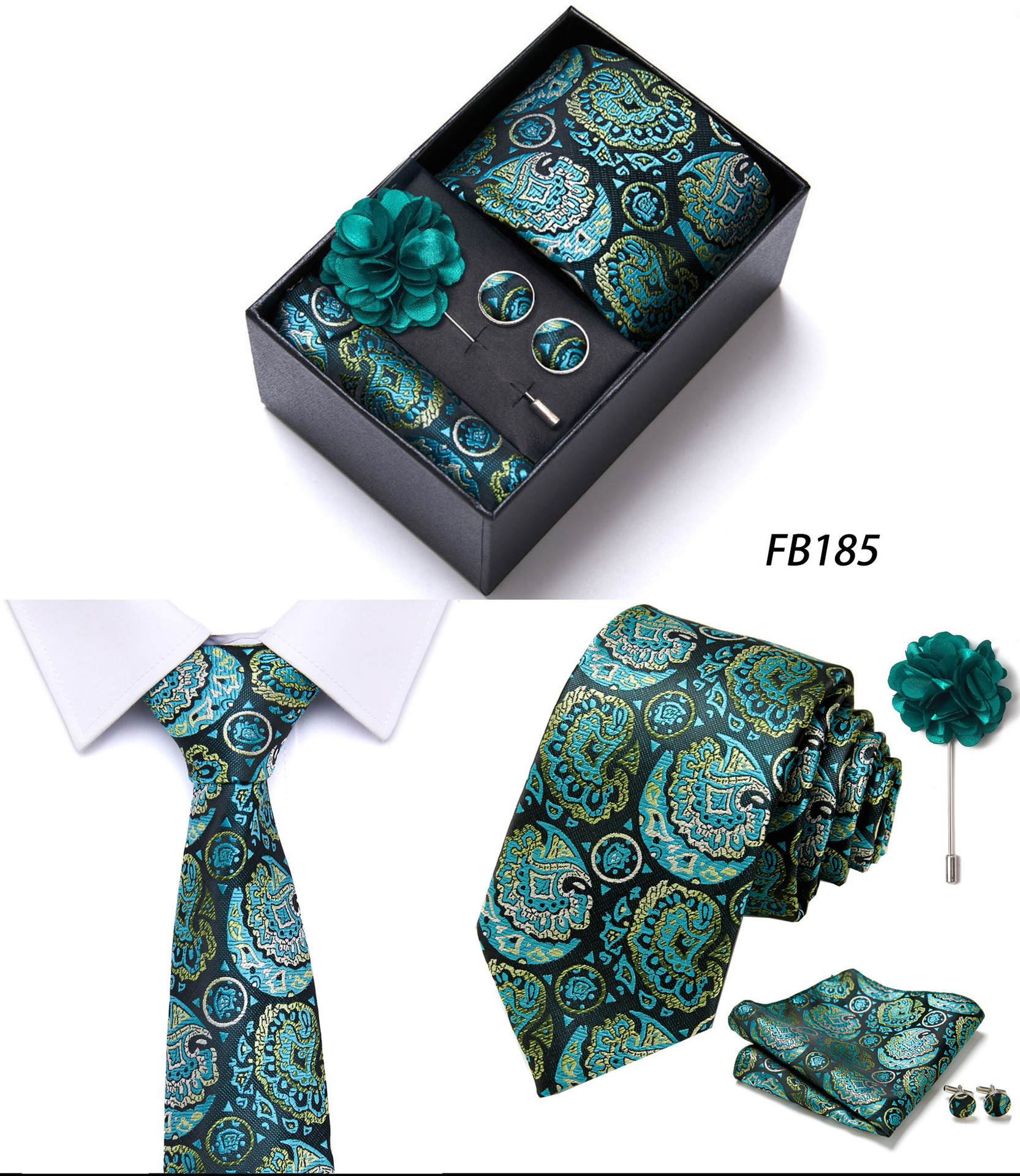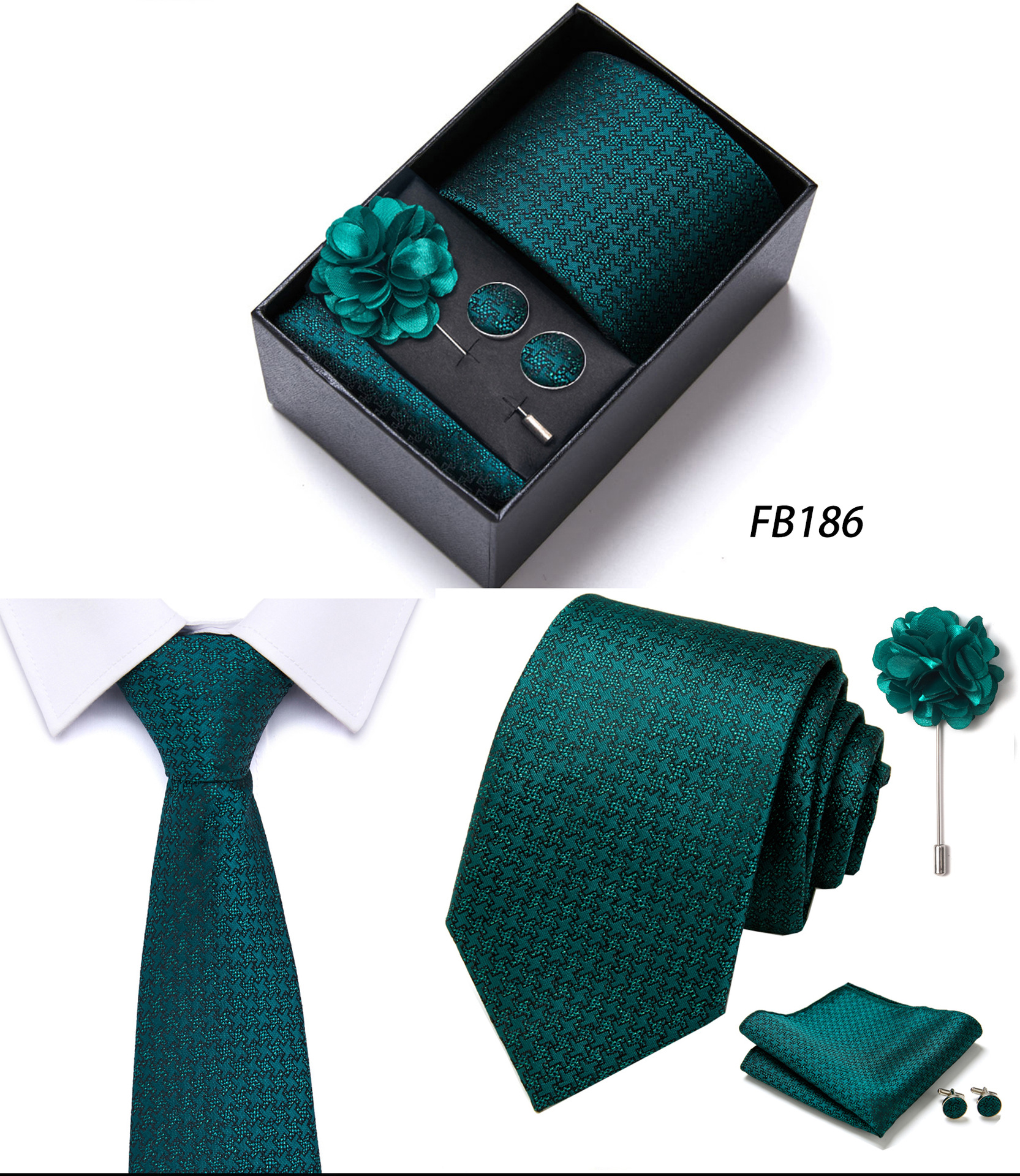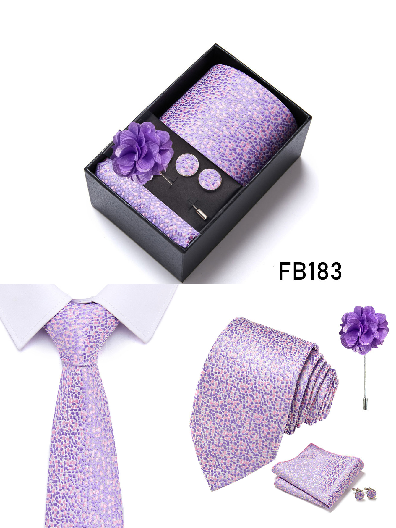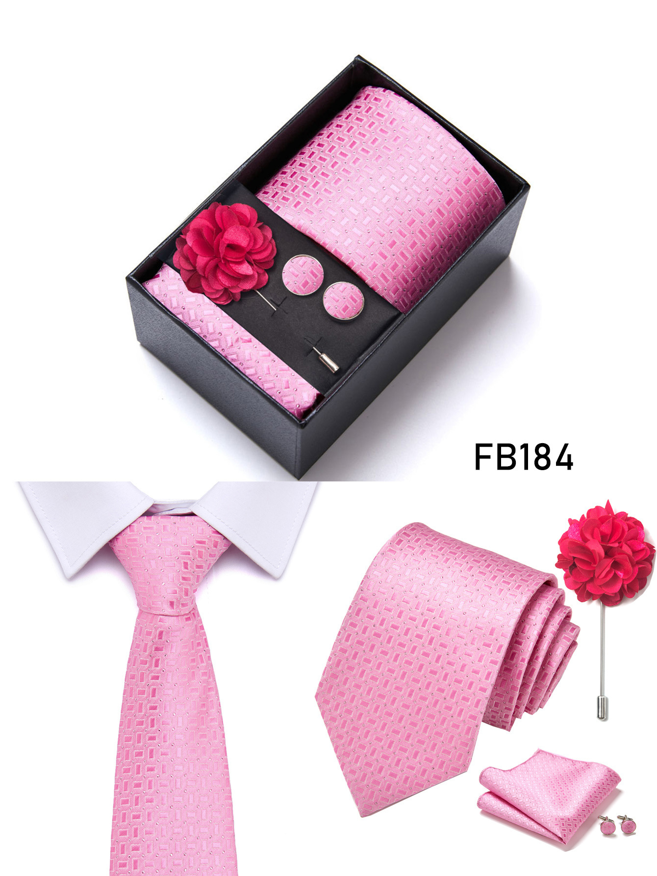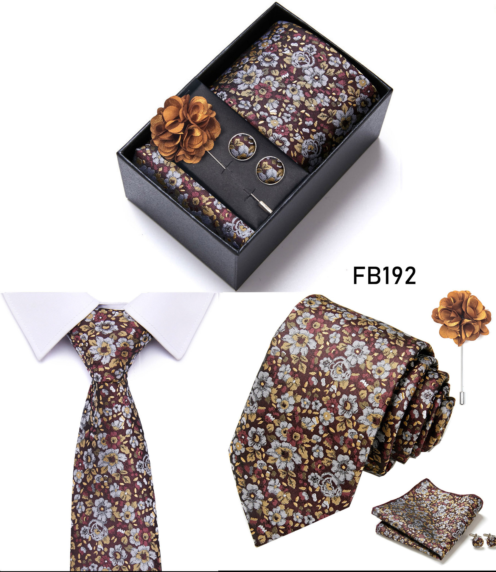 套装包含领带,方巾,袖扣,领带夹,黑色礼盒