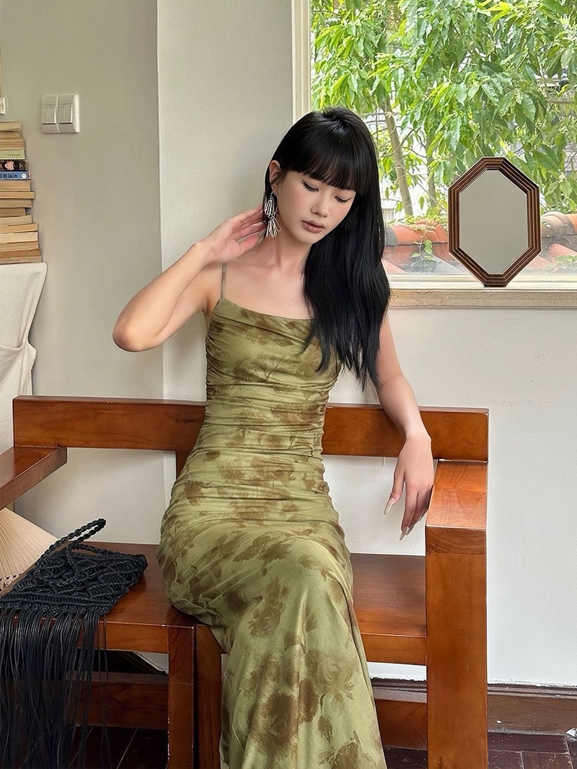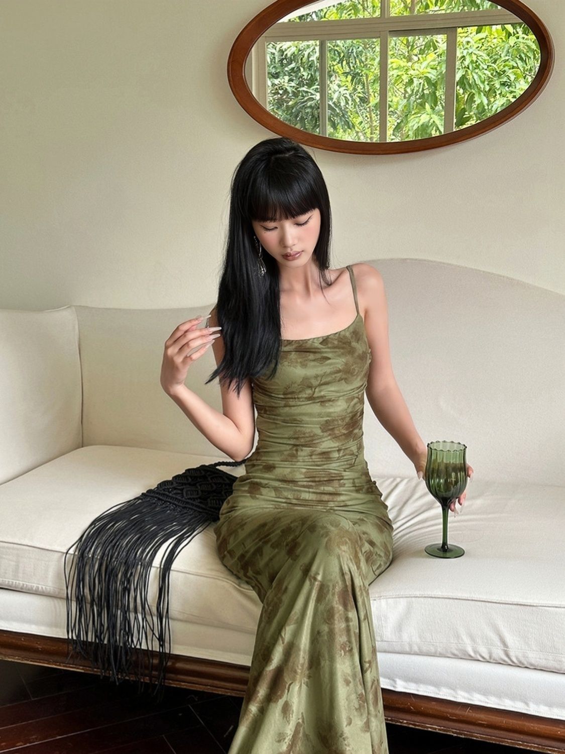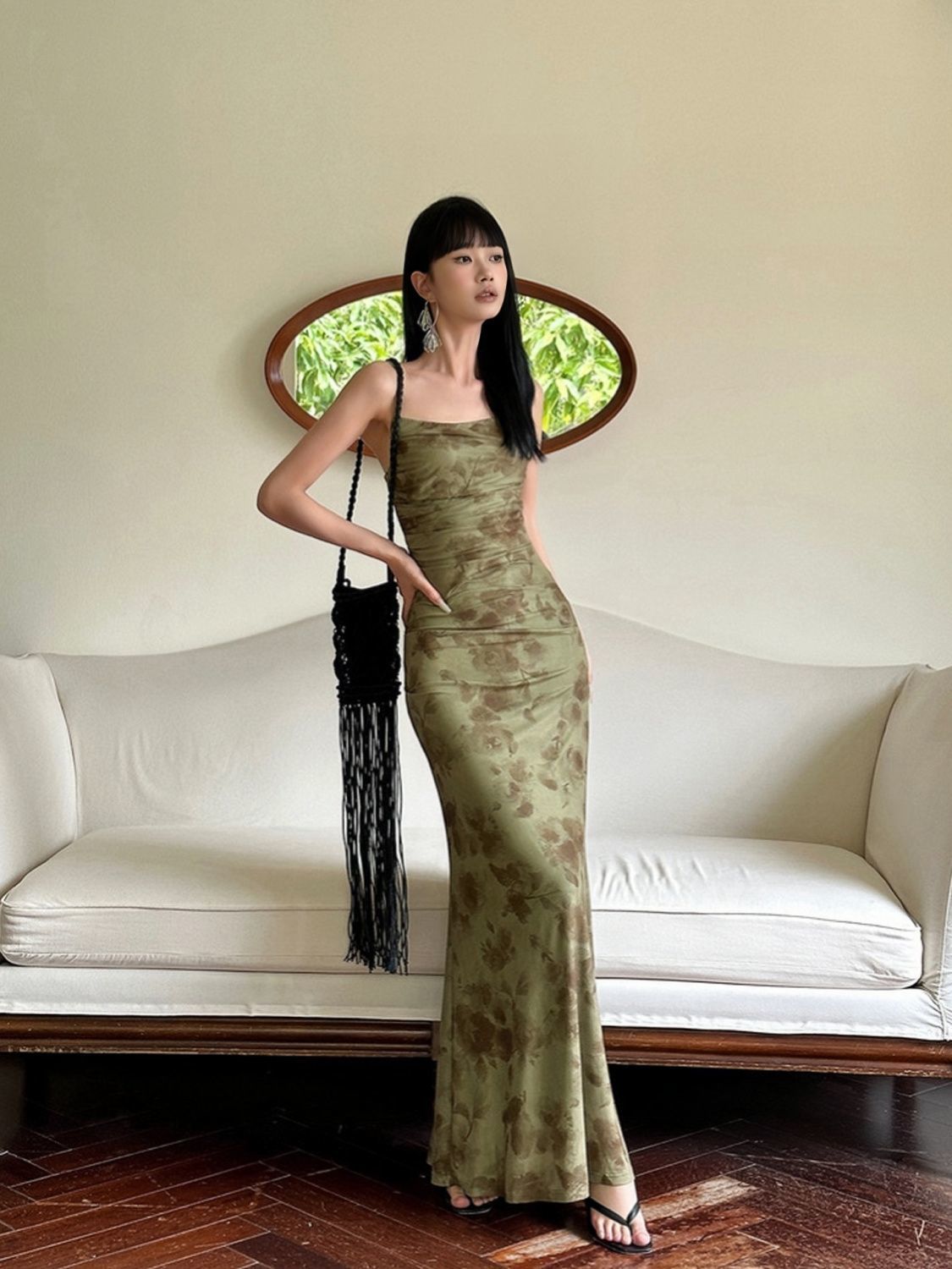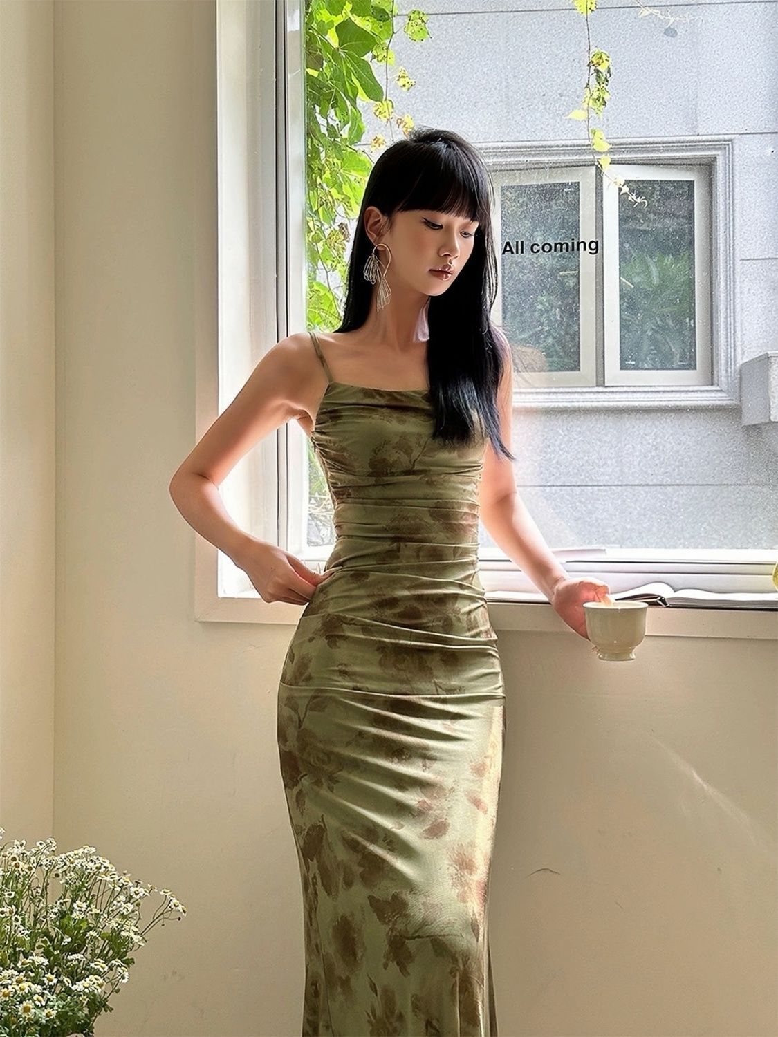 新しい中国式の緑の網の紗の花のガーターのワンピースの女性の夏の設計の高級な気質は腰を収めて尻の魚の尾のロングスカートを包みます。