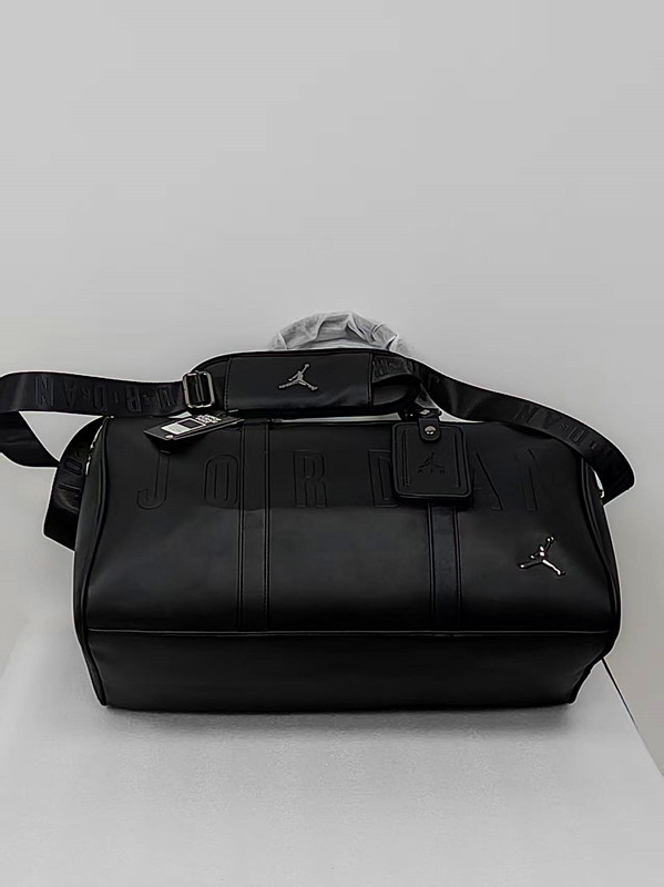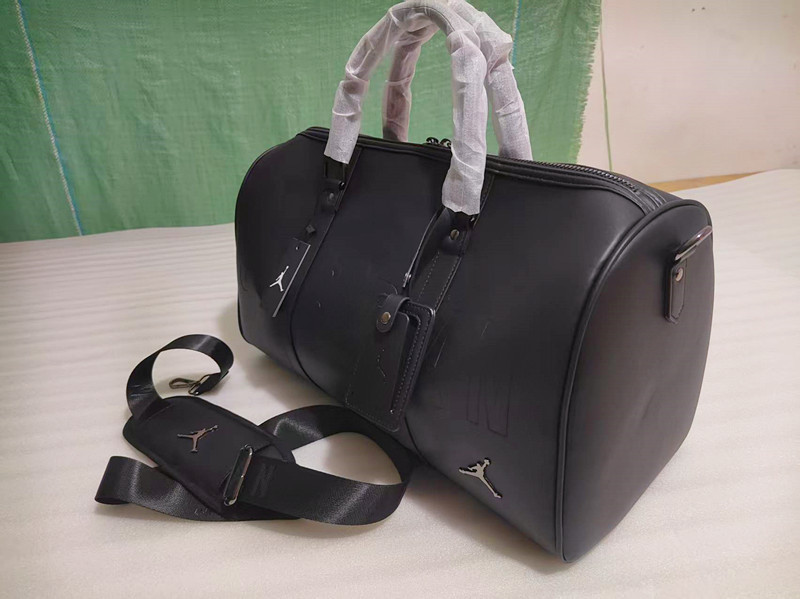 AJ压字PU旅行包篮球包健身包,黑色配枪色标五金,大容量设计,适合旅行健身通勤。