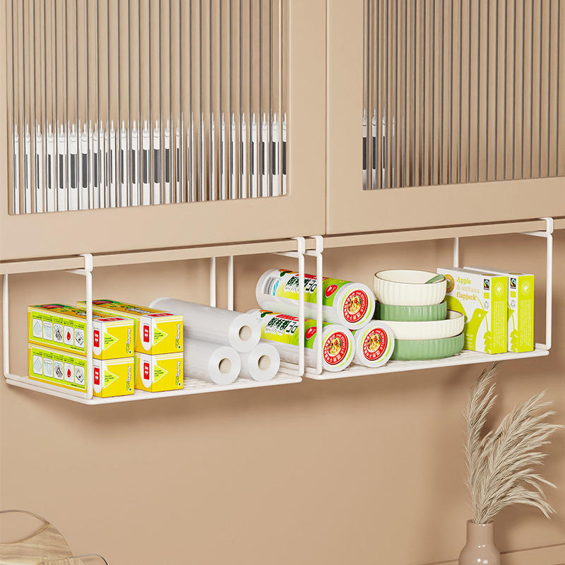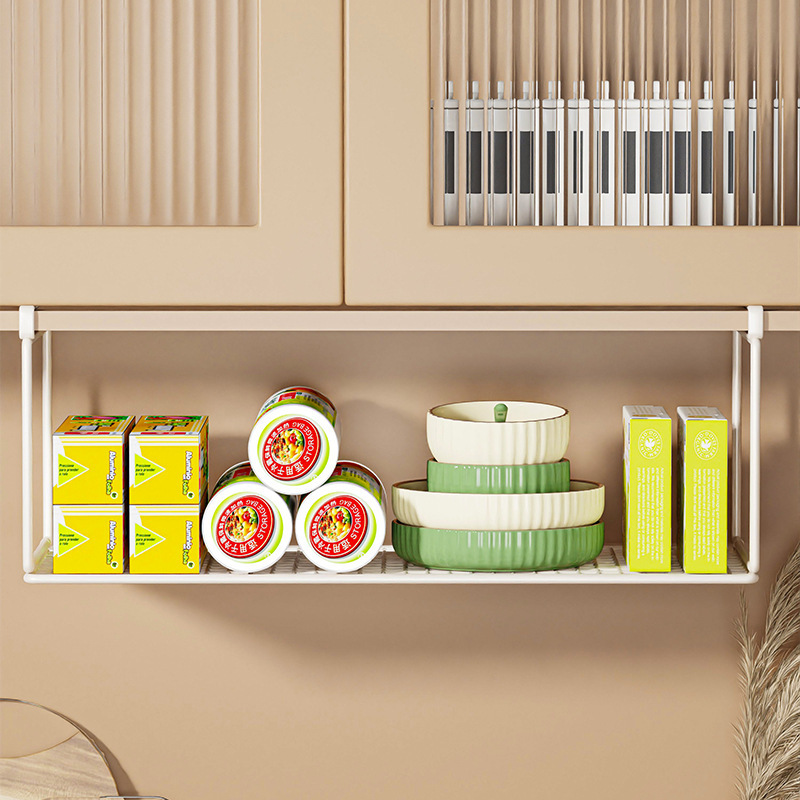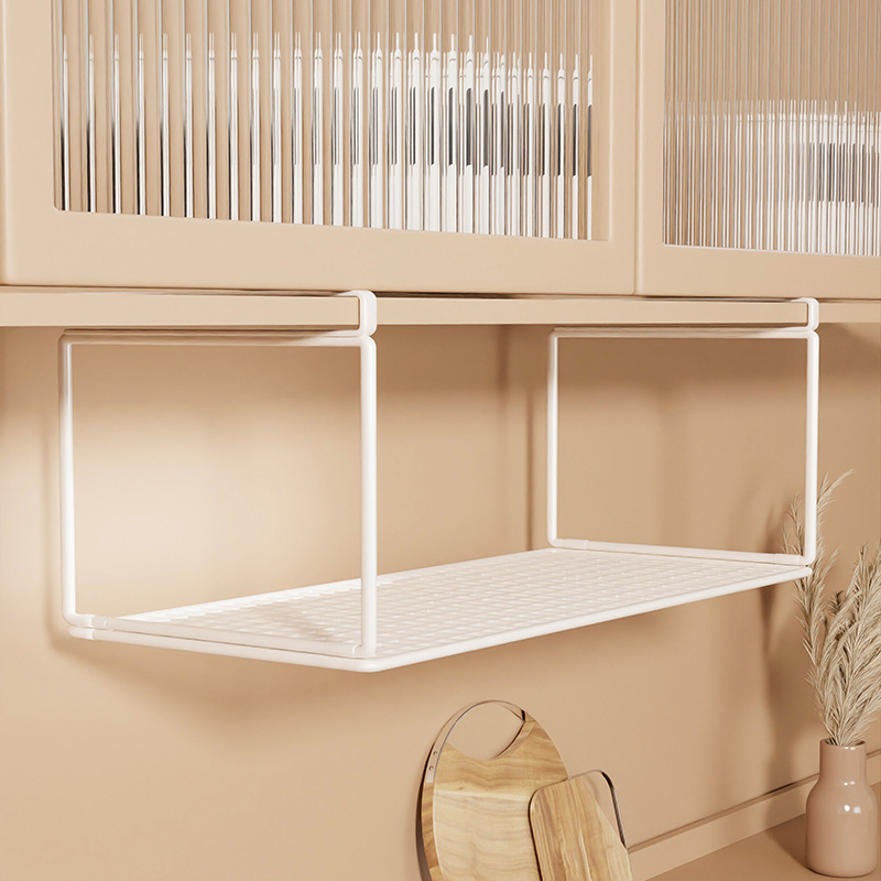 食器棚の下に棚を掛けて棚を吊るします。