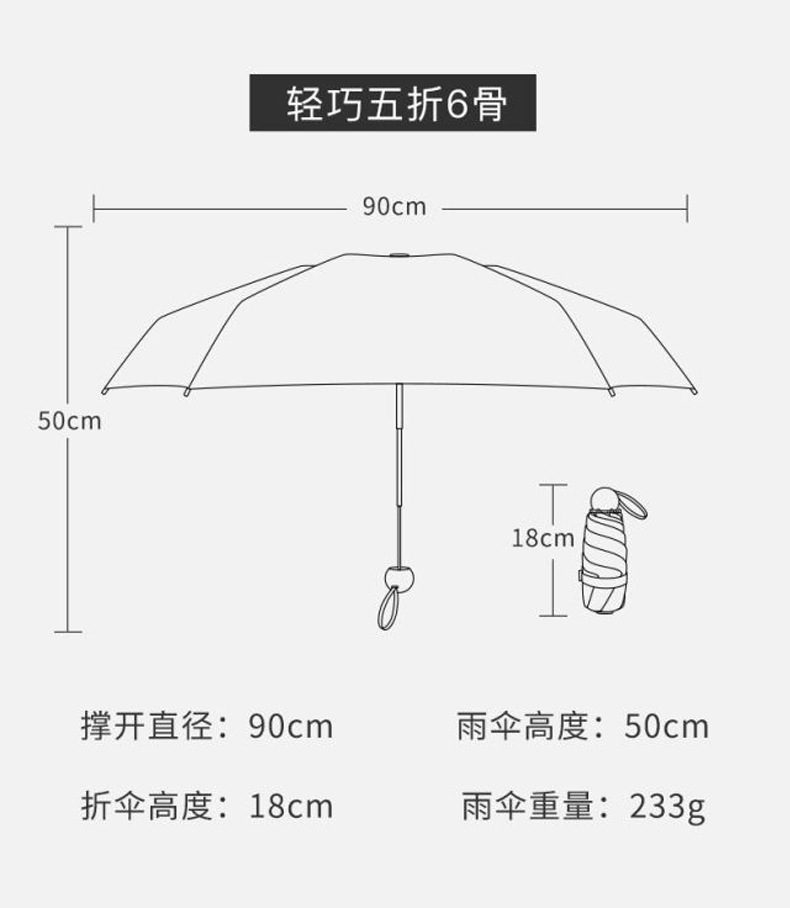 携帯五つ折り傘紫外線対策晴雨両用傘日傘黒ゴム折り畳みミニカプセル傘日焼け止め傘