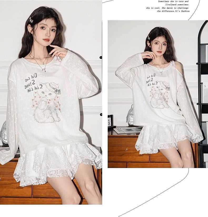 【工場現物】白い肩の見える猫tシャツ女性2025春プリント長袖ブラウス日焼け止め上着の薄いタイプ
