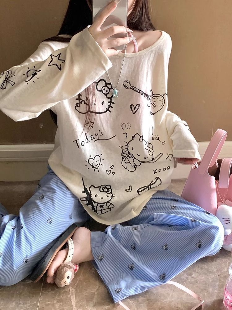 【自社工場在庫あり】レイジースタイル薄手トップスレディースTシャツゆったりニッチ猫プリント長袖ブラウス