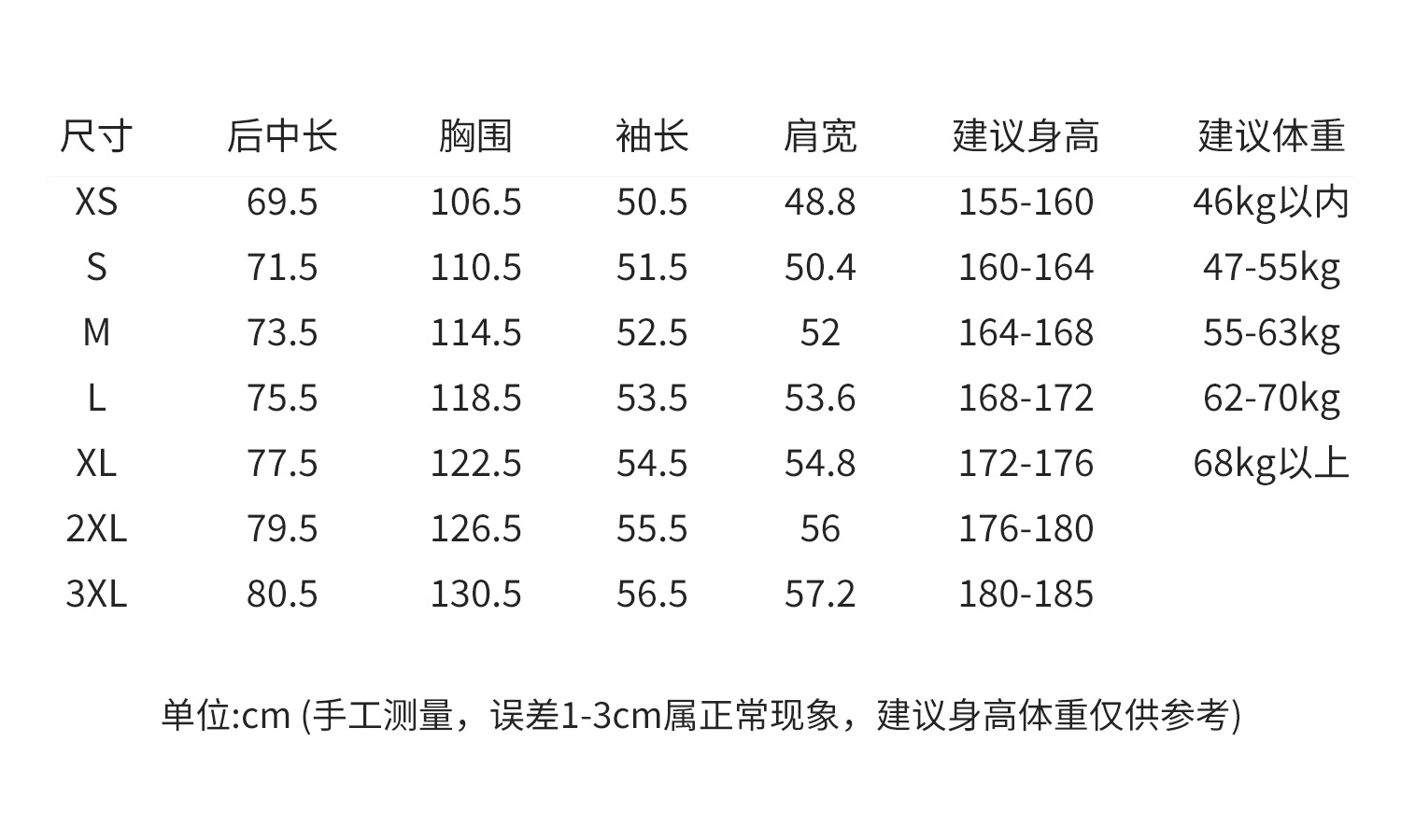 XS(推奨身長155~160cm),S(推奨身長160~164cm、体重47~55kg),M(推奨身長164~168cm、体重55~63kg),L(推奨身長168~172cm、体重62~70kg),XL(推奨身長172cm以上),XXL,XXXL