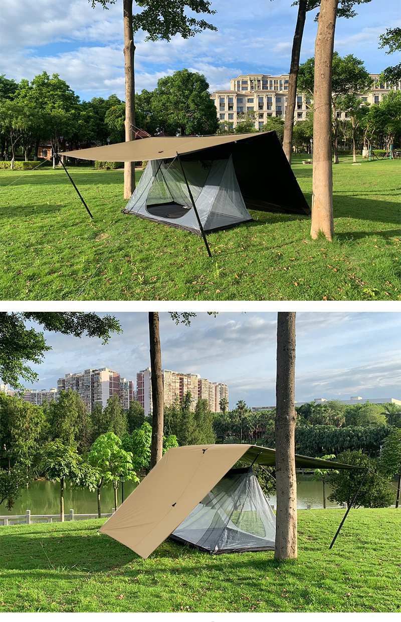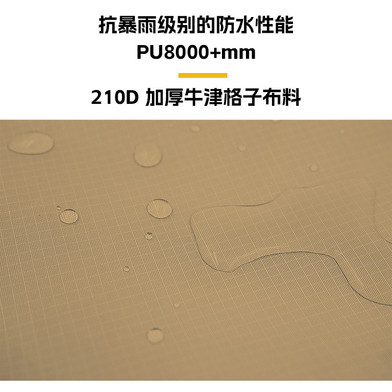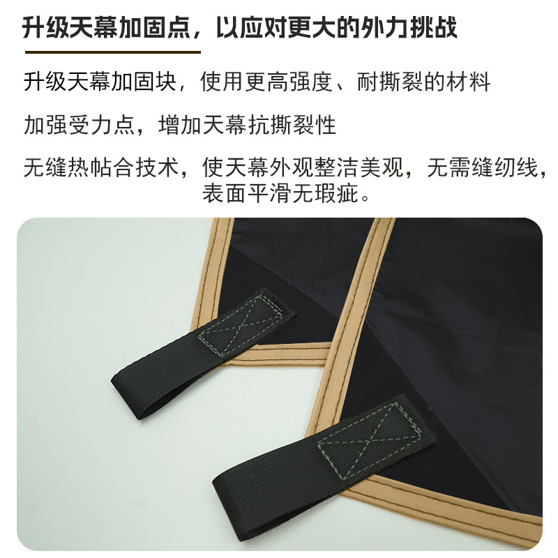 此款天幕主要针对户外露营徒步设计,为保证客户在户外有良好的遮阳效果,我们采用全遮光黑胶涂层,同时为方便出行携带尤其是背包、骑行、摩旅客户我们采用轻量布基来减轻客户负担,结合我们开发的抗撕裂加固块足够满足以上客户的日常使用。