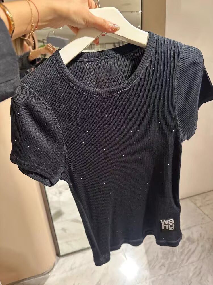 【在庫あり】2025夏新作ラウンドネック半袖Tシャツホットガールスリムフィットホットダイヤモンド見栄えの良いコットントップス女性用