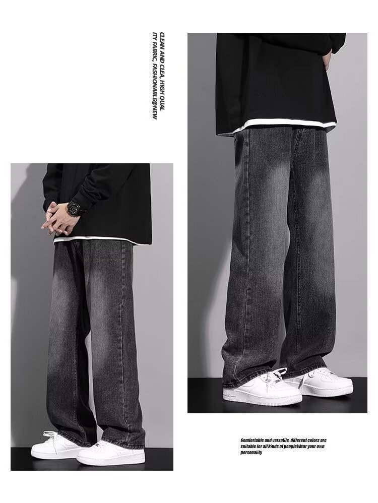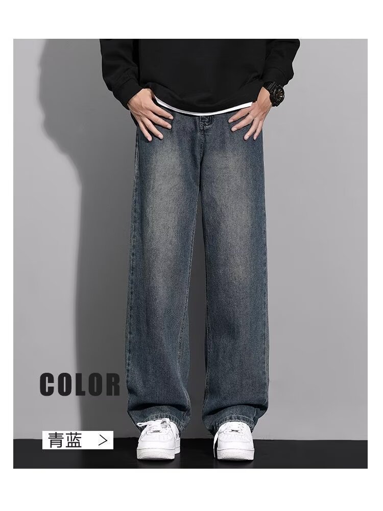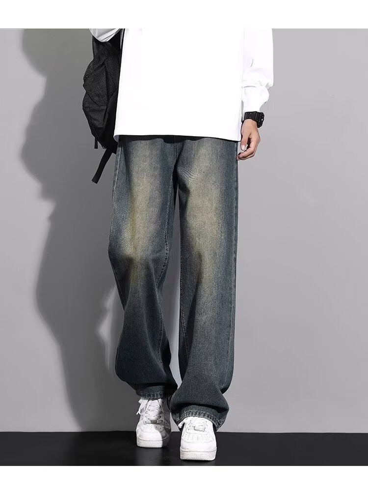アメリカンレトロダメージジーンズメンズルーズストレートワイドレッグパンツ若者トレンディなハイストリートカジュアルパンツ