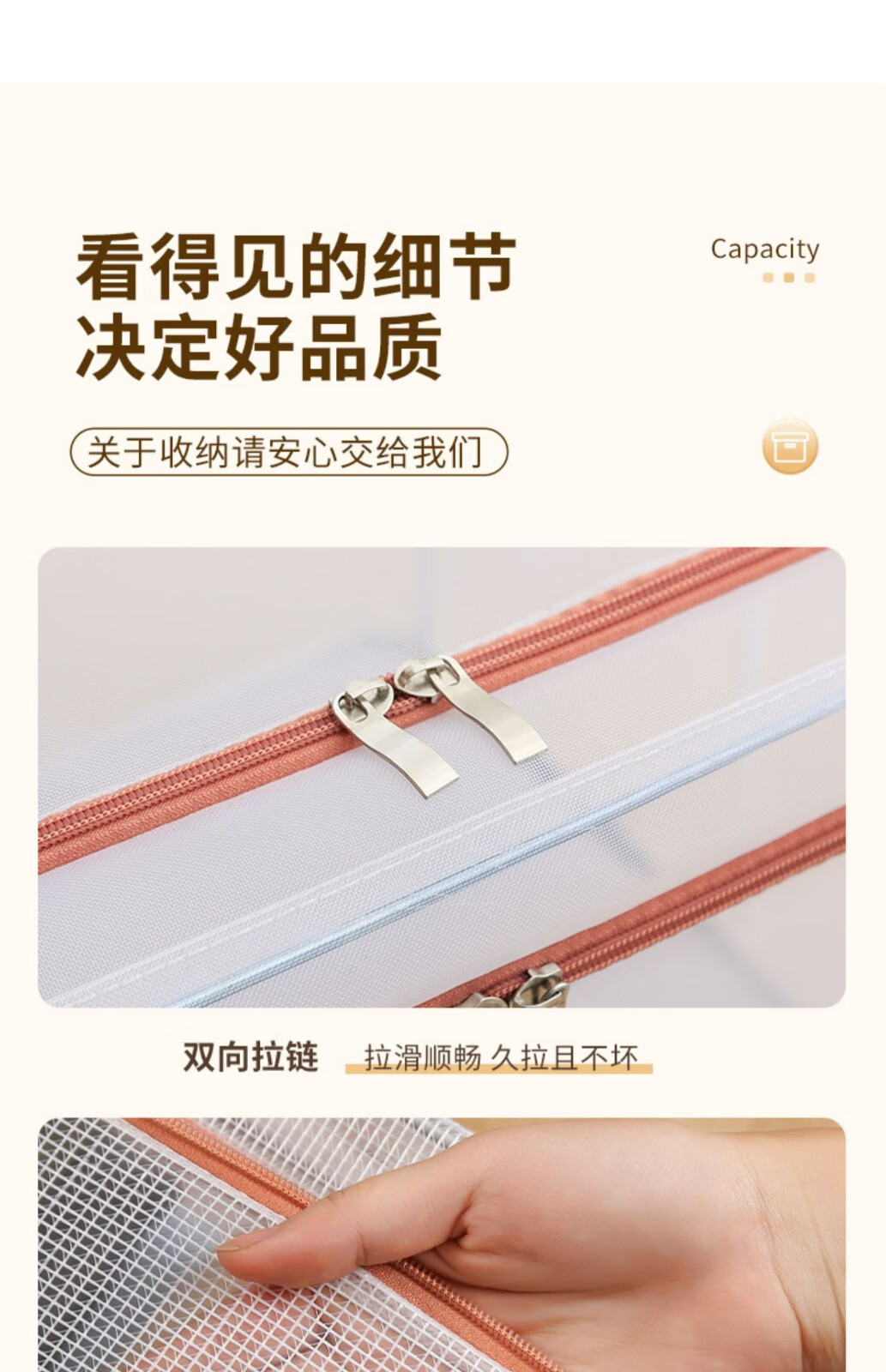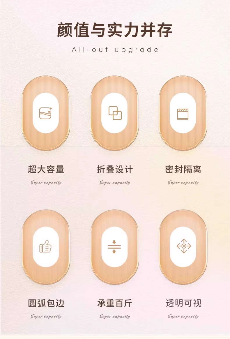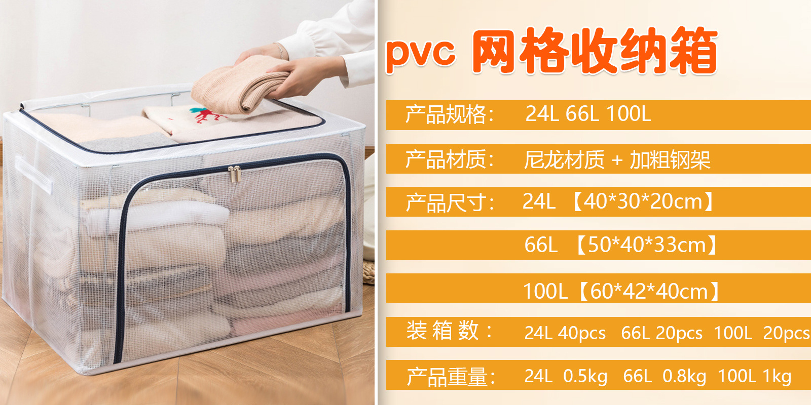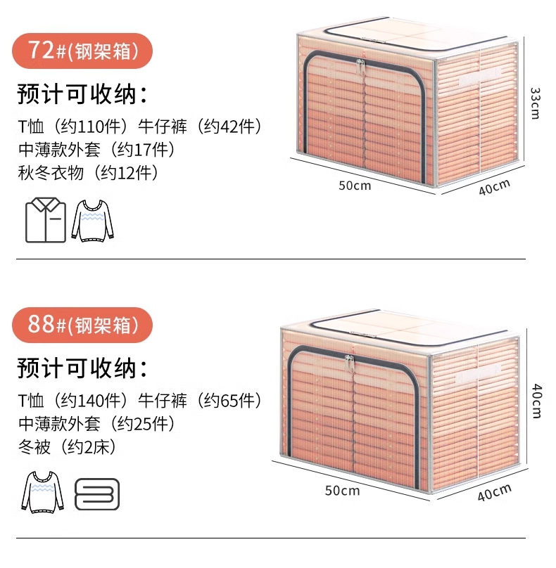 24L (40*30*20) スチールフレーム 2 個 + プラスチックジッパー,66L (50*40*33) 3 スチールフレーム + プラスチックジッパー,110L (60*45*40) スチールフレーム 4 個 + プラスチックジッパー