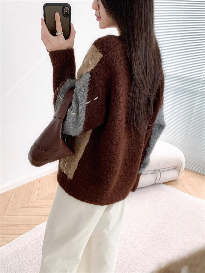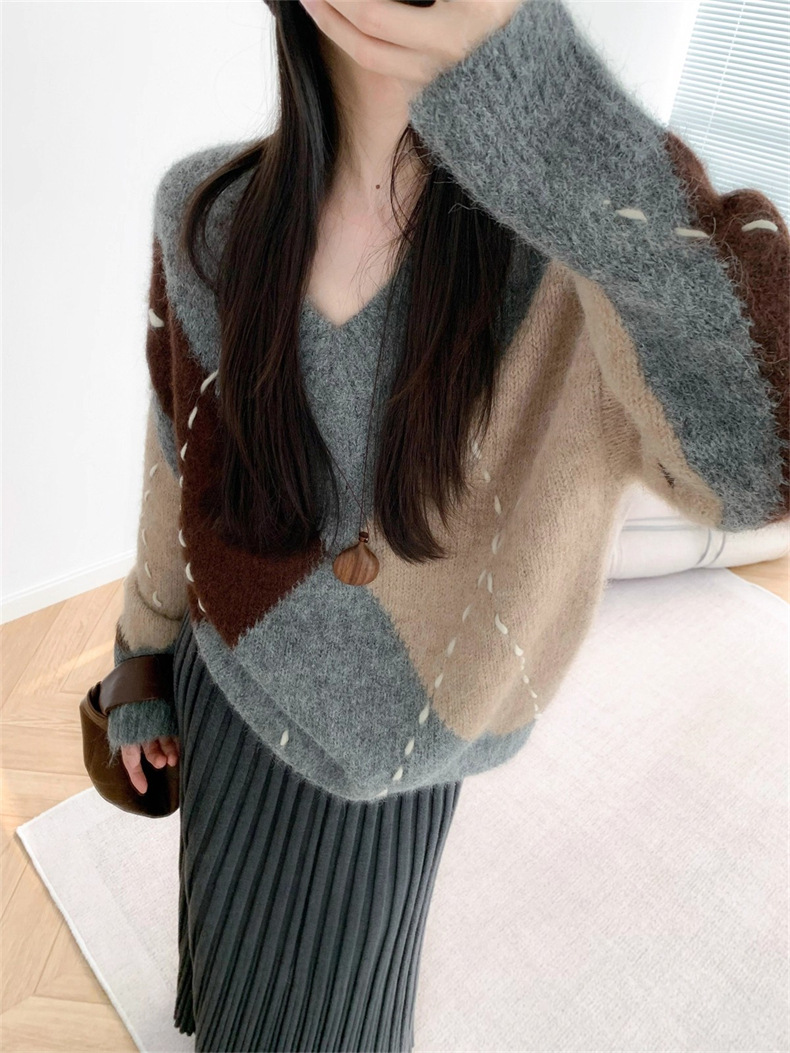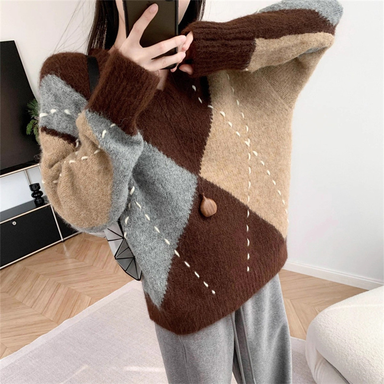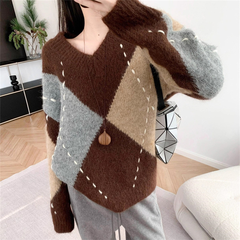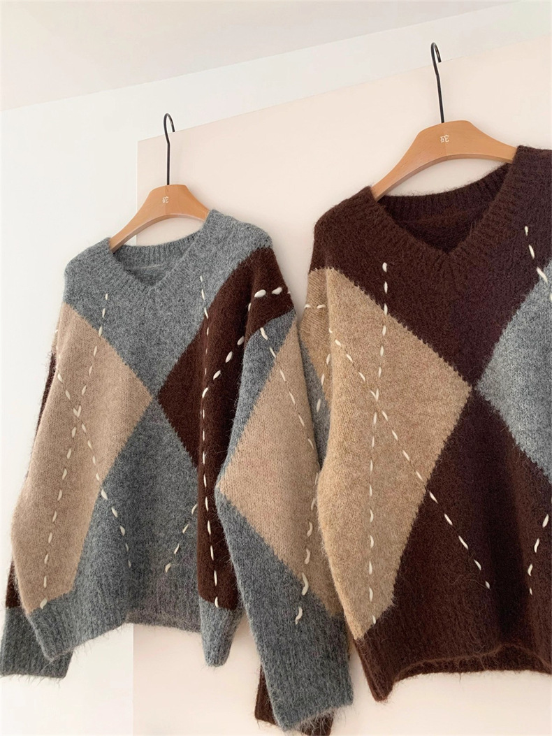 2025 秋冬新韓国レトロ菱形セーター女性のメイラード明線デザインプルオーバー V ネックニットトップ