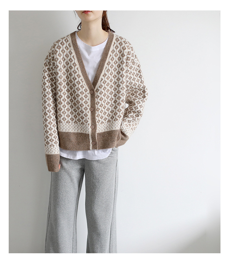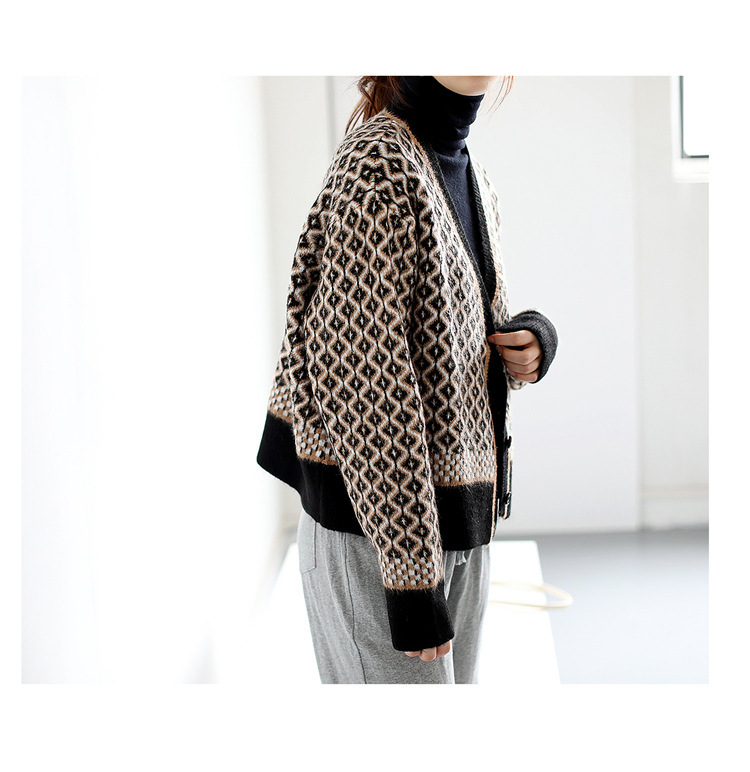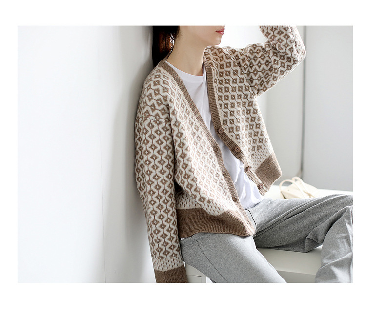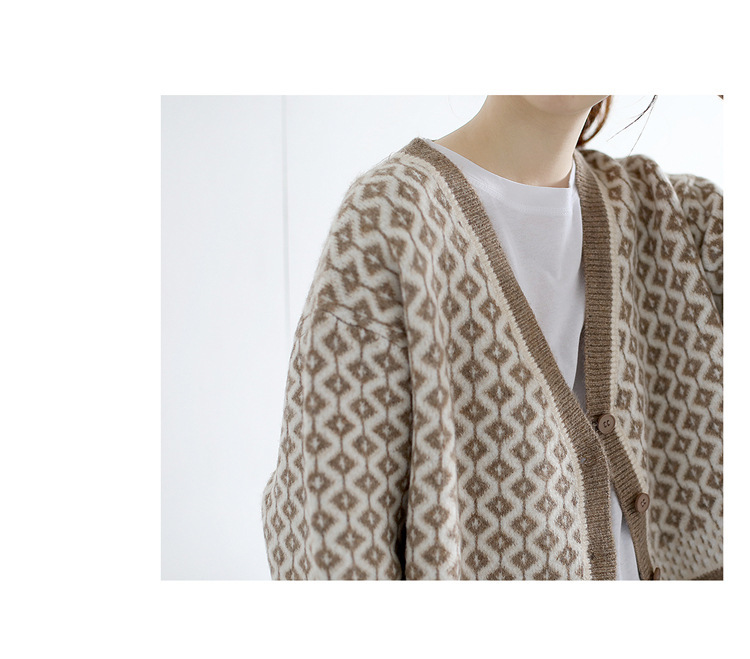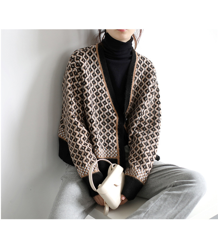 2023秋冬の韓国版のレトロな気質は色のメリヤスのカーディガンのvネックの菱格の厚いゆったりしているセーターの女性の上着にぶつかります。