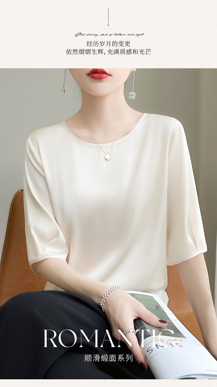 通気性シルクサテン 2025 春夏新作レディースラウンドネックルーズソリッドカラーアセテートサテン多用途 Tシャツトップ