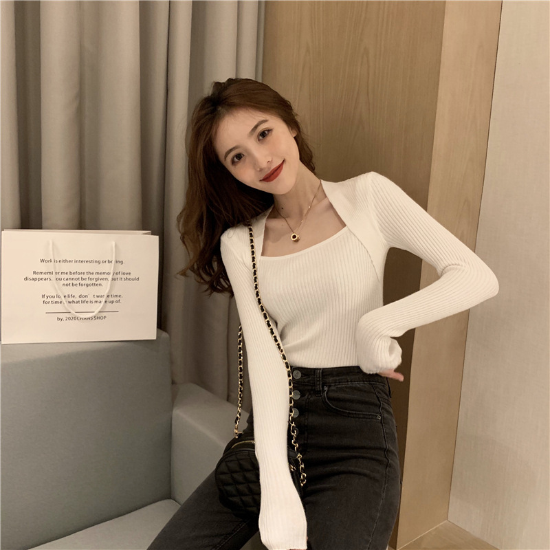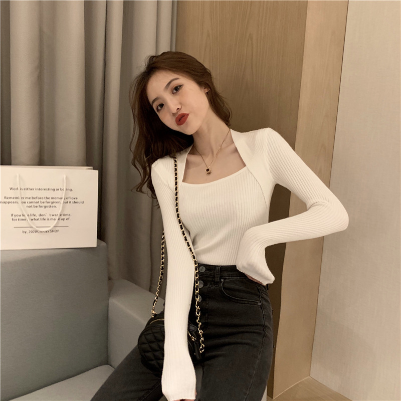セーターの女性の中に2025秋冬の新型の気質の偽の2つのU襟の修身のニットの服はやせているchiの底のシャツを現します。