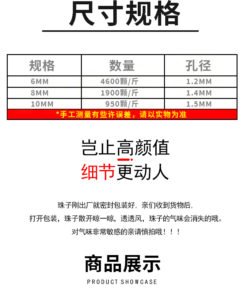 4mm角ビーズ(約15550個/斤),6mm (4600個/斤),8mm (1900個/斤),10mm(950個/斤)