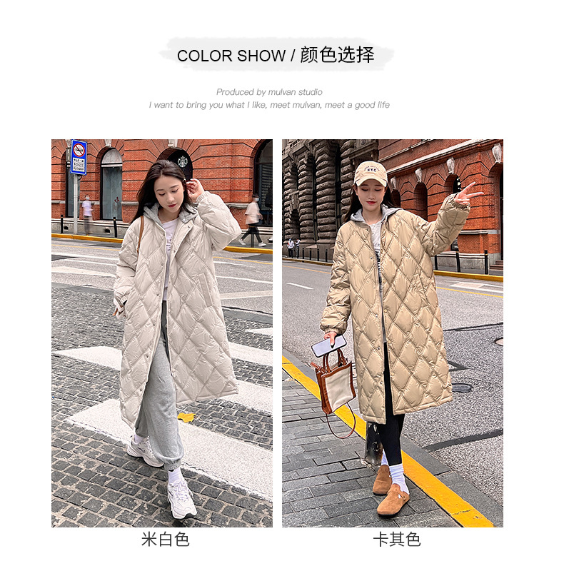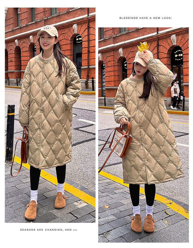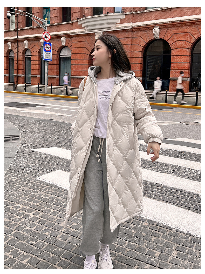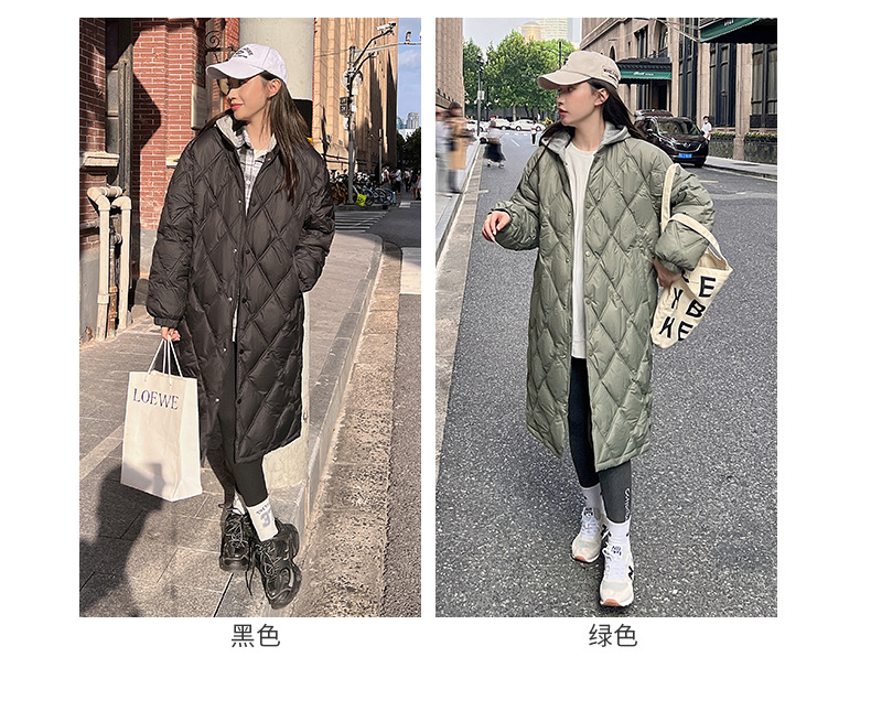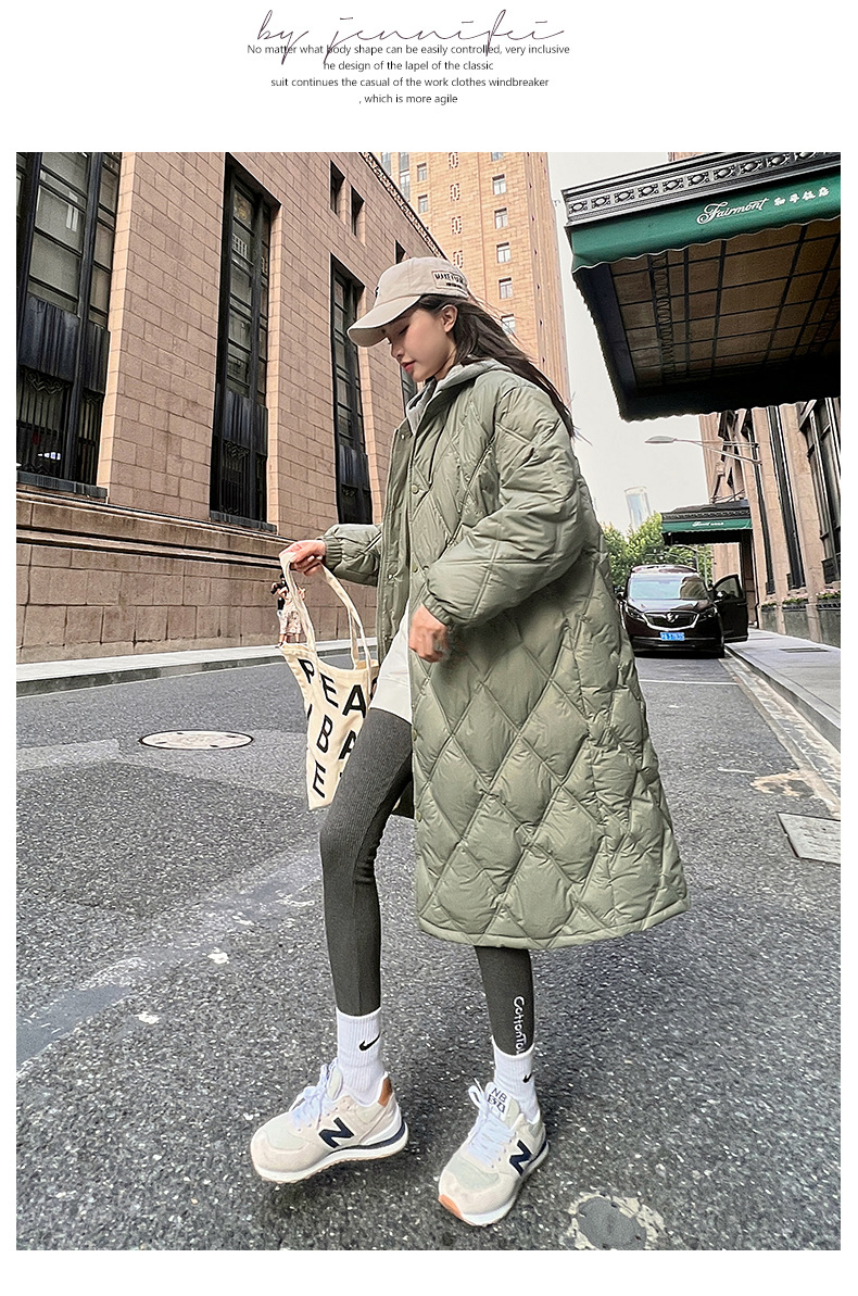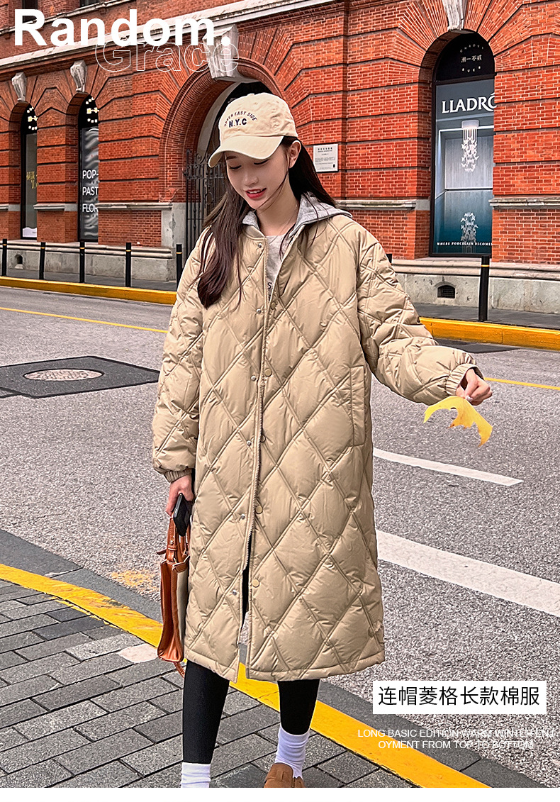 菱格綿服の女性の中の長さの冬2024の新型の膝の生きている帽子のoversize港の風のゆったりしているダウンの綿入れの潮
