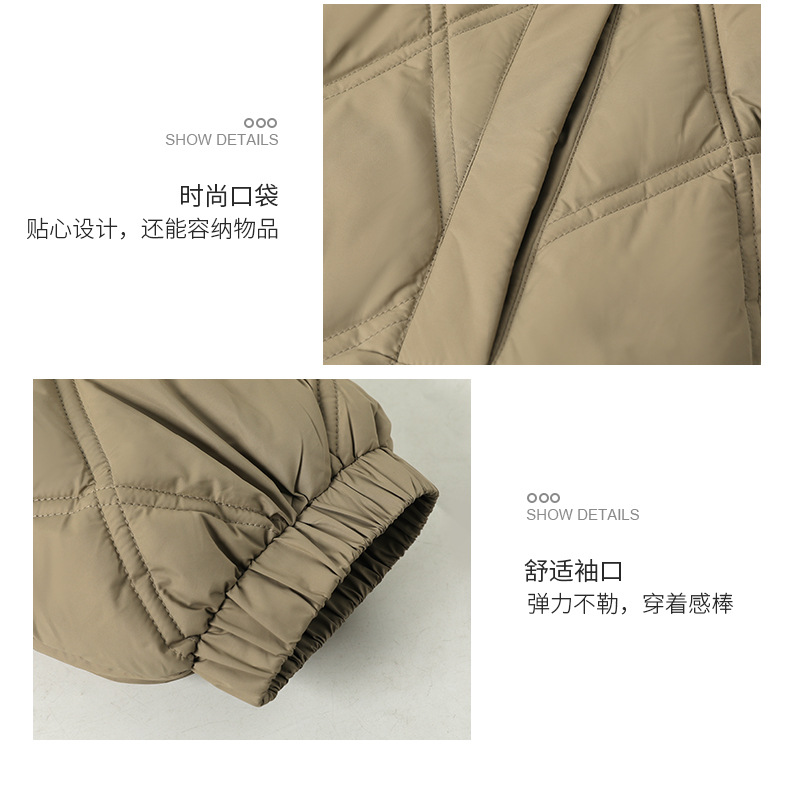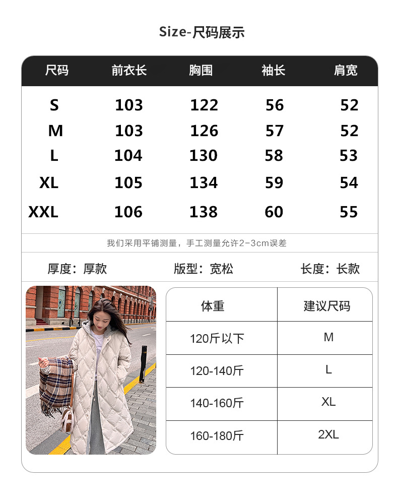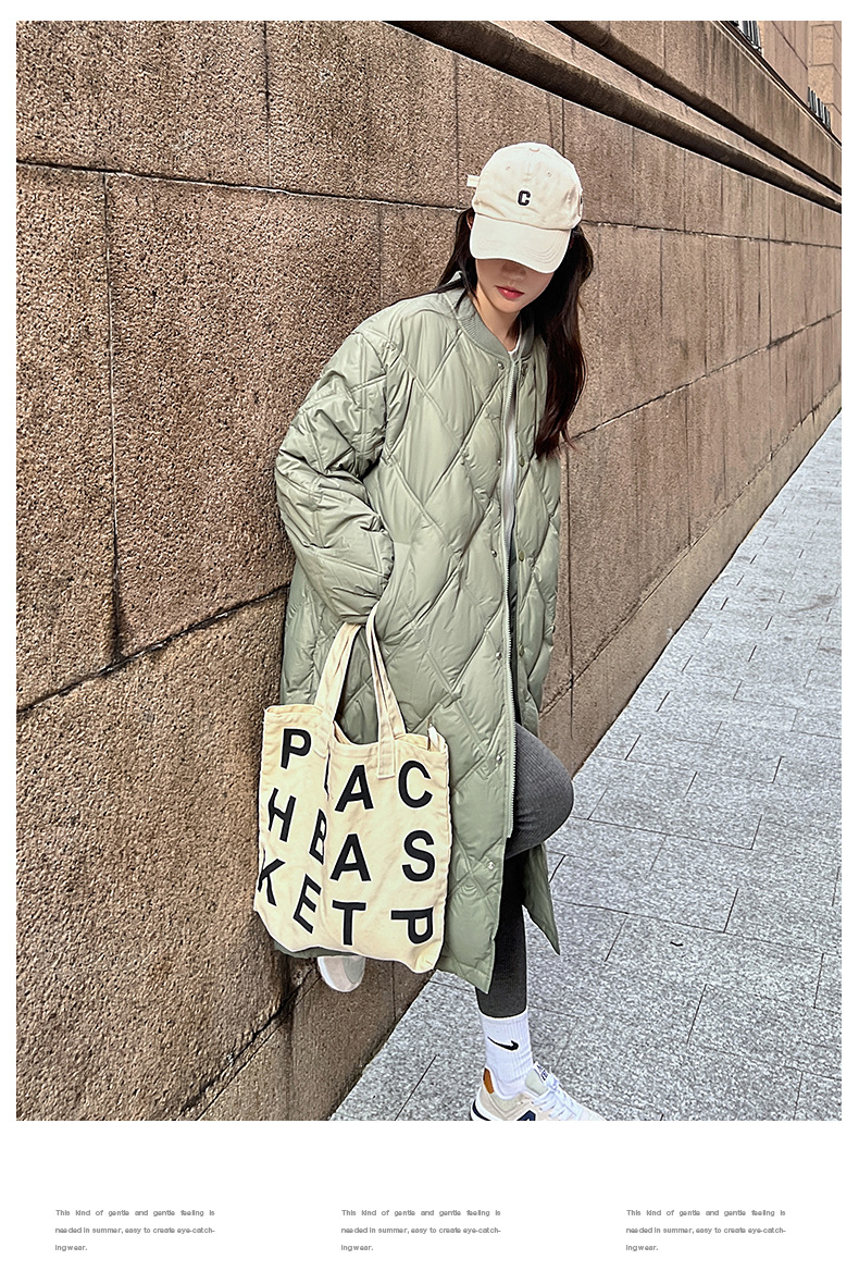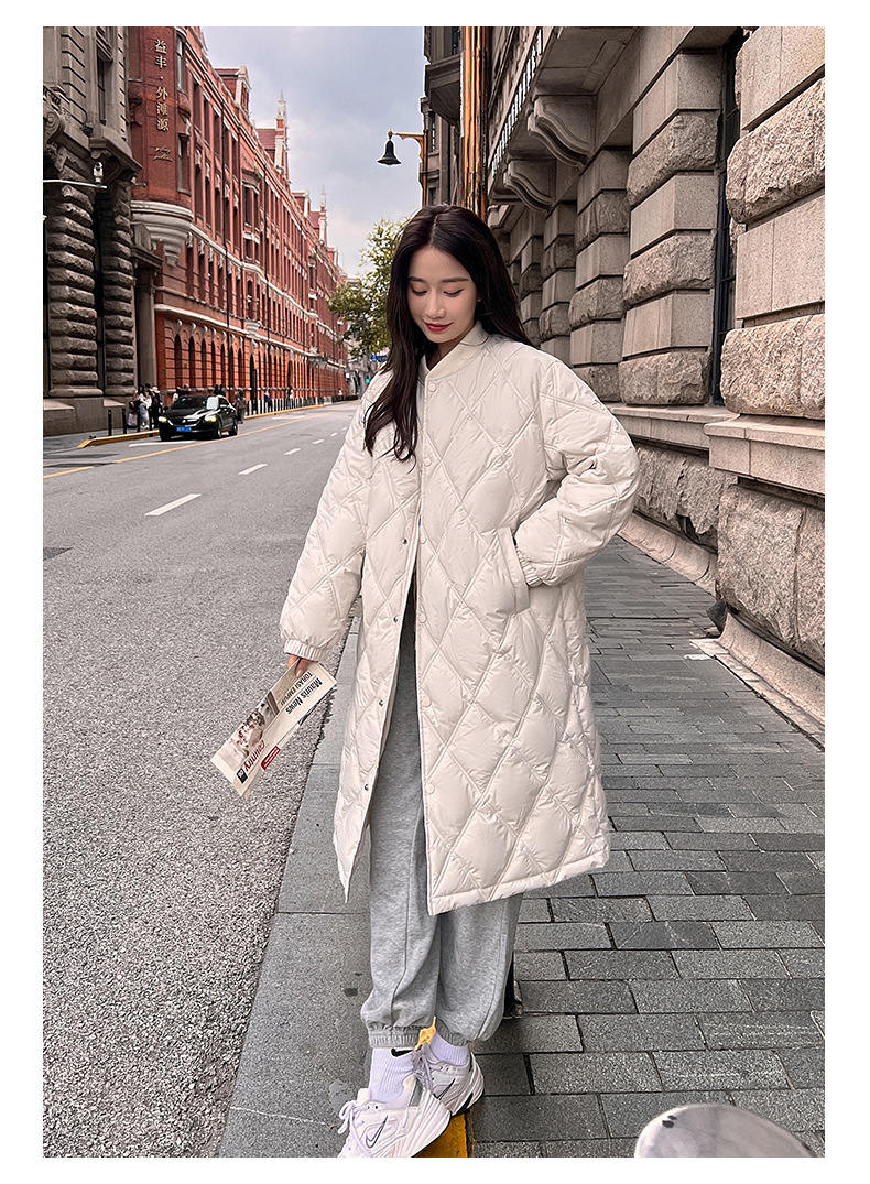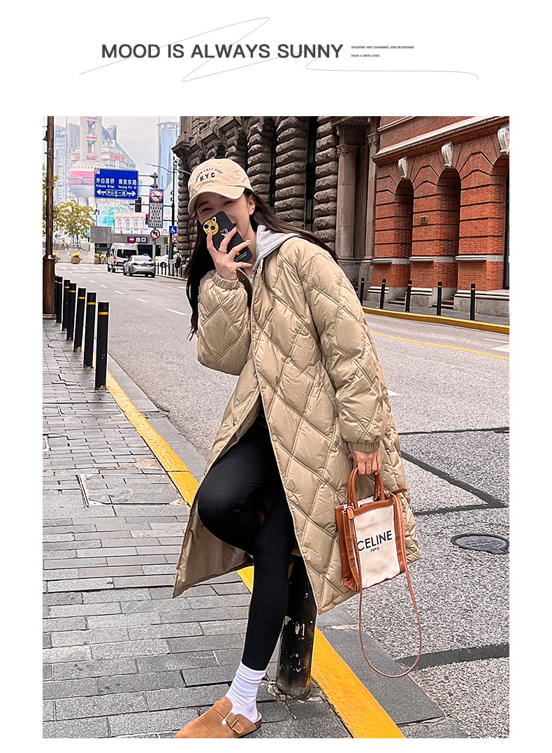 菱格綿服の女性の中の長さの冬2024の新型の膝の生きている帽子のoversize港の風のゆったりしているダウンの綿入れの潮