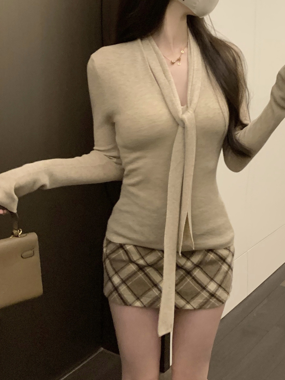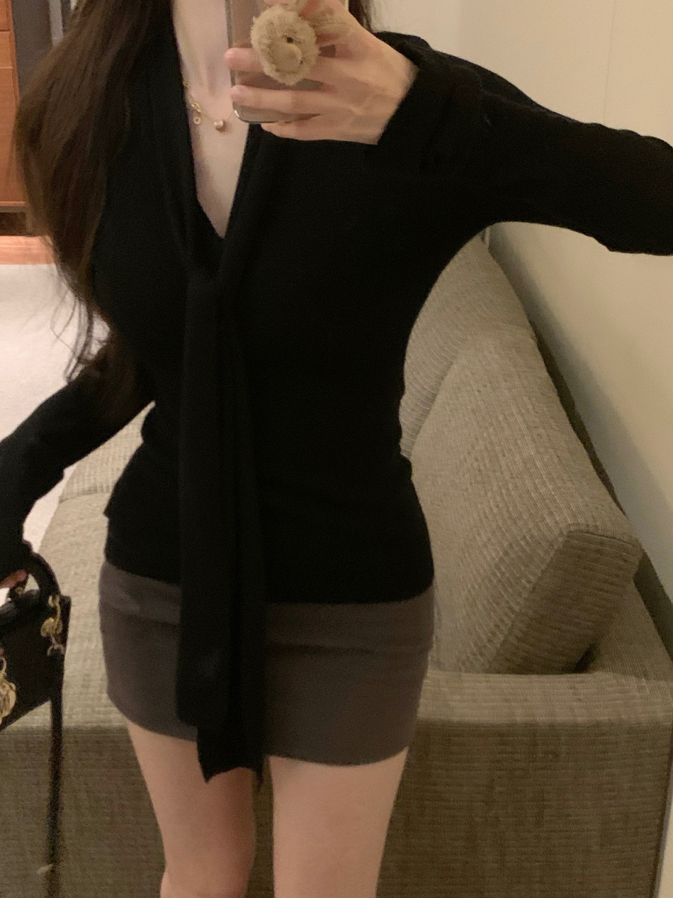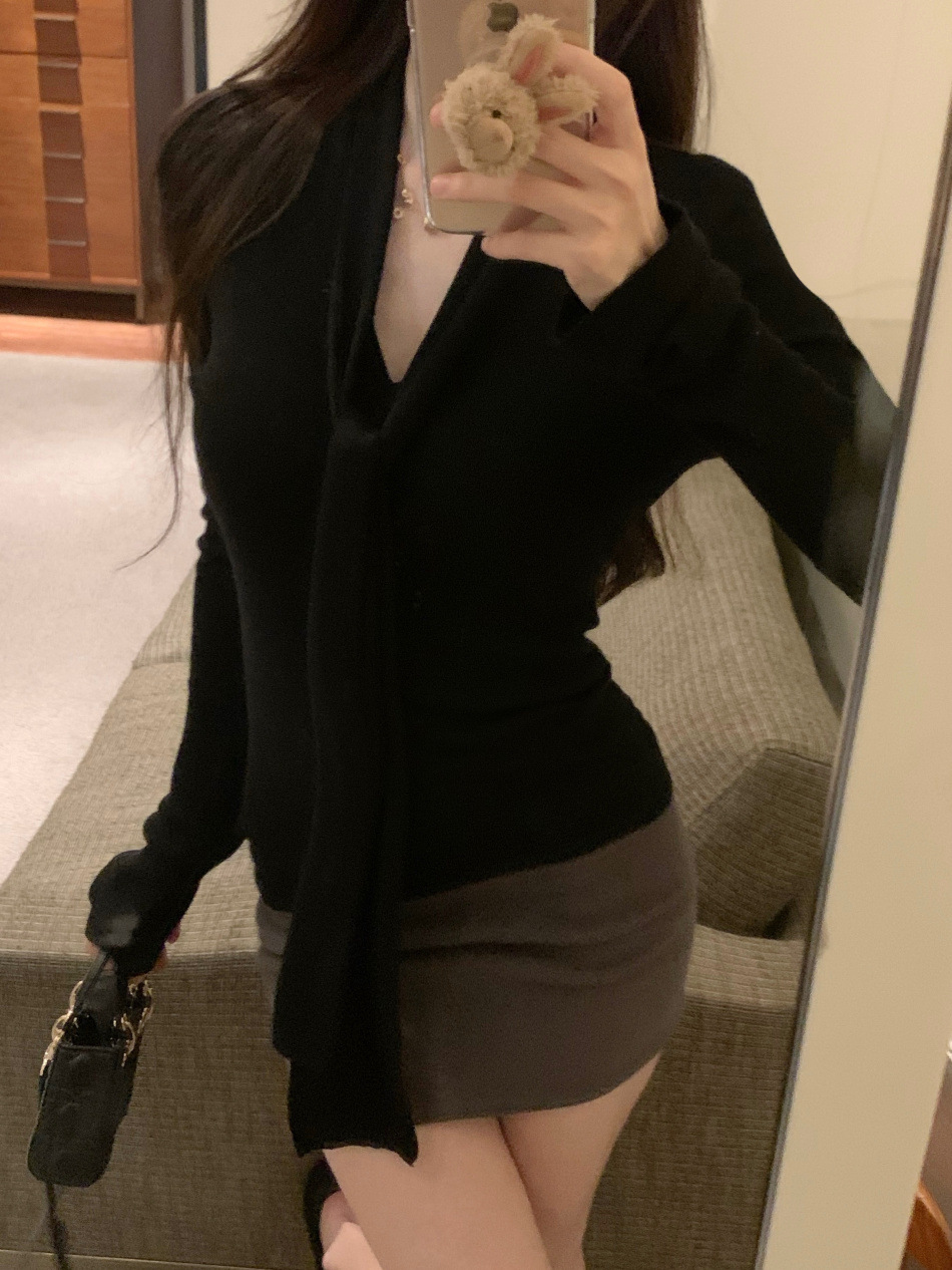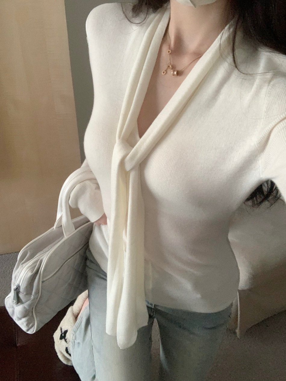5110#内搭打底纯欲风V领针织衫女2023秋冬新款修身毛衣温柔上衣