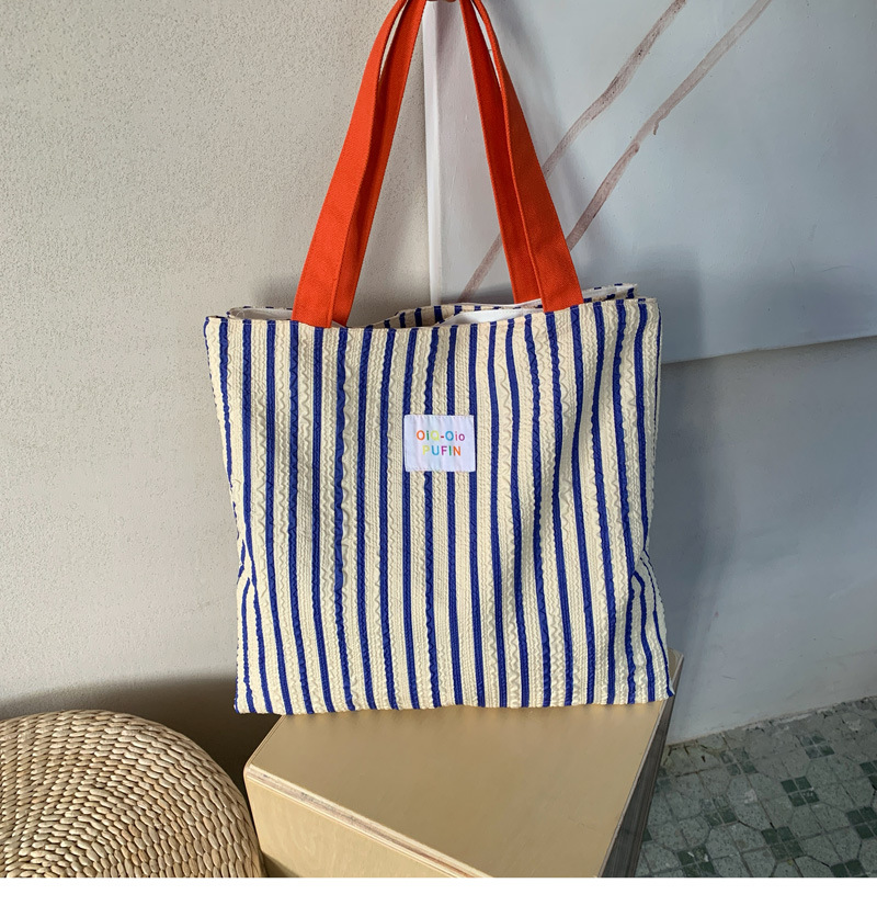 ダブルオレンジの肩に青いストライプのキャンバスバッグがついています。