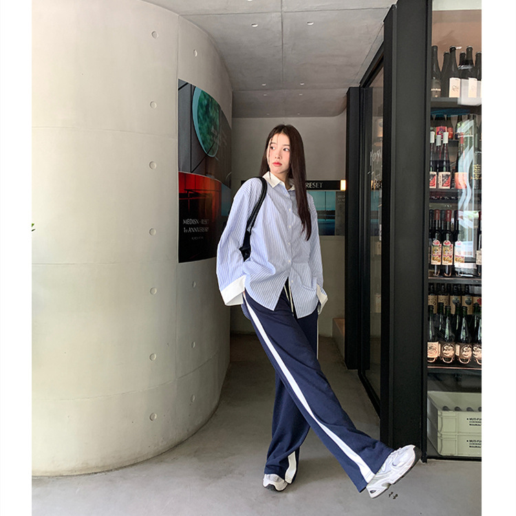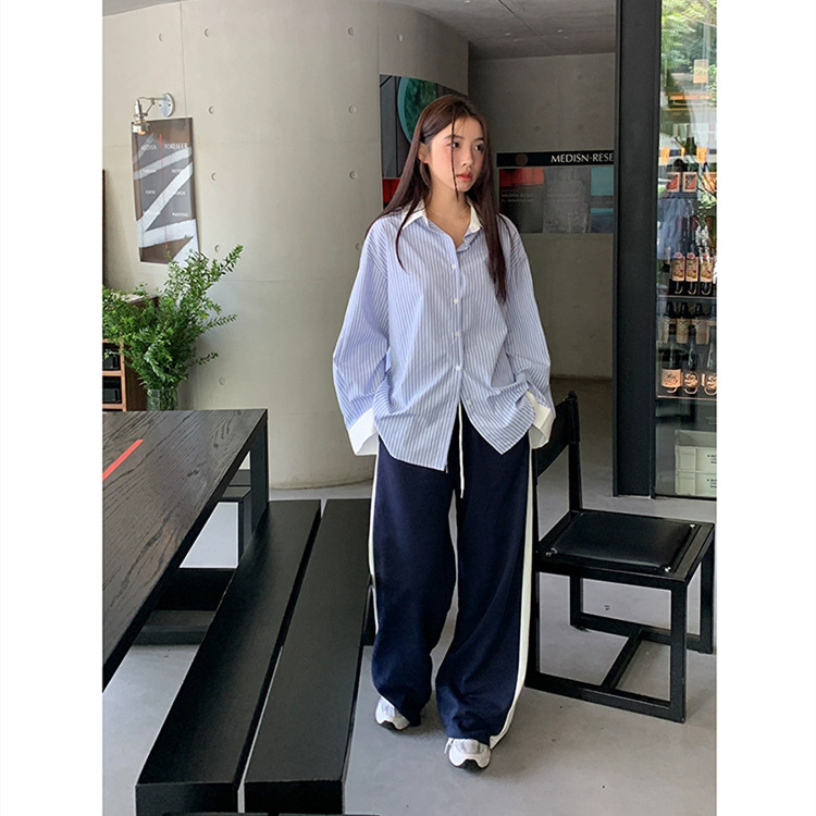 青と白のストライプは色の長袖のシャツの女性にぶつかります。