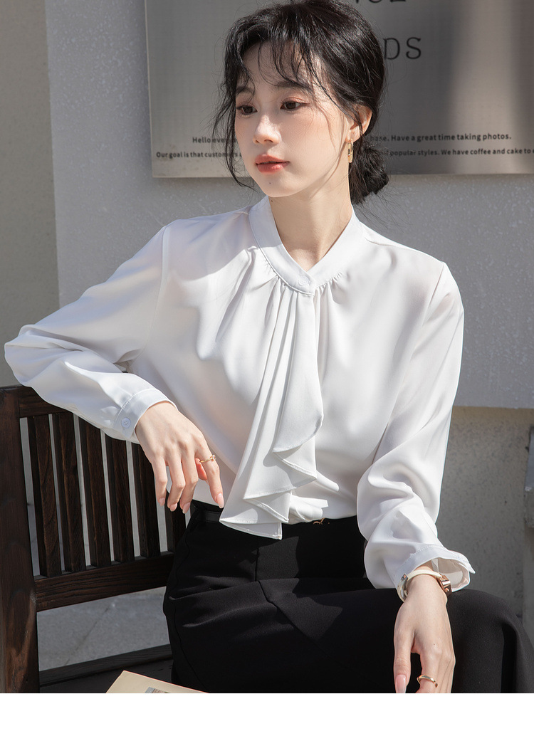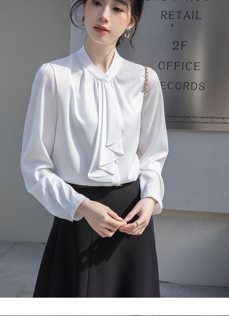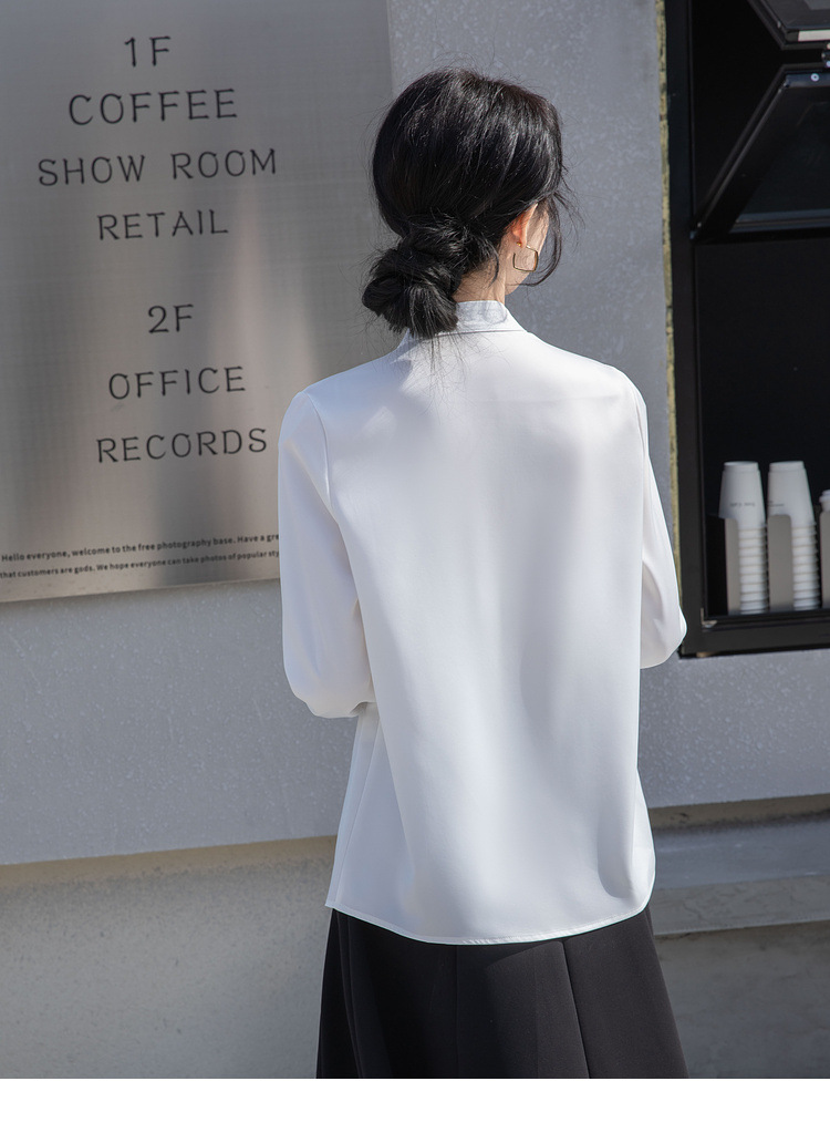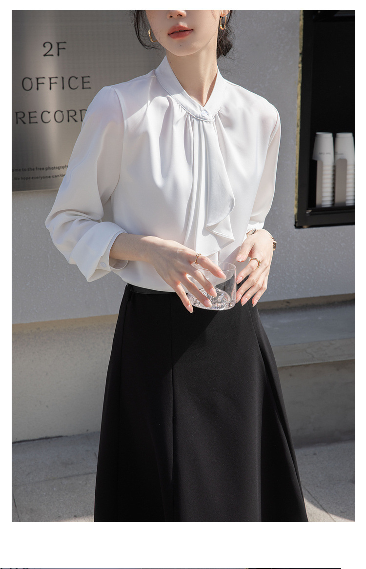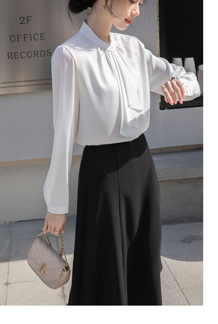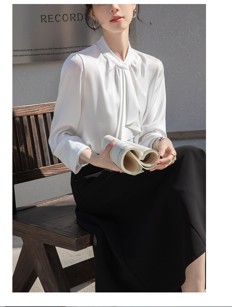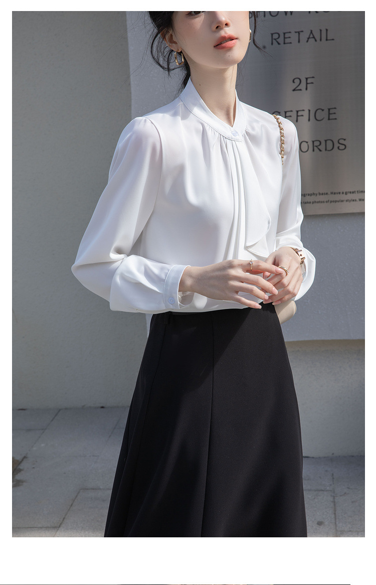 フレンチエレガントデザインの蝶ネクタイ付き2025春秋白長袖シャツ、女性らしい通勤用オフィスシャツ