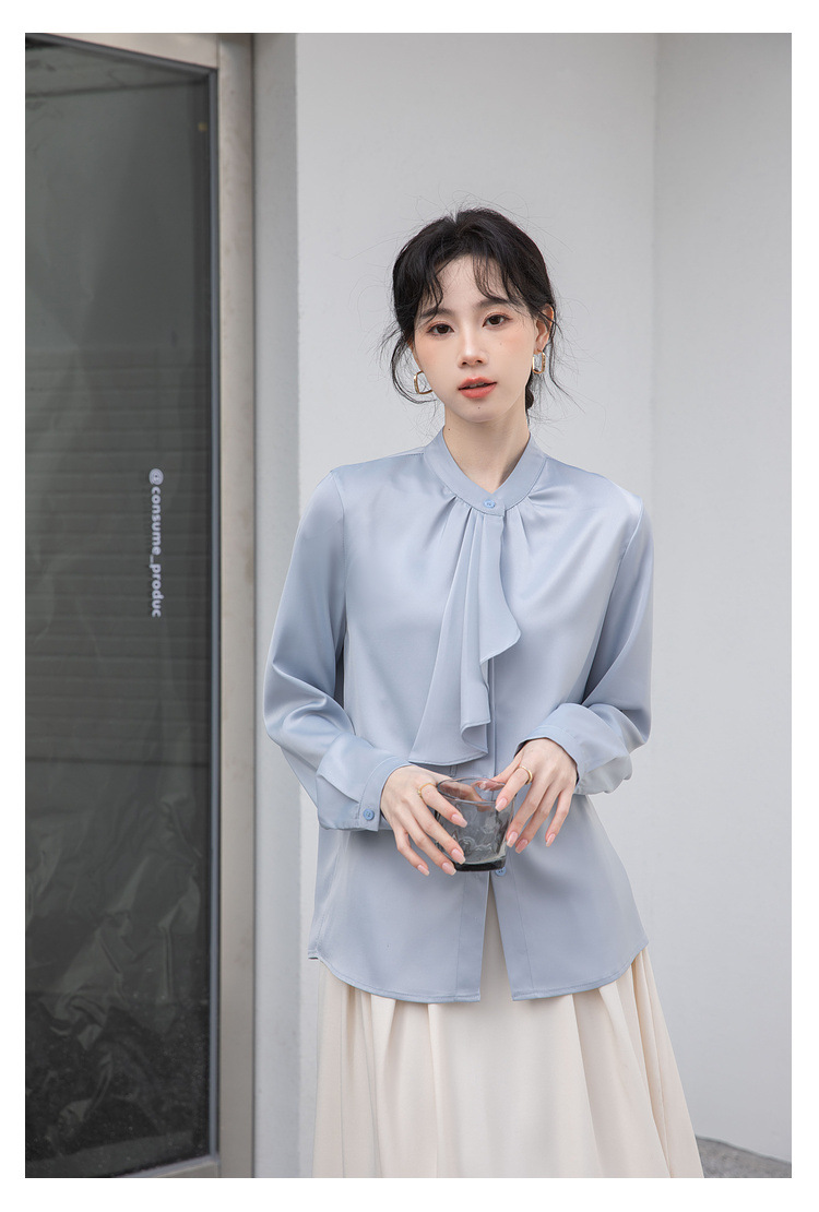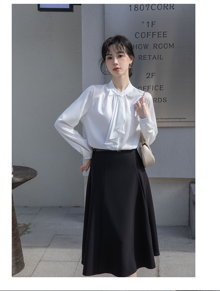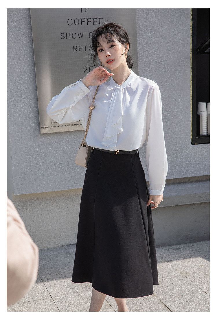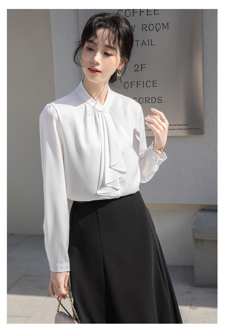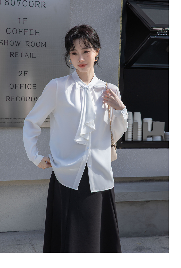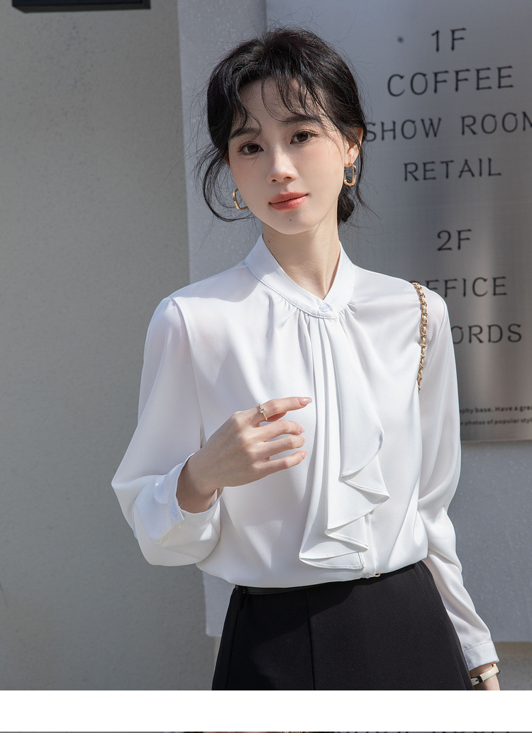 フレンチエレガントデザインの蝶ネクタイ付き2025春秋白長袖シャツ、女性らしい通勤用オフィスシャツ