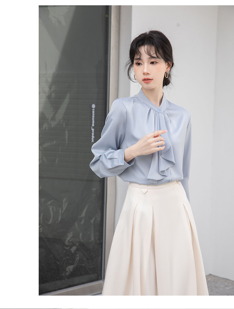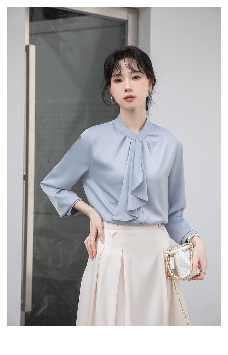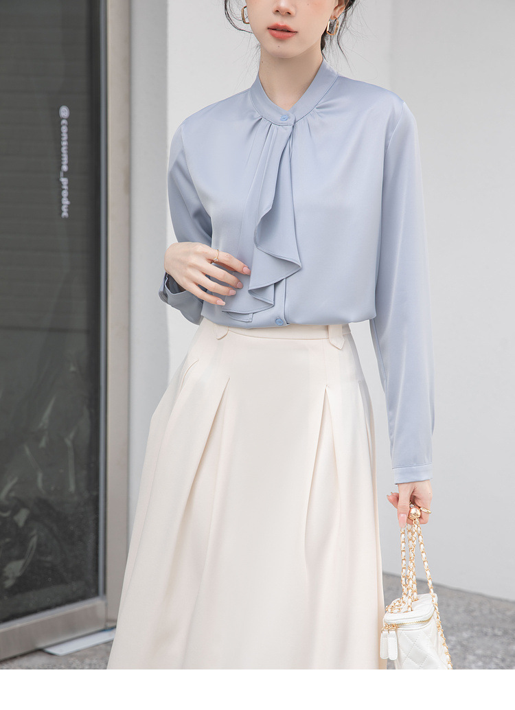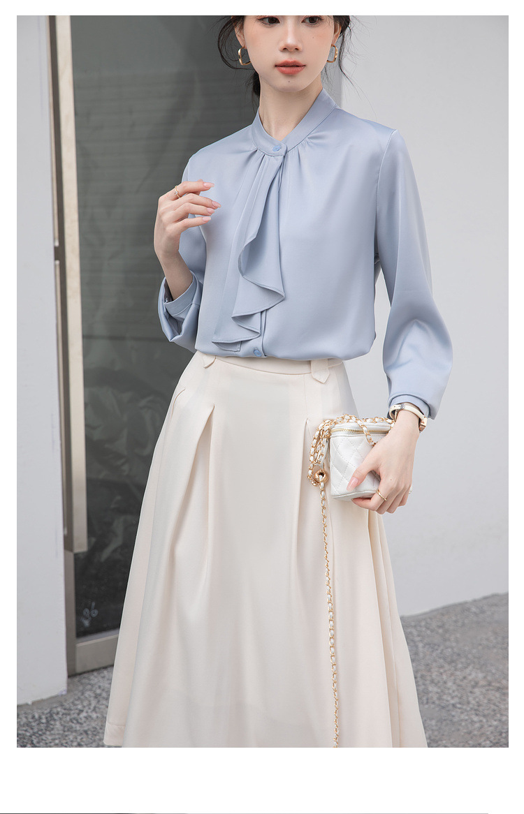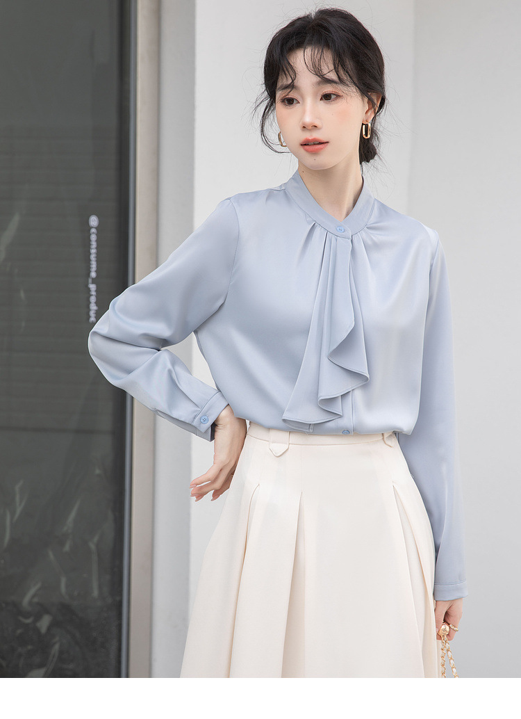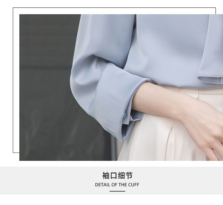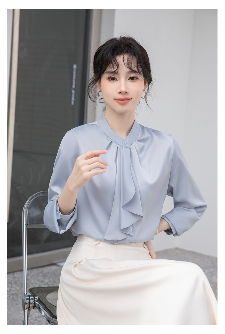 フレンチエレガントデザインの蝶ネクタイ付き2025春秋白長袖シャツ、女性らしい通勤用オフィスシャツ
