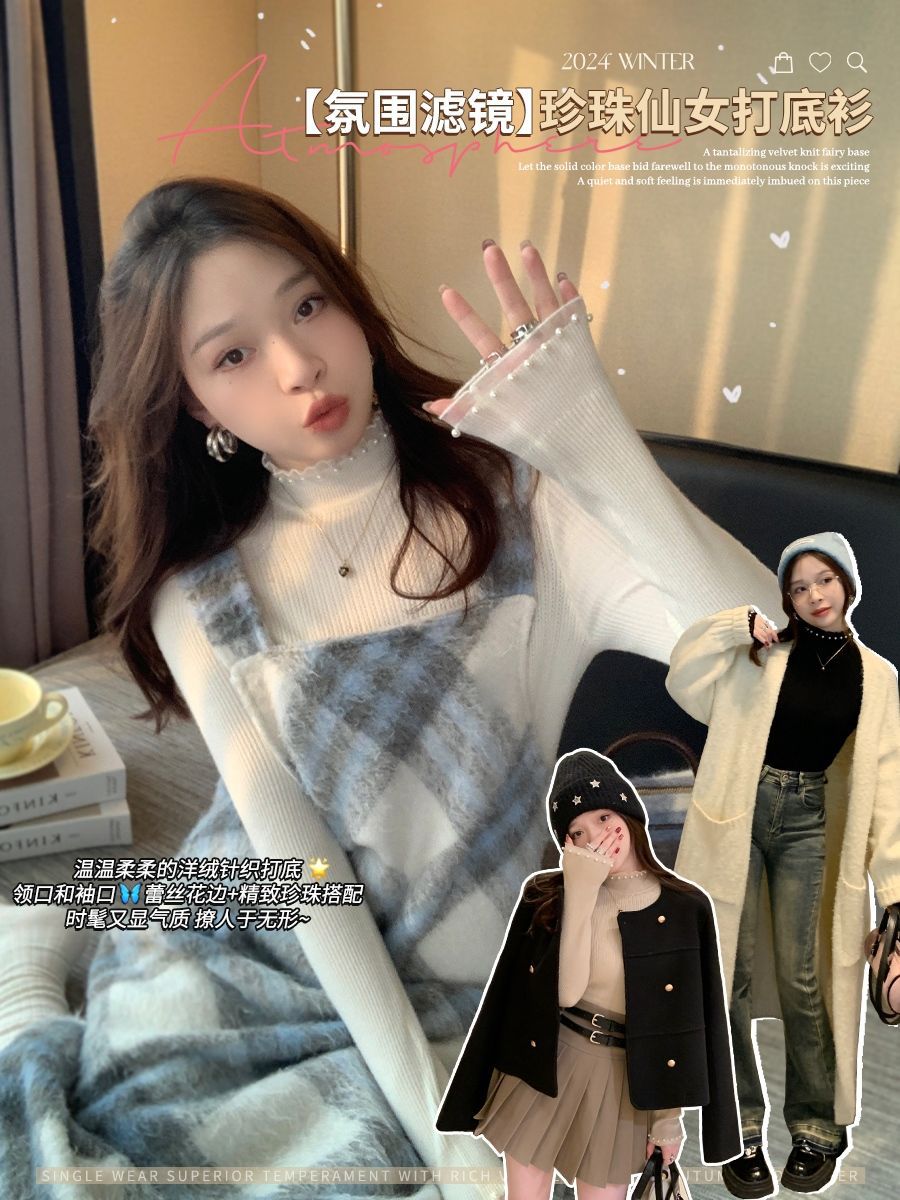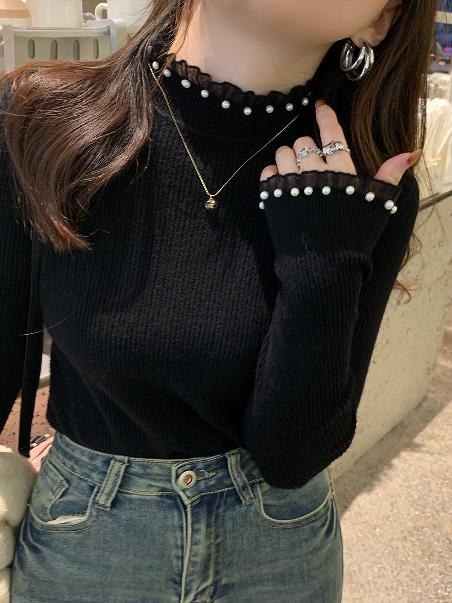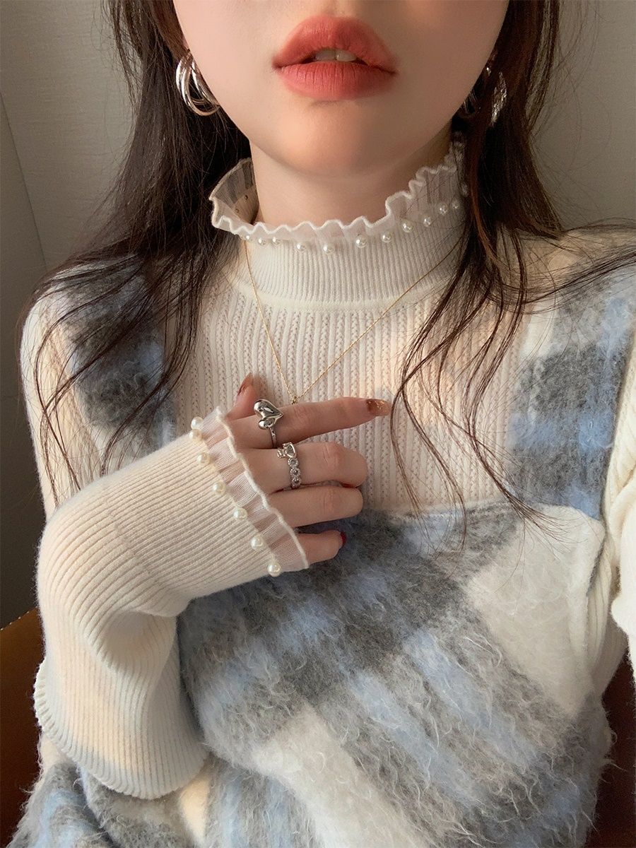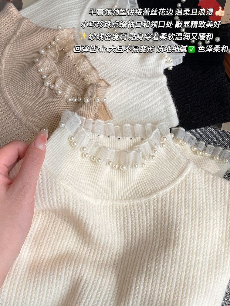 女性用レースボトムシャツ、2025年春秋新作スタイルセーター、女性用タートルネックトップ、小香風セーター