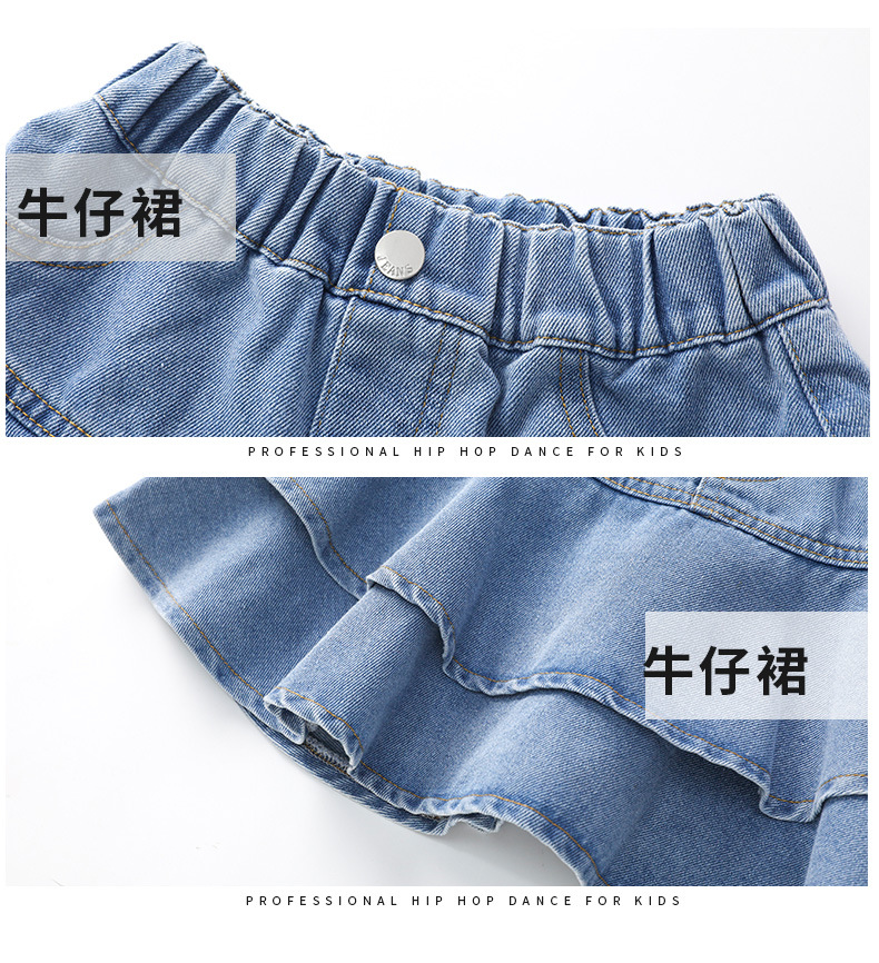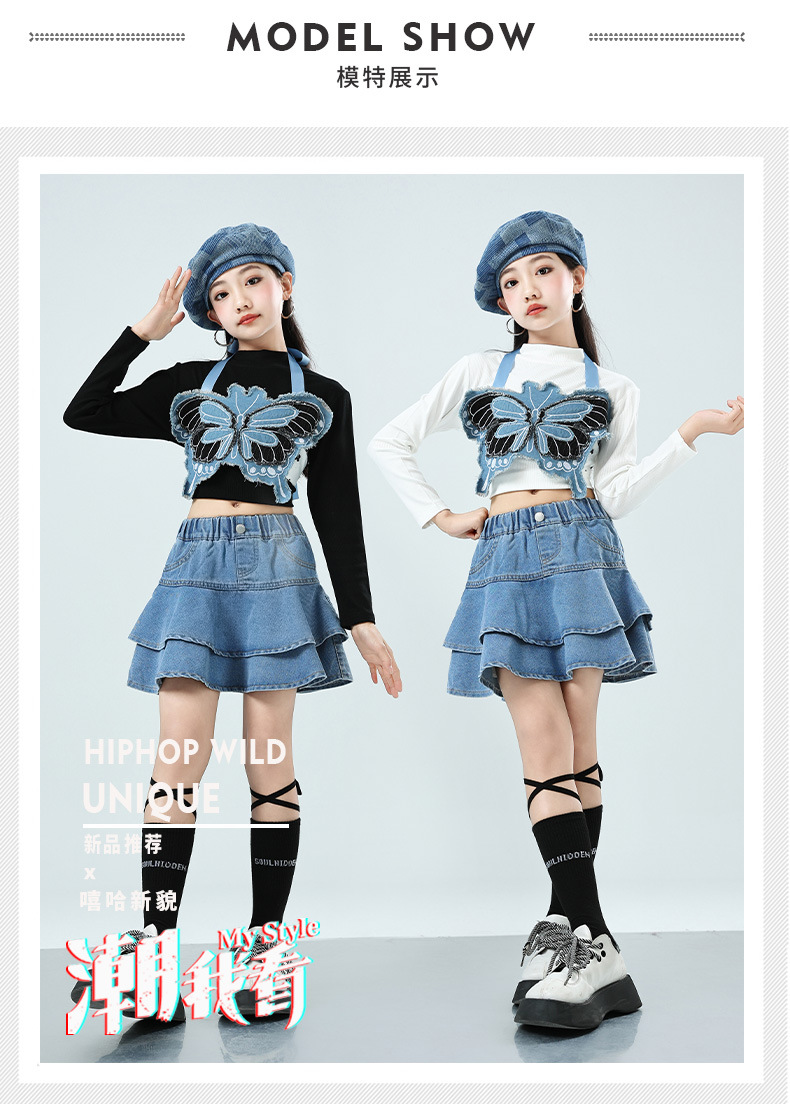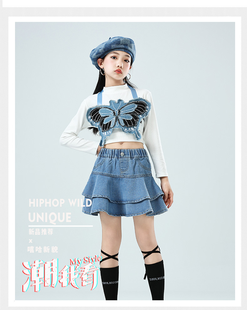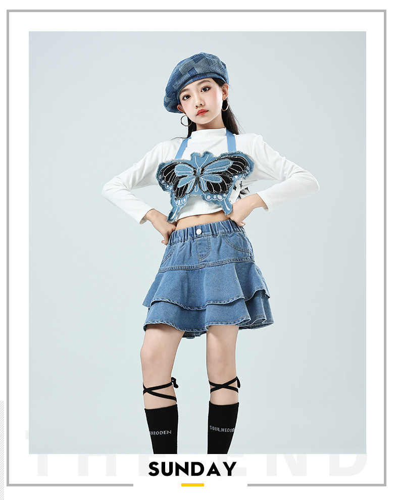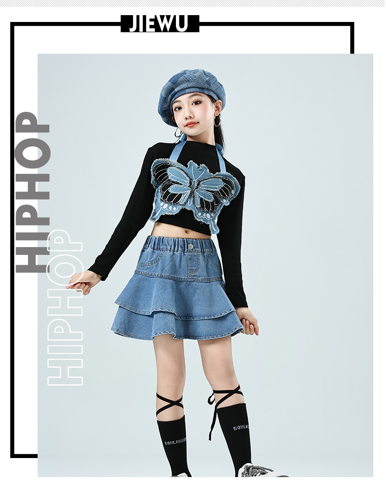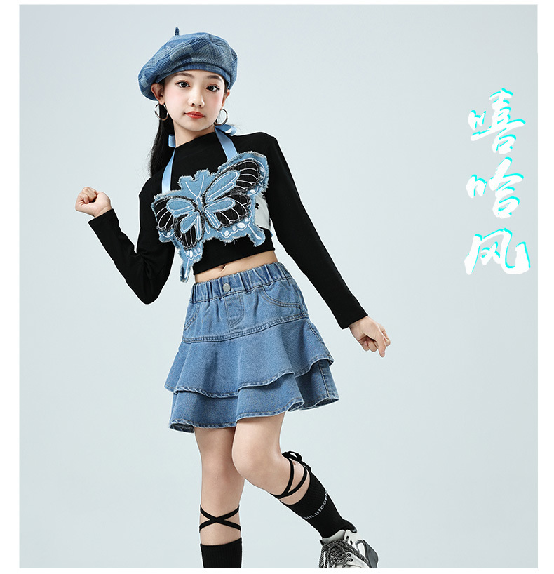 デニム蝶々 + 純黒長袖 + デニムスカート