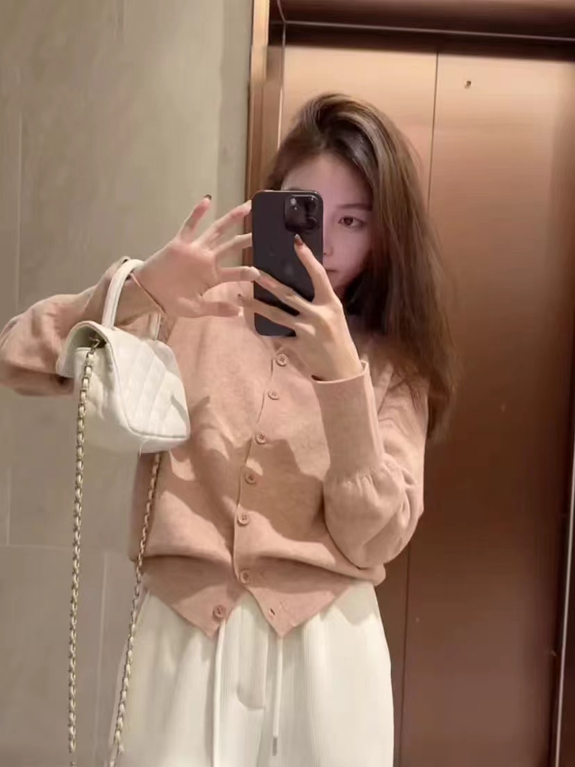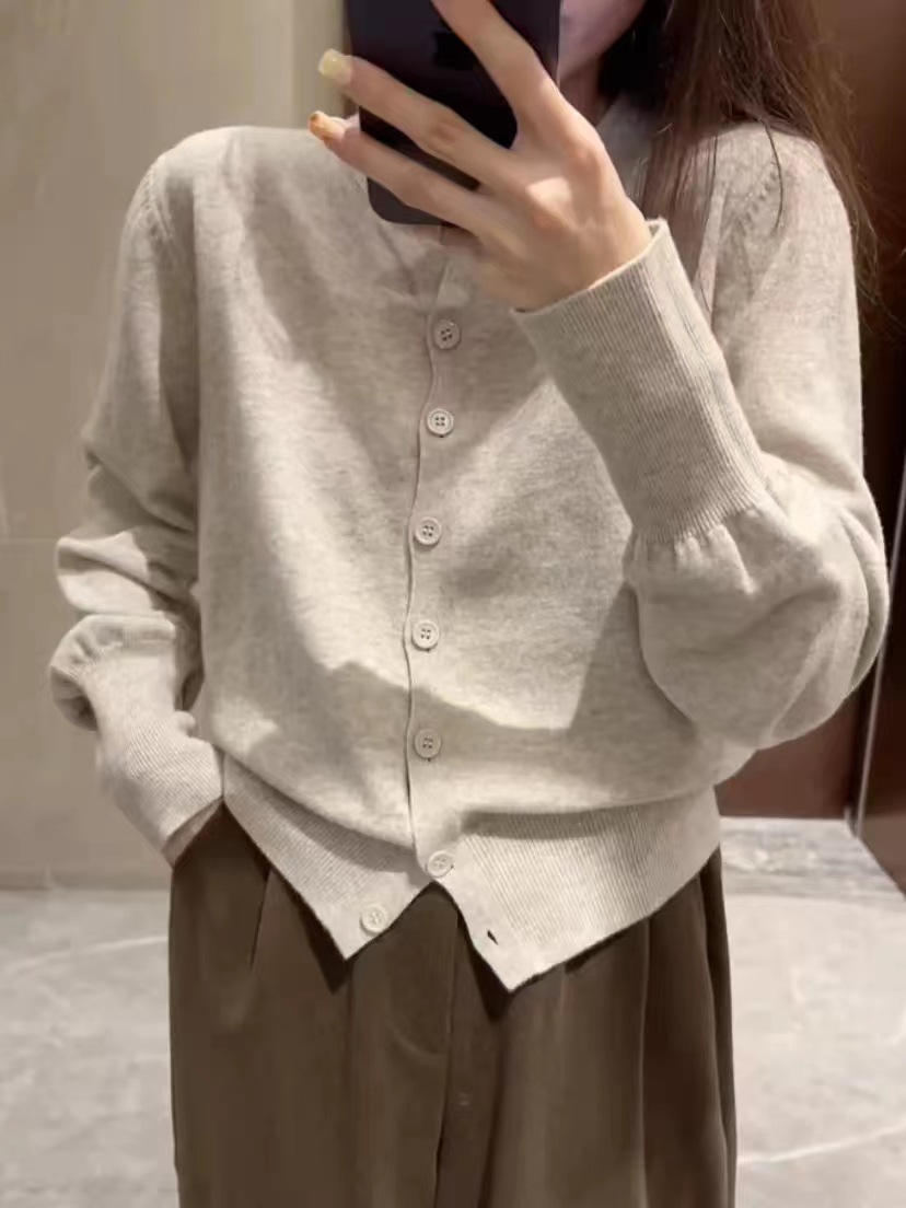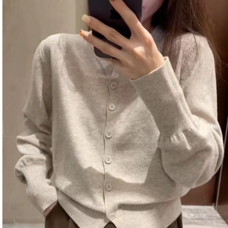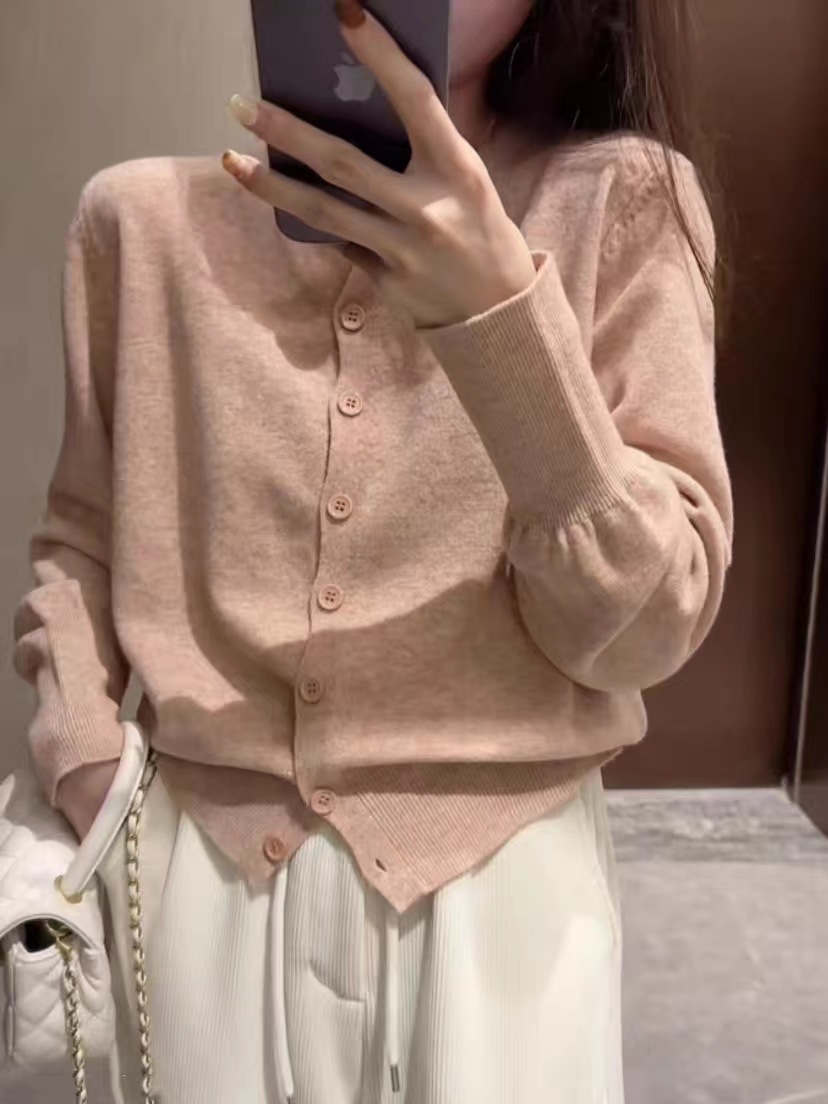 乳系の優しいショートニットのカーディガン女性の春秋気質の中にセーターのコートを着て、年齢を減らします。