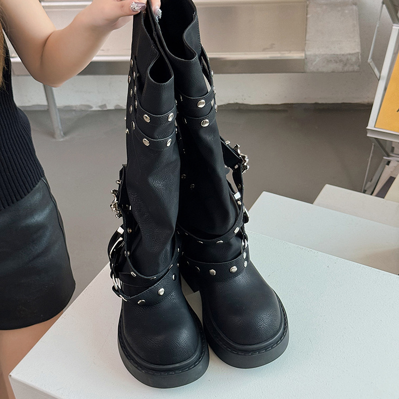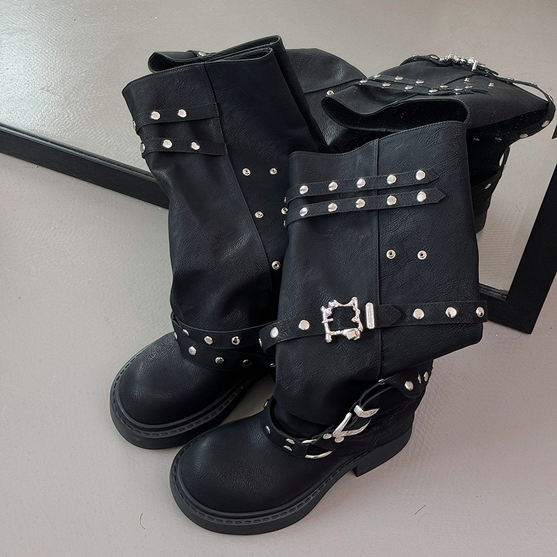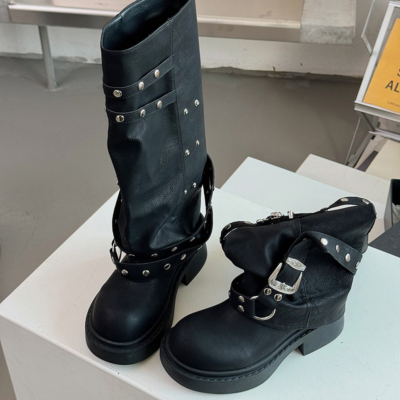 リベットの黒い高筒のズボンの靴の女性の2024年の新型の丸い頭の小さい大衆の設計感の厚い底の長靴の騎士の靴