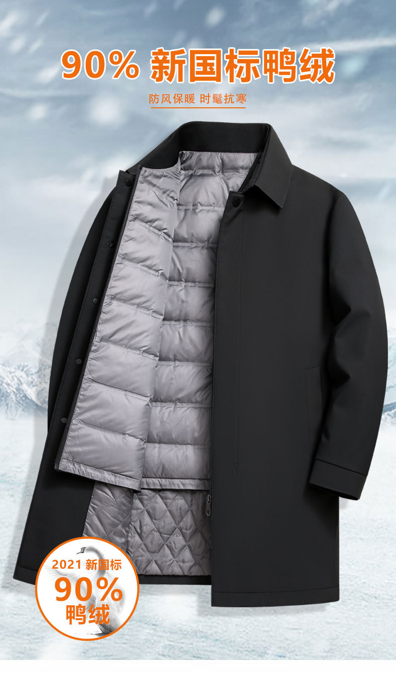 2025年冬90%ホワイトダックダウンメンズミドル丈ラペルカジュアルウインドブレーカーダウンジャケット(取り外し可能なインナーライナー付き)