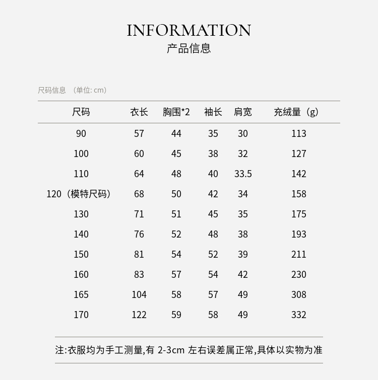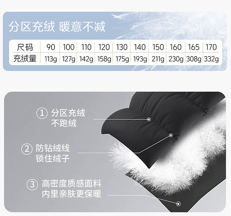 サイズ90のダウン充填量[113g],100ヤードダウン充填[127g],サイズ110 ダウン充填量[142g],サイズ120 ダウン充填量[158g],サイズ130 ダウン充填量[175g],サイズ140 ダウン充填量[193g],サイズ150ダウン充填量[211g],サイズ160 ダウン充填量[230g],ママ向け165サイズ、ダウン充填量【308g】,ママ向け170サイズ、ダウン充填量【332g】