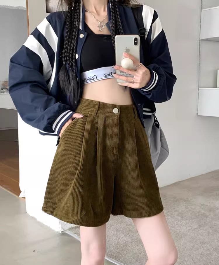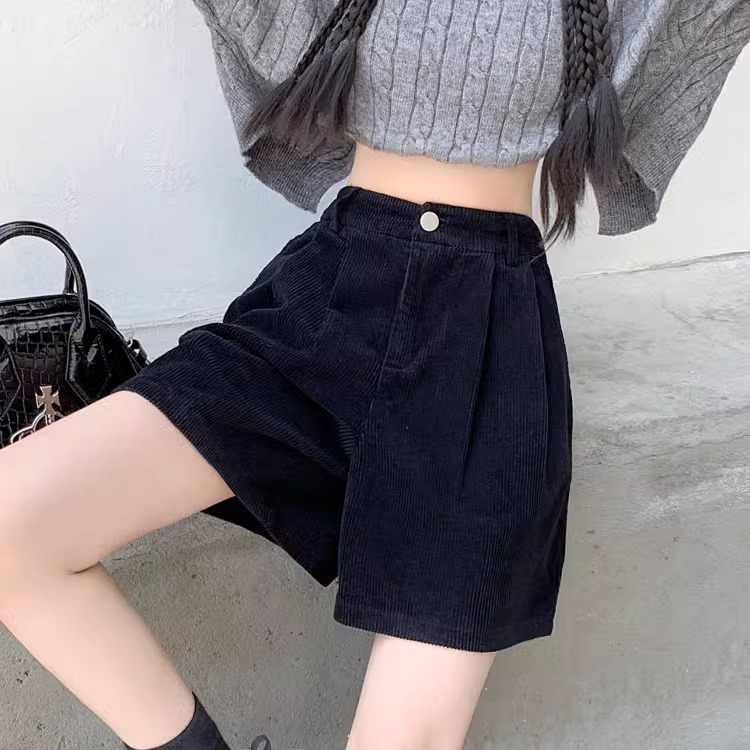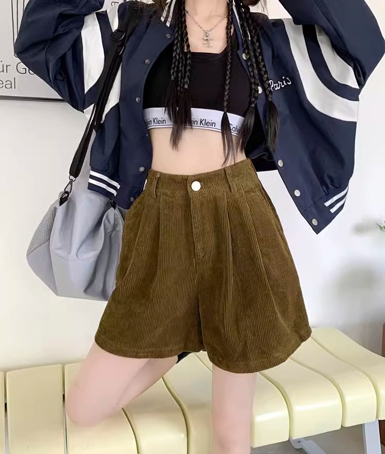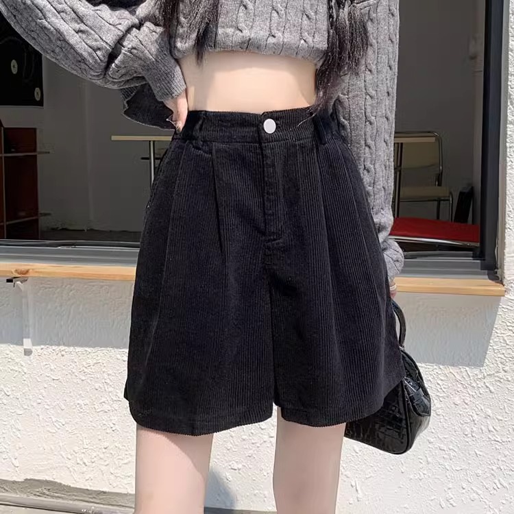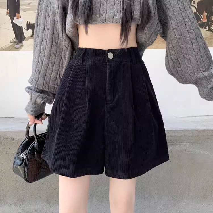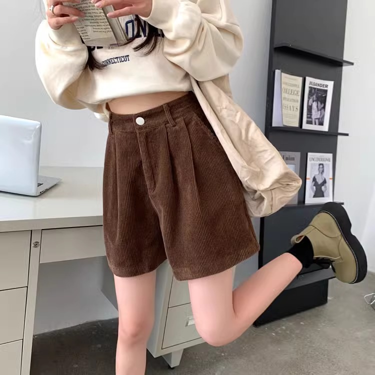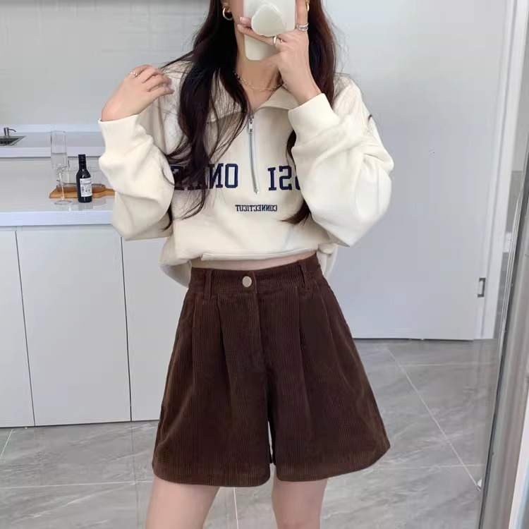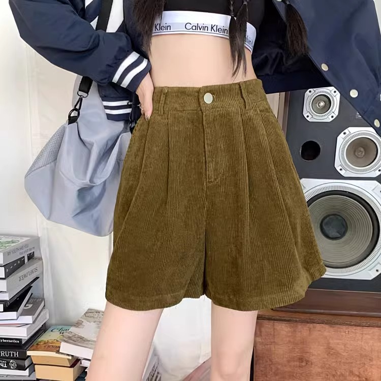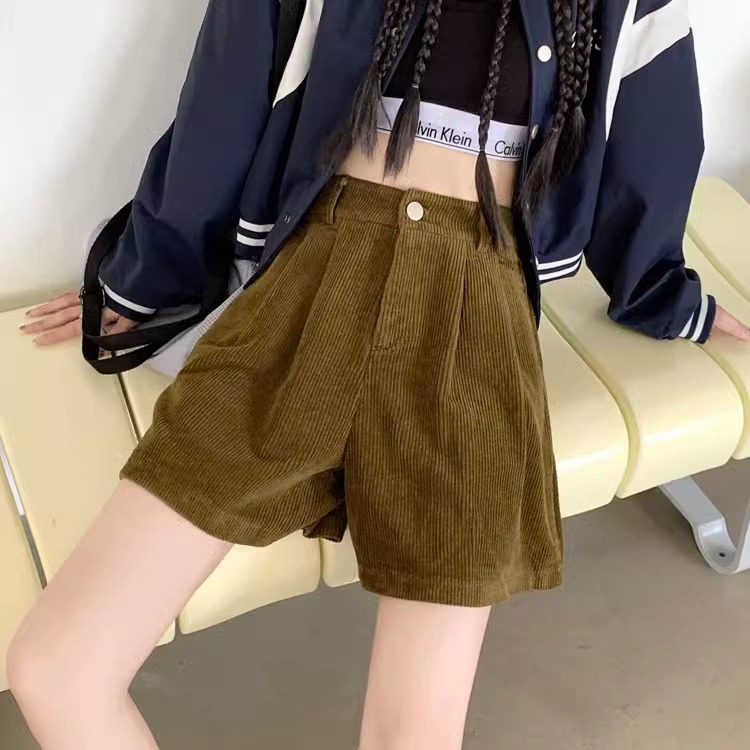 2025 新しい複合ミルクシルクコーデュロイショーツ女性の秋のハイウエスト A ラインワイドレッグパンツカジュアル 5 分パンツ
