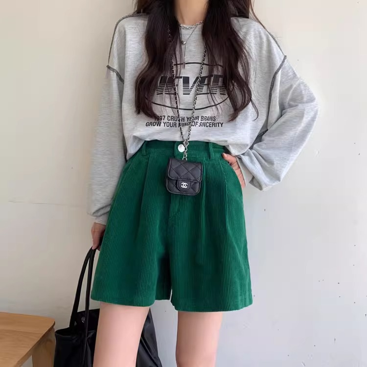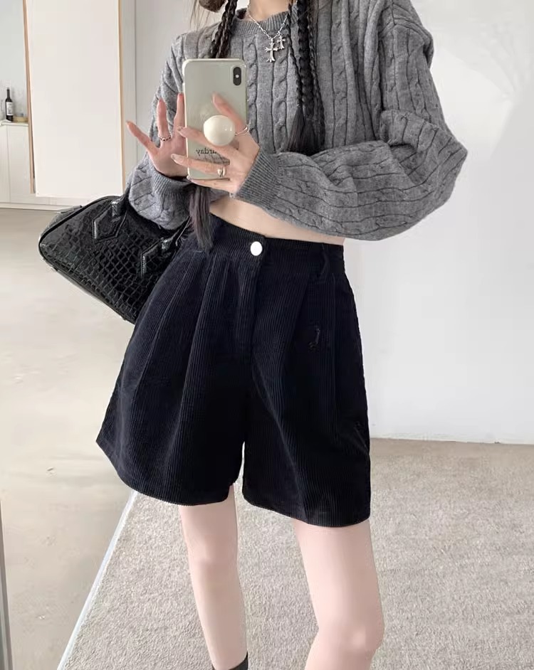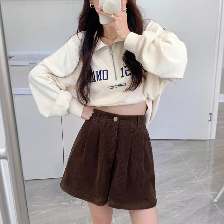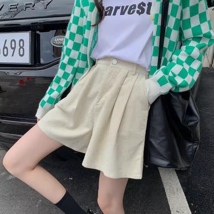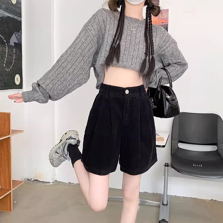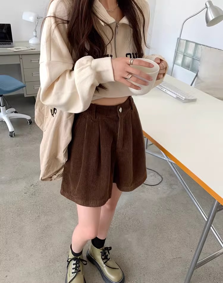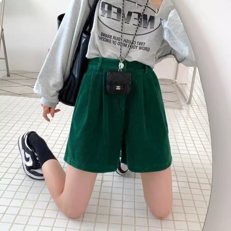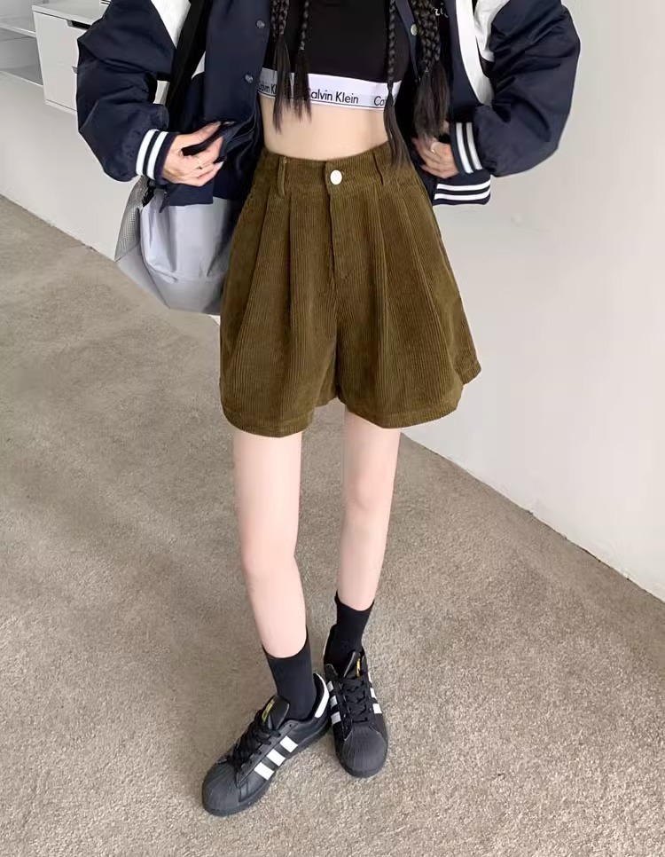 2025 新しい複合ミルクシルクコーデュロイショーツ女性の秋のハイウエスト A ラインワイドレッグパンツカジュアル 5 分パンツ