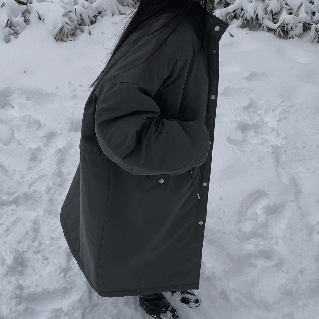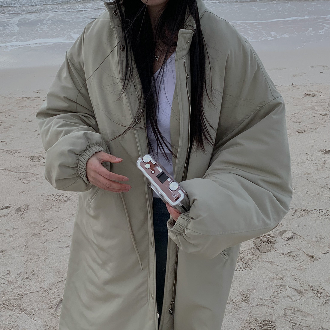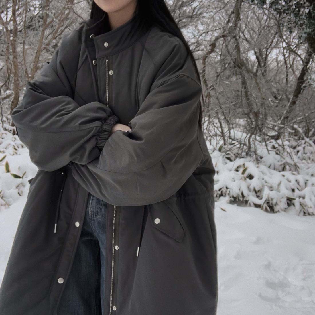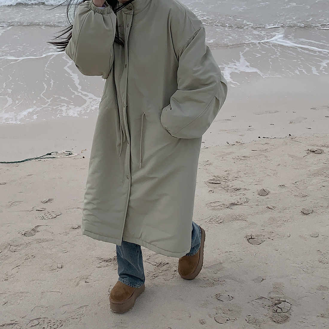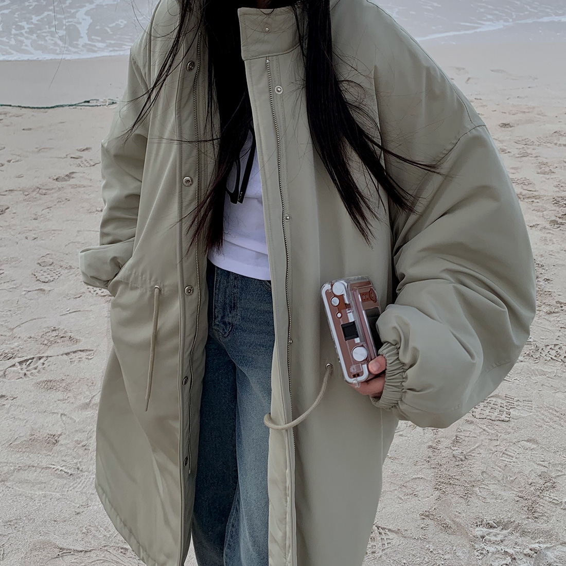韓国のchic冬の怠惰な風の工装パーカーのゆったりした大きいものは縄の立襟の綿入れの保温の綿入れの長いコートを引き出します。