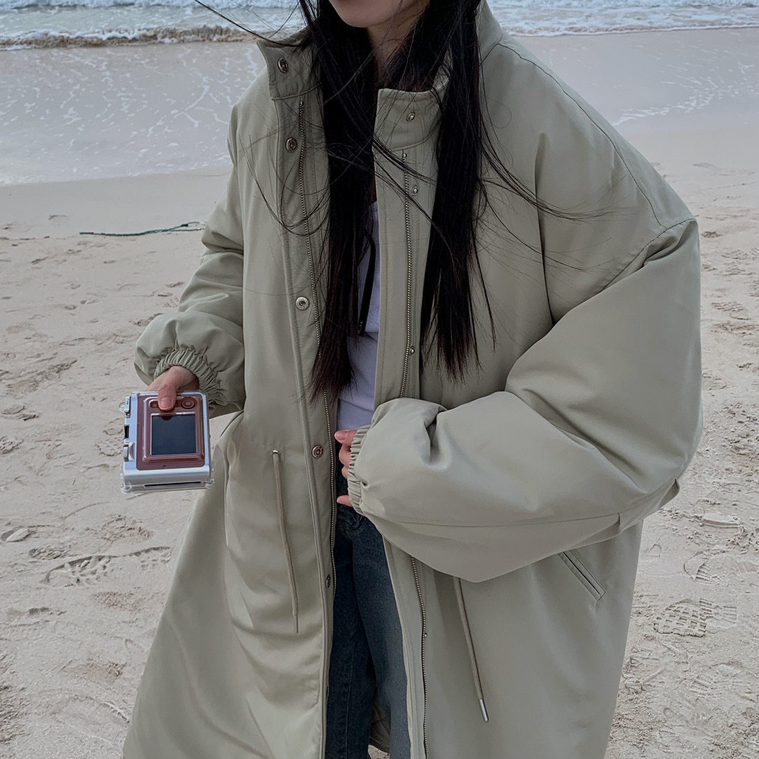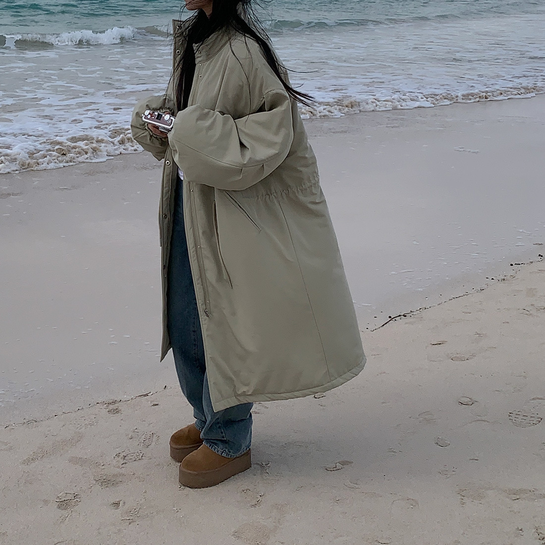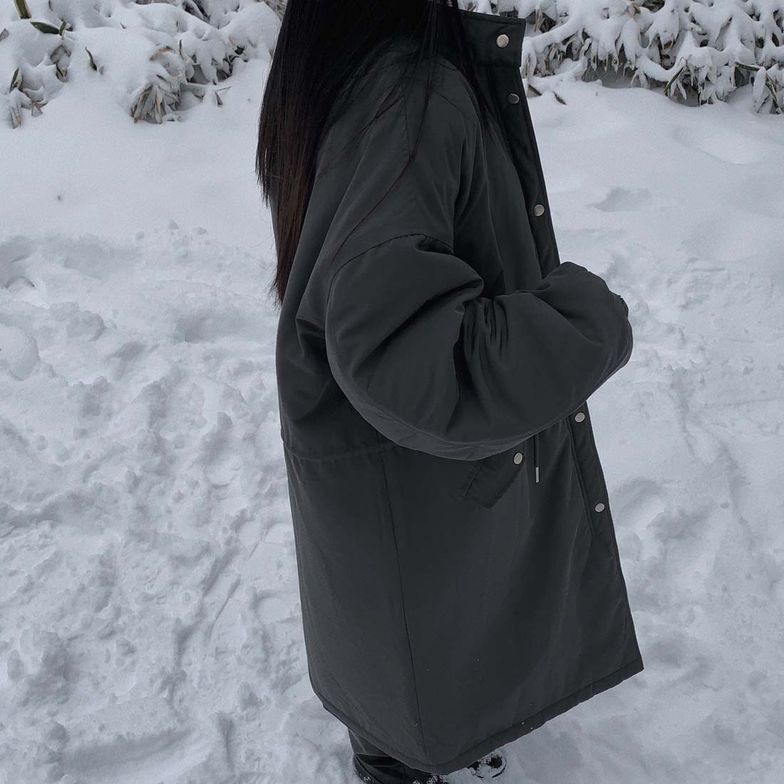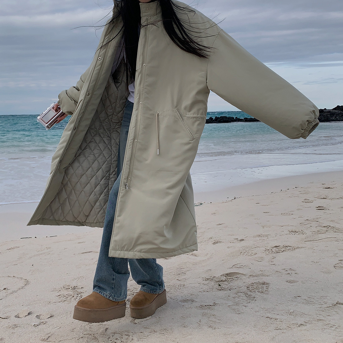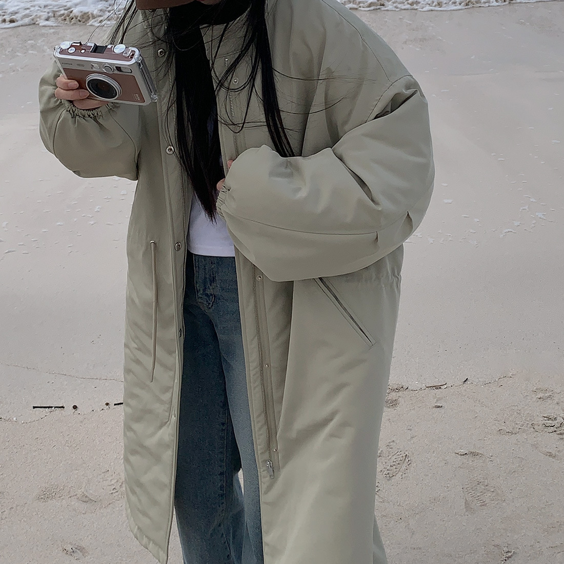 韓国のchic冬の怠惰な風の工装パーカーのゆったりした大きいものは縄の立襟の綿入れの保温の綿入れの長いコートを引き出します。