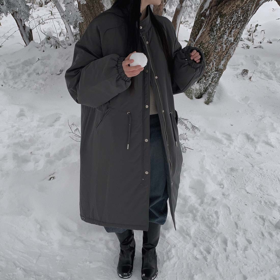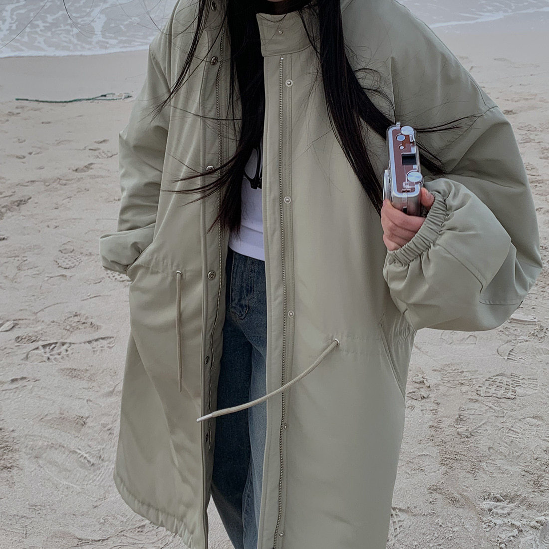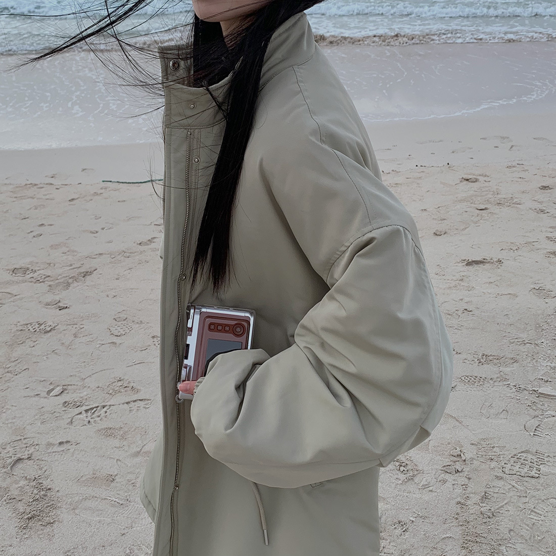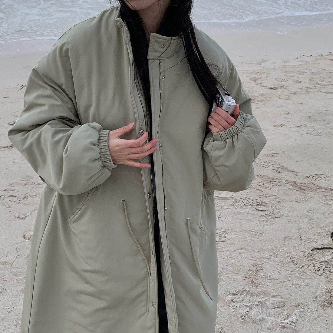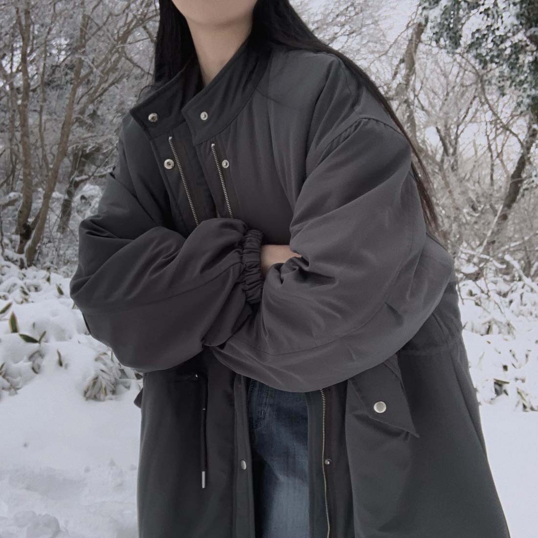 韓国のchic冬の怠惰な風の工装パーカーのゆったりした大きいものは縄の立襟の綿入れの保温の綿入れの長いコートを引き出します。