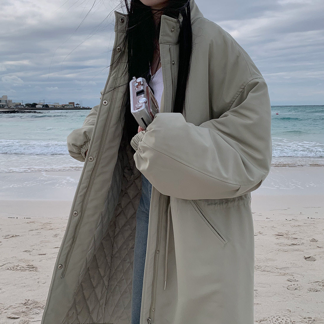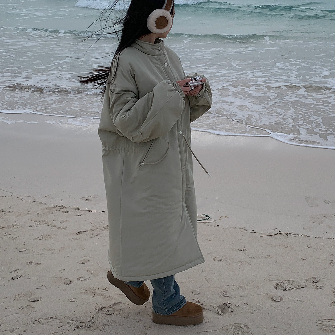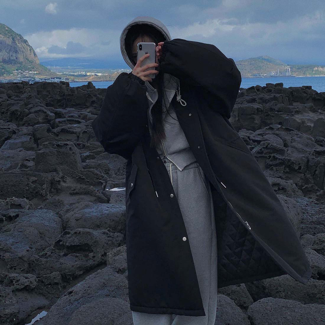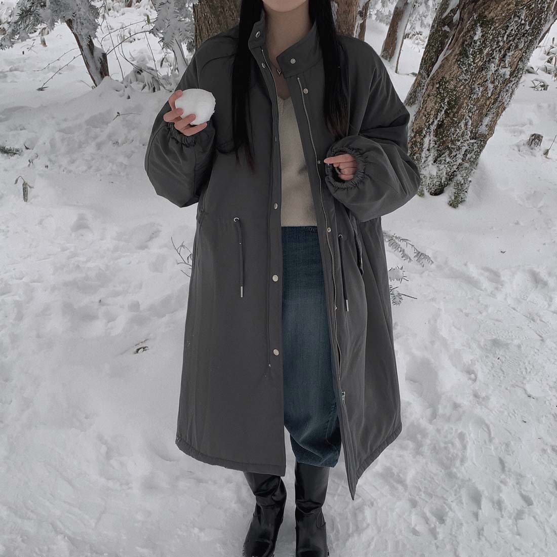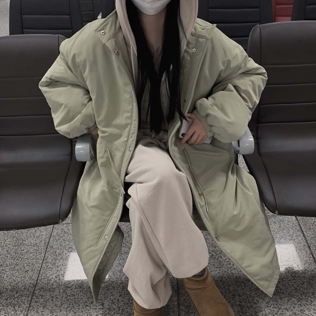 韓国のchic冬の怠惰な風の工装パーカーのゆったりした大きいものは縄の立襟の綿入れの保温の綿入れの長いコートを引き出します。