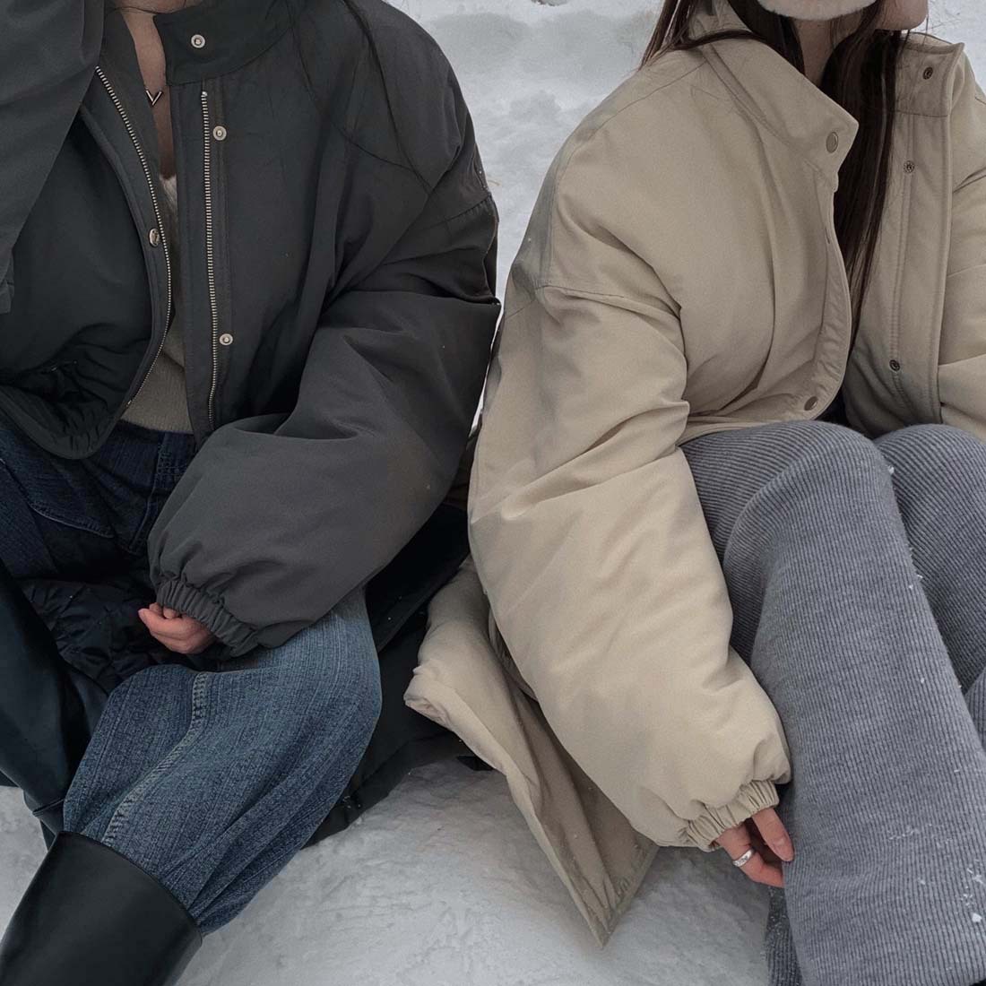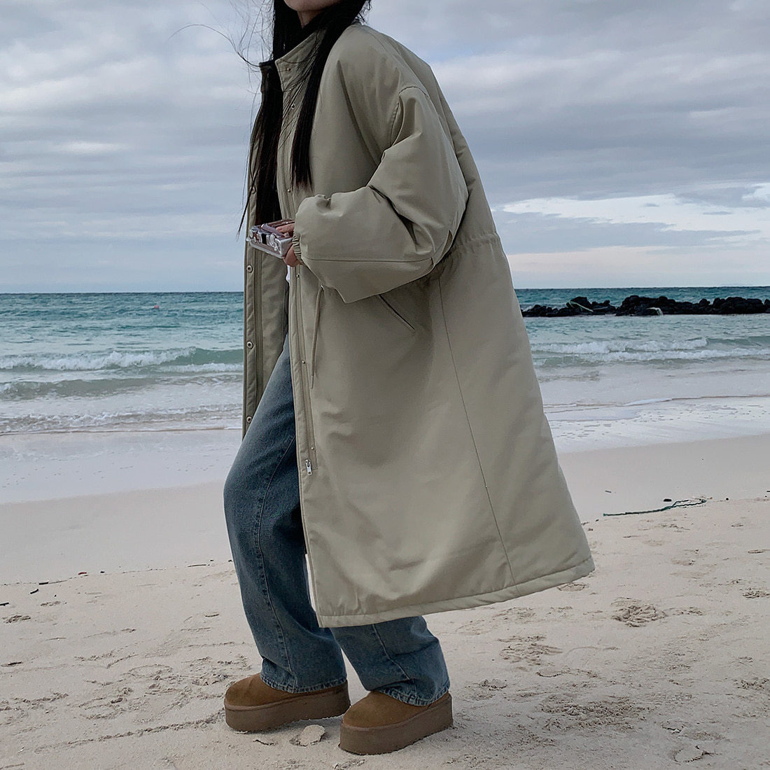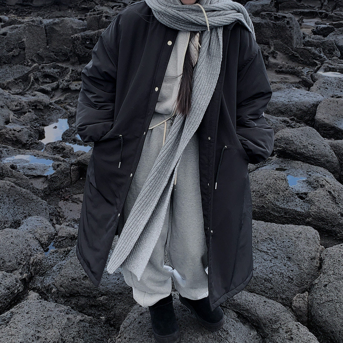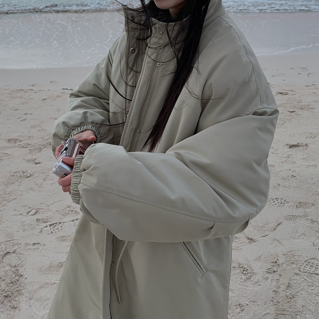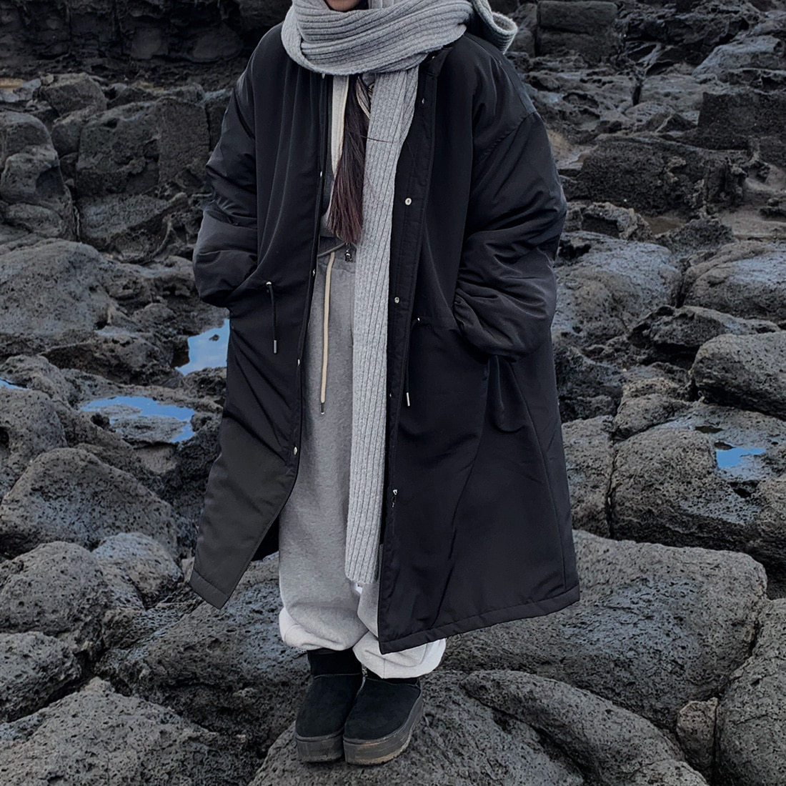 韓国のchic冬の怠惰な風の工装パーカーのゆったりした大きいものは縄の立襟の綿入れの保温の綿入れの長いコートを引き出します。