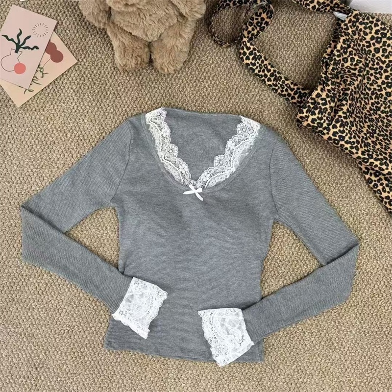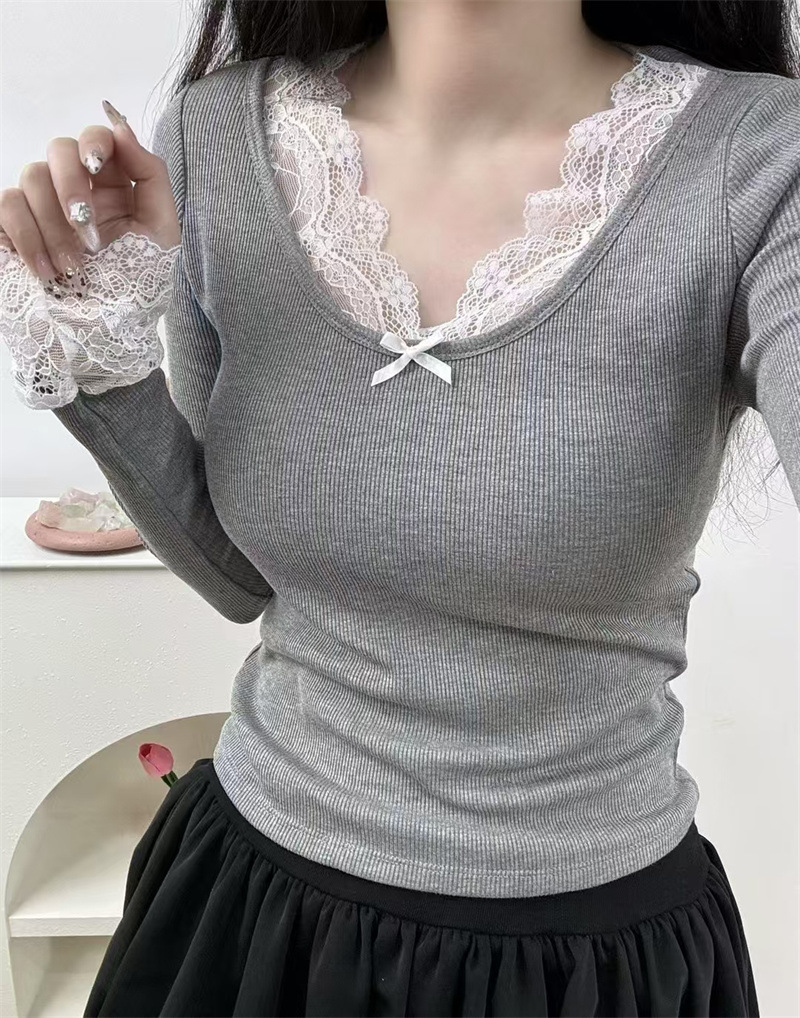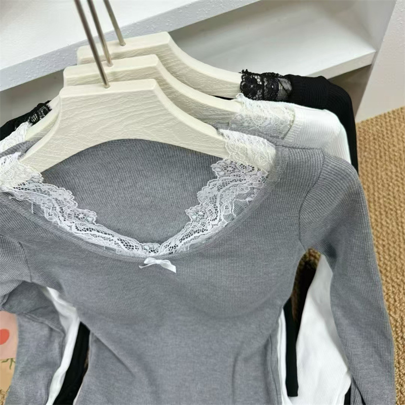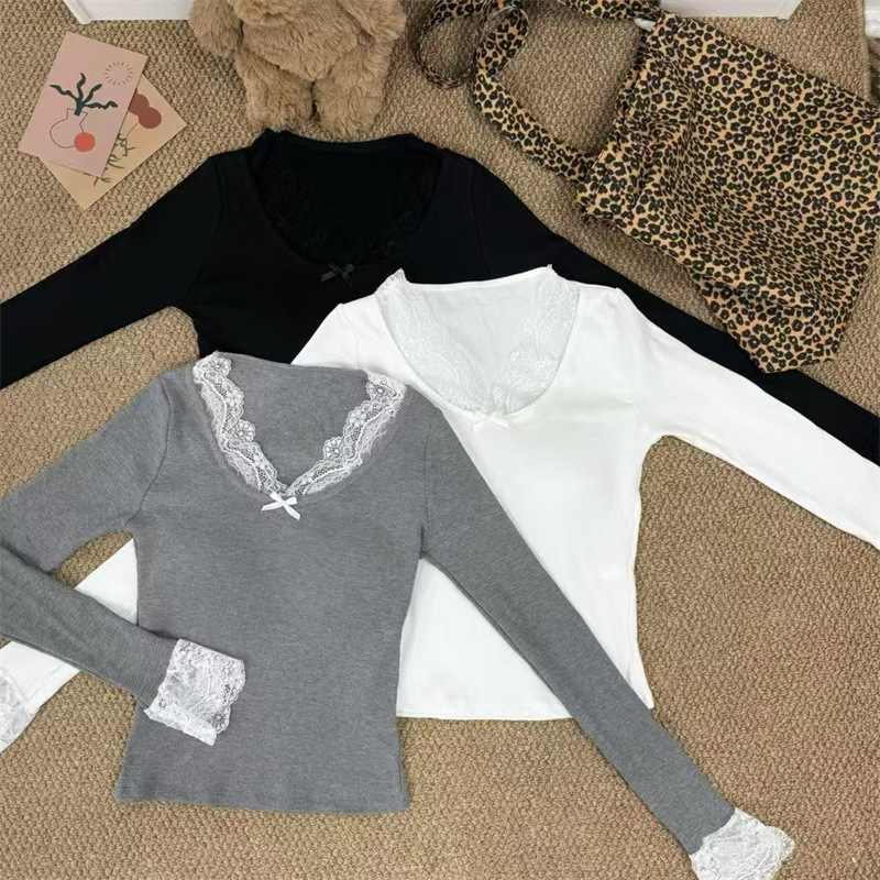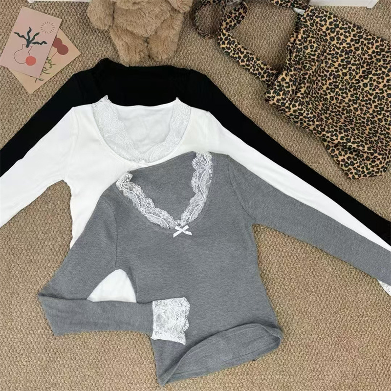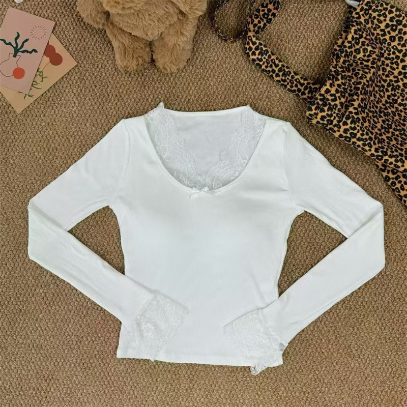 白い優しい風レース長袖tシャツの女性2024秋冬の暖かい毛磨きの中に上着を着る