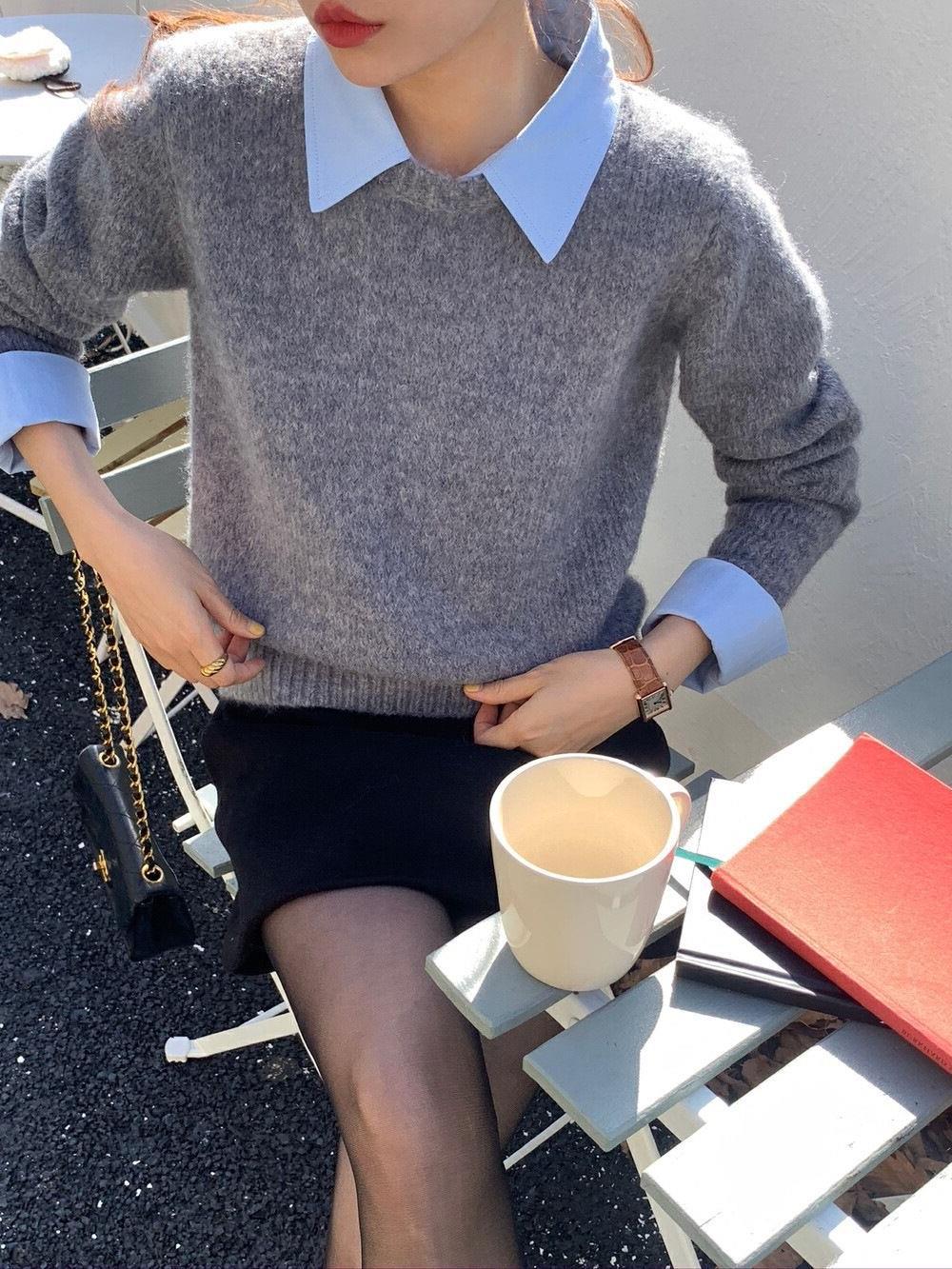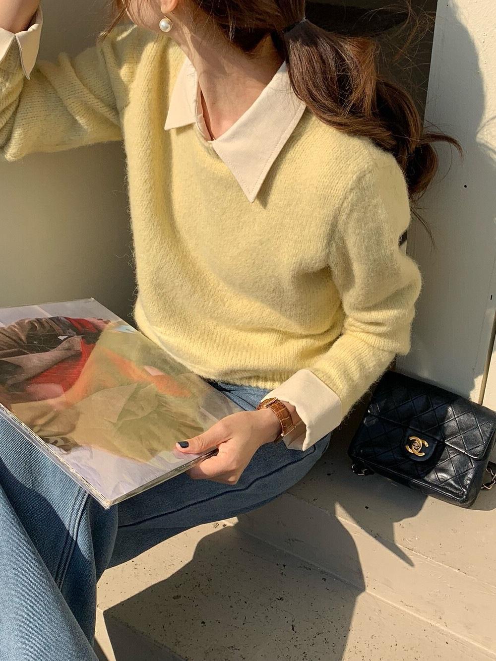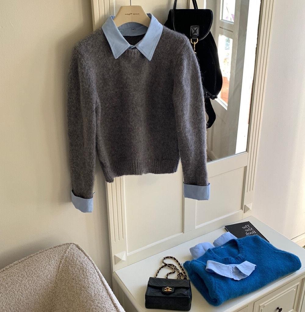韓国系の偽のシャツの襟のセーターの女性の秋冬の新型の中で怠惰な風が色の襟のニットの上着の女性にぶつかります。