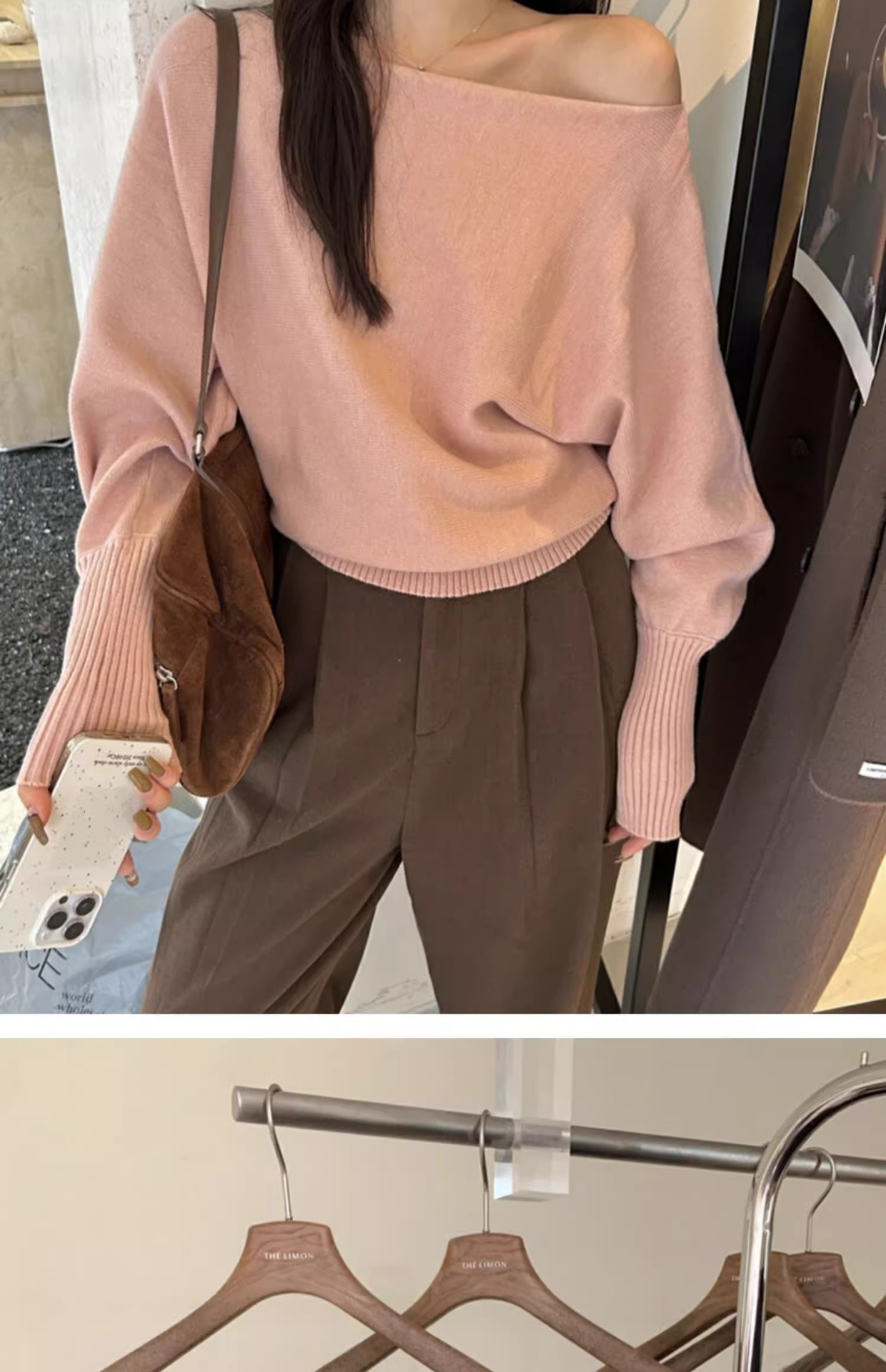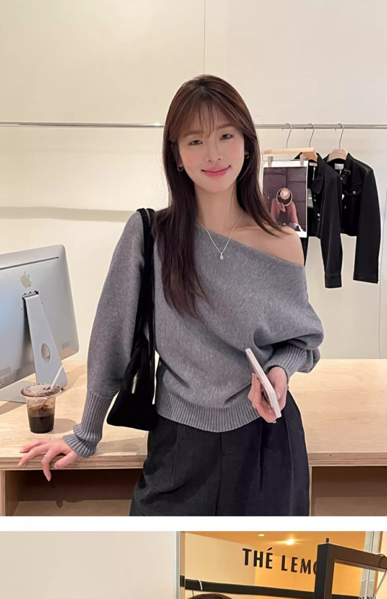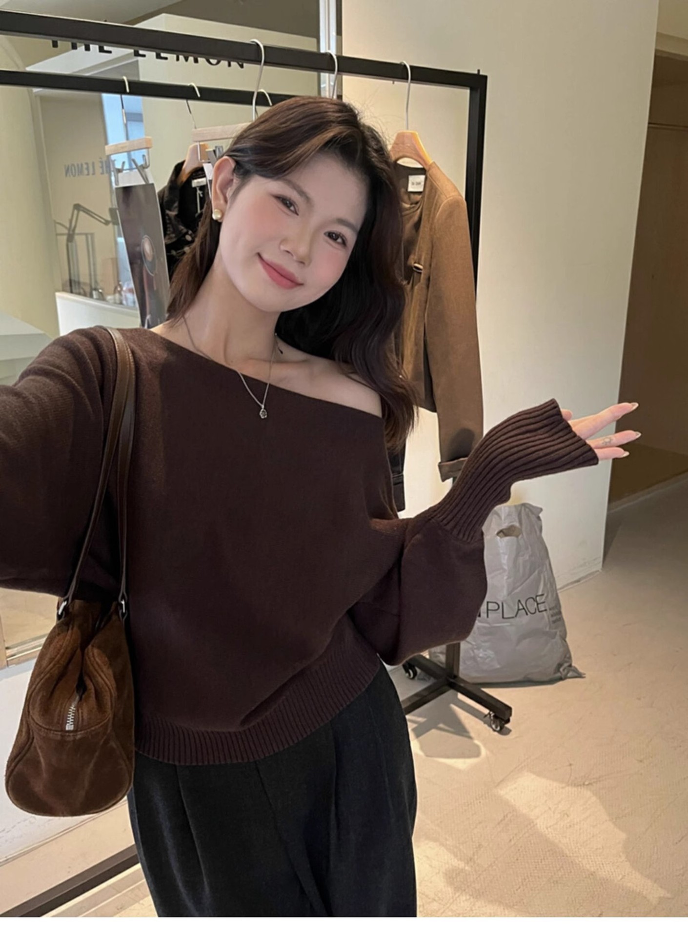カーキ色の心機純欲風一字肩露肩ニット女性秋の高級感怠惰なセーターの中に上着を着る