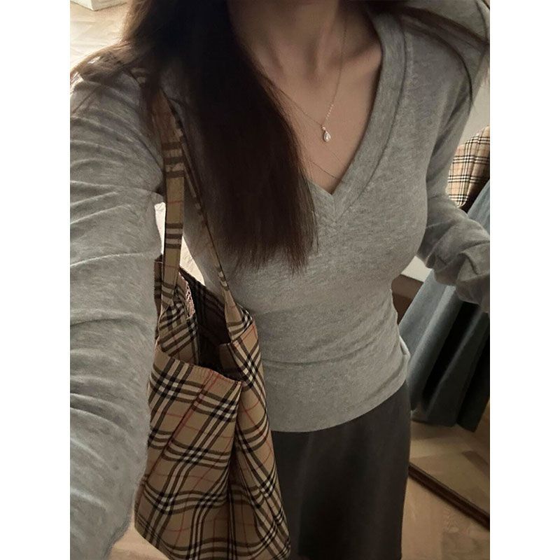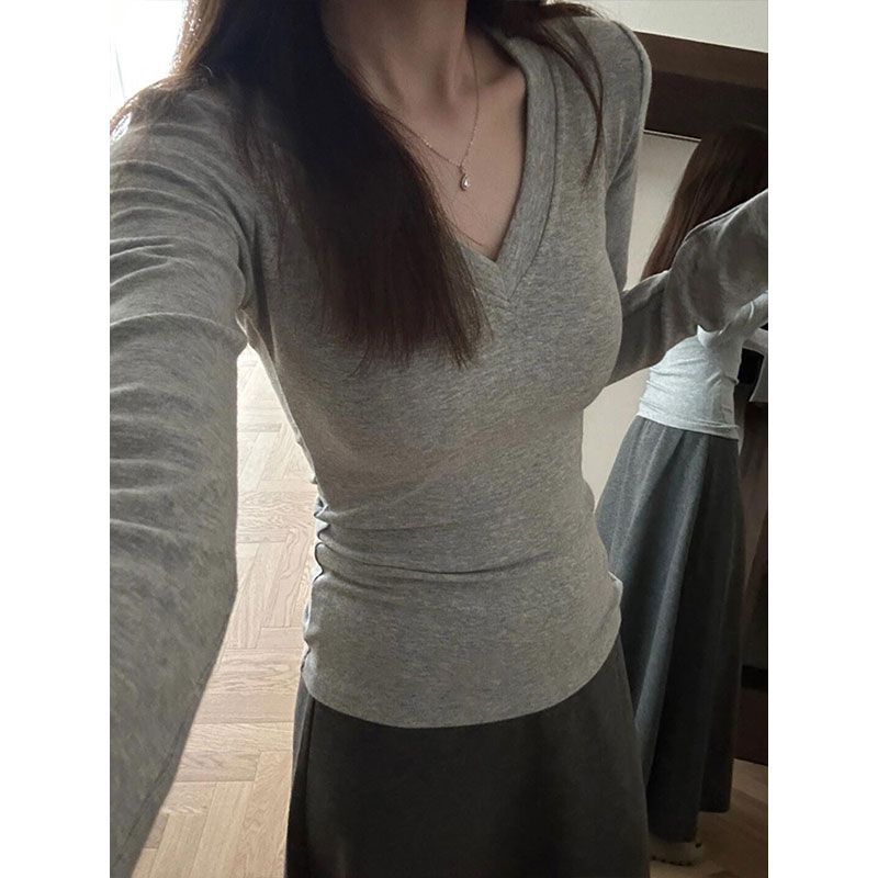 純粋な欲の灰色のvネックの正肩の長袖のtシャツの女性の秋冬の中で底のシャツを掛けて基礎の項のギャルのタイツの上着を修理します。