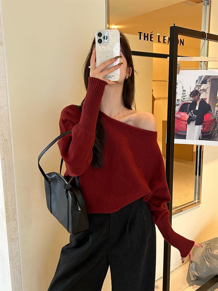 柔らかいピンクの不規則な長袖の斜めの肩のセーターの女性の秋冬の新型の修身の美しい露肩のchiのニットの上着