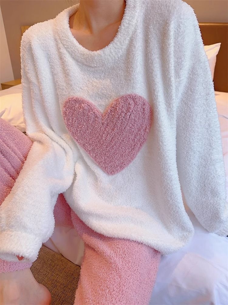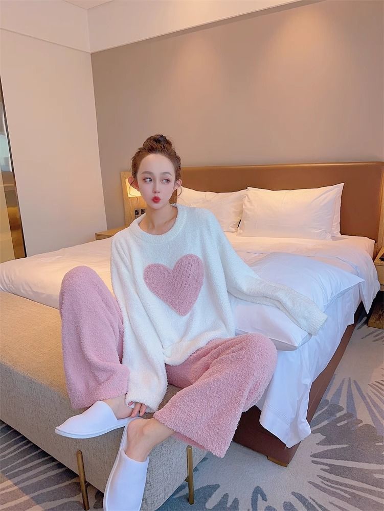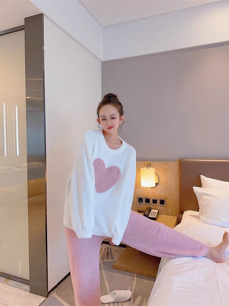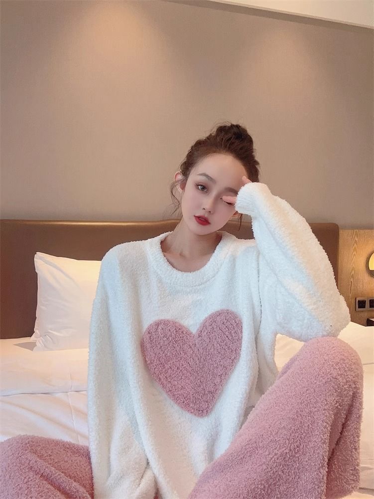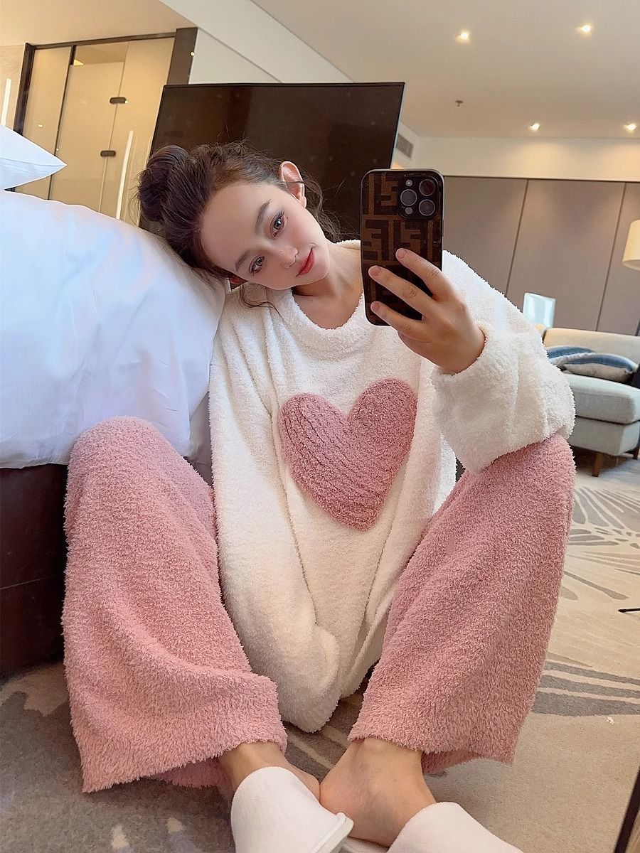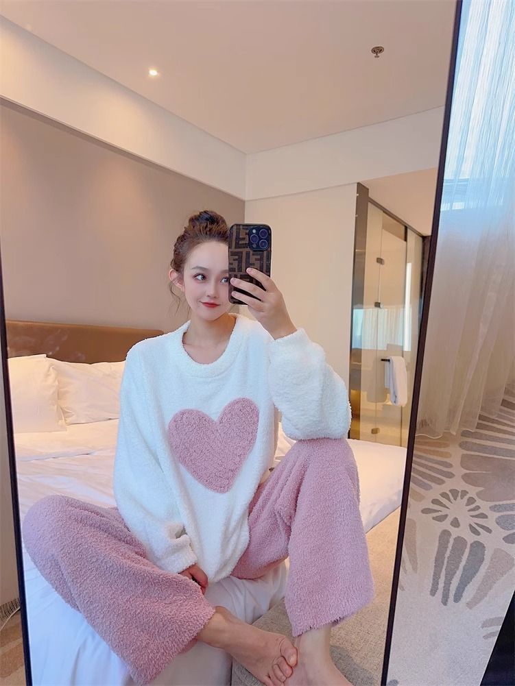 ハート型のサンゴのパジャマの女性の冬の厚いベルベットの保温の甘い愛の高級感の大きいサイズの家庭服のスーツ
