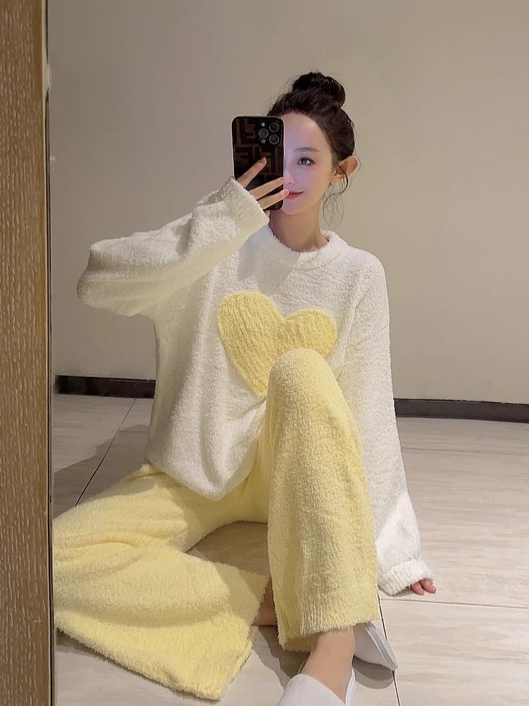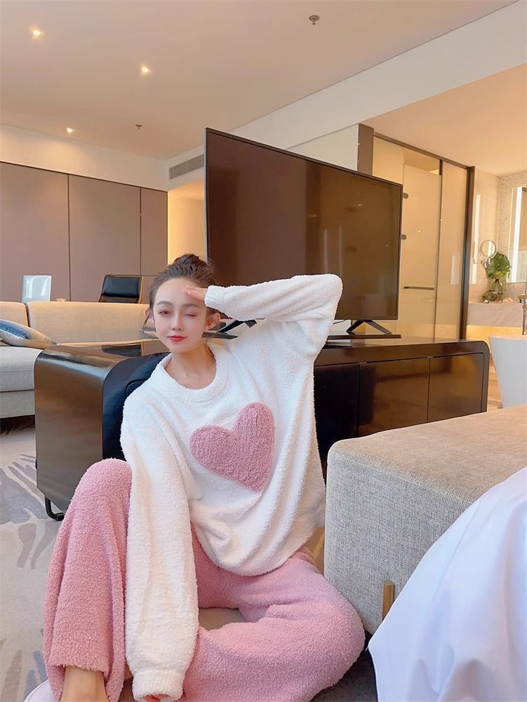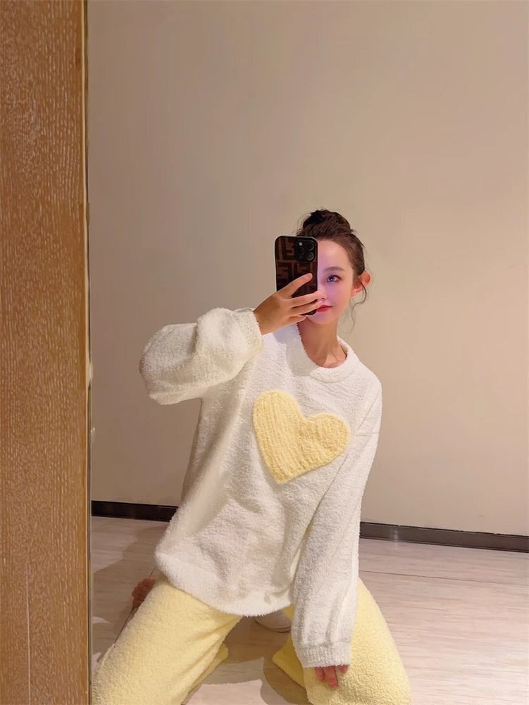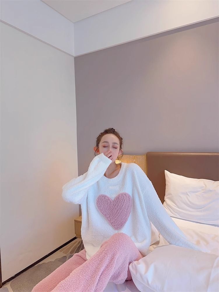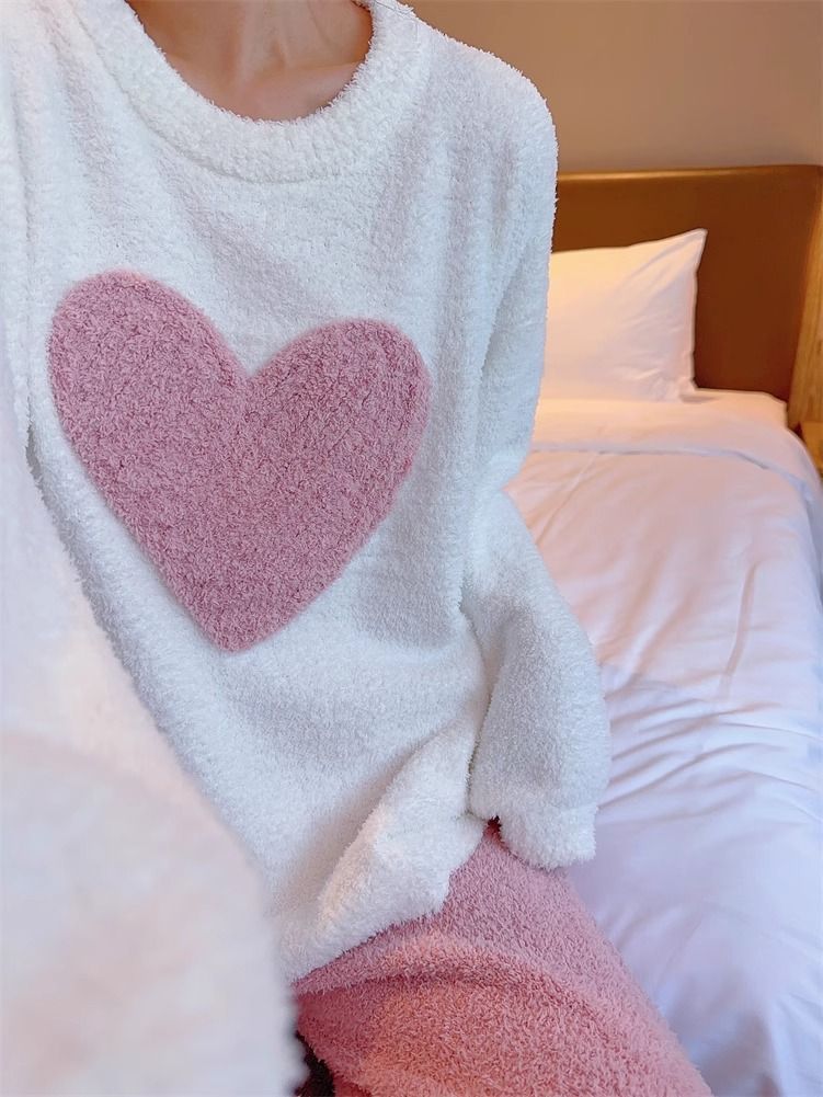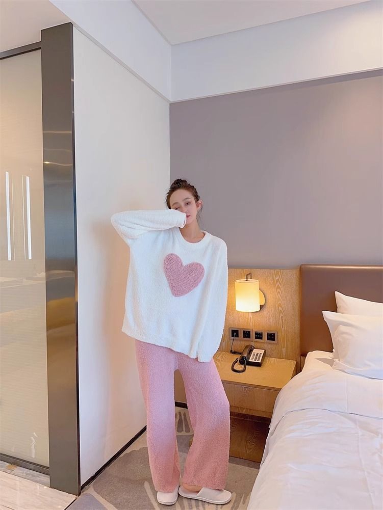 ハート型のサンゴのパジャマの女性の冬の厚いベルベットの保温の甘い愛の高級感の大きいサイズの家庭服のスーツ